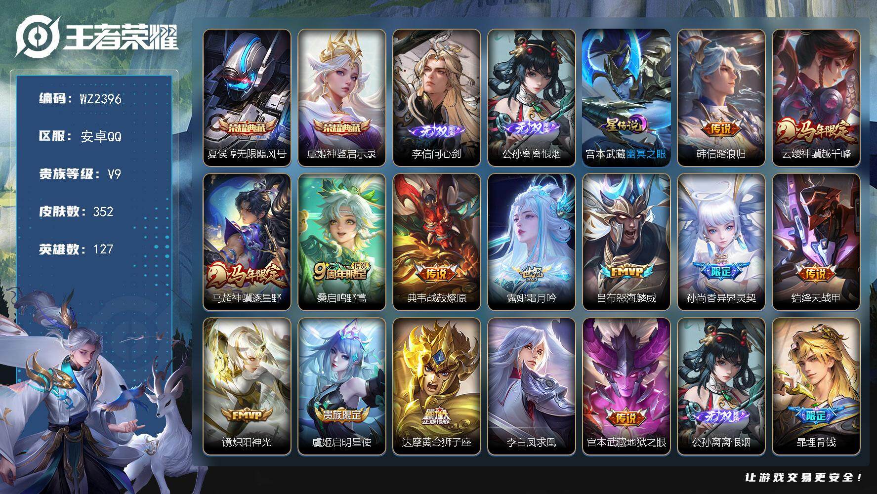 - [12946548]安卓Q-V6-至尊星耀III段位-124英雄-186皮肤-1典藏-4传说-52史诗 【英雄全皮】:影全皮 【荣耀典藏】:花木兰九霄神辉 【传说皮肤】:虞姬愿照岁时盈,云缨幻光神枪,桑启鸣野蒿,干将莫邪久胜战神 【限定皮肤】:姜子牙天穹之誓,杨戬破阵退雄兵,狄仁杰阴阳师,赵云皇家上将,嬴政白昼王子,鲁班七号狮舞东方,吕布猎兽之王,周瑜赤莲之焰,夏侯惇朔风刀,曹操天狼征服者,典韦穷奇,马可波罗暗影游猎,狄仁杰魔术师,狄仁杰万华元夜,达摩沙漠行僧,项羽海滩派对,老夫子醍醐杖,程咬金演武夺筹,韩信飞衡,兰陵王驯魔猎人,后羿如梦令,钟馗神迹守卫,钟馗驱傩正仪,干将莫邪冰霜恋舞曲,雅典娜单词大作战,蔡文姬繁星吟游,鬼谷子原初探秘者,黄忠烈魂,百里玄策原初追逐者,弈星混沌棋,明世隐疑决卦,裴擒虎天狼狩猎者,裴擒虎李小龙,狂铁御狮,米莱狄御霄,盾山御銮,猪八戒西部大镖客,上官婉儿天狼绘梦者,鬼谷子天穹祈灯,姬小满妄想食味,沈梦溪龙舞盛年,刘邦剑破天穹,程咬金群星魔术团,镜青焰无极,项羽苍威无极,周瑜熔金海岸 【年限皮肤】:韩信飞衡,黄忠烈魂 【赛季限定】:夏侯惇朔风刀,典韦穷奇,狄仁杰万华元夜,达摩沙漠行僧,老夫子醍醐杖,程咬金演武夺筹,钟馗驱傩正仪,鬼谷子原初探秘者,百里玄策原初追逐者,弈星混沌棋,明世隐疑决卦,狂铁御狮,米莱狄御霄,盾山御銮,鬼谷子天穹祈灯,刘邦剑破天穹,姜子牙天穹之誓 【战令限定】:嬴政白昼王子,鲁班七号狮舞东方,吕布猎兽之王,周瑜赤莲之焰,马可波罗暗影游猎,兰陵王驯魔猎人,钟馗神迹守卫,雅典娜单词大作战,猪八戒西部大镖客,镜青焰无极,项羽苍威无极 【史诗皮肤】:阿轲暗夜猫娘,赵云皇家上将,赵云未来纪元,甄姬冰雪圆舞曲,狄仁杰魔术师,廉颇地狱岩魂,宫本武藏鬼剑武藏,孙尚香水果甜心,嬴政暗夜贵公子,妲己女仆咖啡,墨子金属风暴,吕布圣诞狂欢,曹操幽灵船长,吕布末日机甲,张飞乱世虎臣,花木兰水晶猎龙者,刘邦德古拉伯爵,兰陵王暗隐猎兽者,诸葛亮黄金分割率,亚瑟心灵战警,百里守约特工魅影,铠曙光守护者,刘禅天才门将,李元芳逐浪之夏,白起星夜王子,阿轲节奏热浪,嬴政白昼王子,孙策猫狗日记,干将莫邪冰霜恋舞曲,伽罗箭羽风息,裴擒虎天狼狩猎者,鲁班七号狮舞东方,狄仁杰鹰眼统帅,兰陵王驯魔猎人,曹操天狼征服者,蔡文姬繁星吟游,韩信飞衡,后羿如梦令,黄忠烈魂,上官婉儿天狼绘梦者