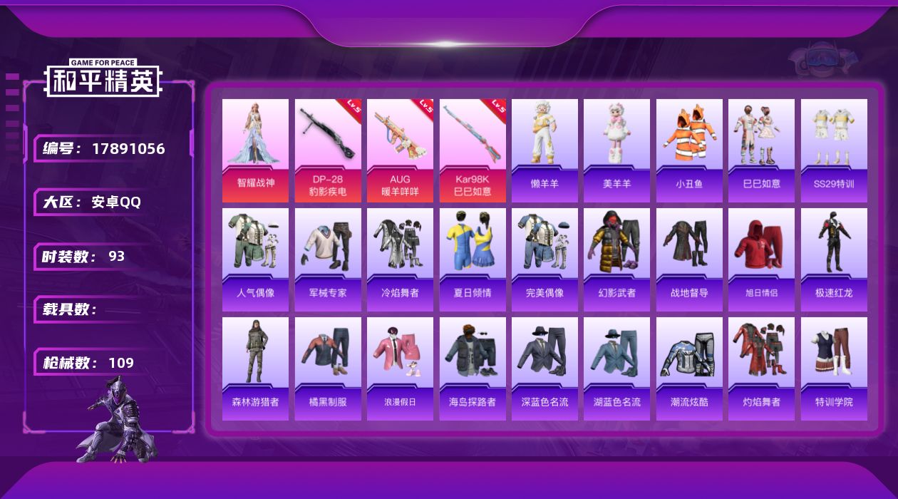[17891056]安卓 手Q-1粉装-5特效枪-0载具-0粉色飞行器-27298热力值-2王牌印记-93套装-109枪皮 【热门品类】:套装-小丑鱼 【粉色套装】:角色-智耀战神 【粉色枪皮等级】:AUG-暖羊咩咩(五级),Kar98K-巳巳如意(五级),Mk14-福马献瑞(五级),AA12-G-萌骑幻想(三级),DP-28-豹影疾电(五级) 【粉色枪皮】:AUG-暖羊咩咩,Kar98K-巳巳如意,Mk14-福马献瑞,AA12-G-萌骑幻想,DP-28-豹影疾电 【粉色降落伞】:炫光之旅降落伞,智耀战神降落伞,炫彩糖果降落伞 【稀有套装】:套装-巳巳如意,套装-雪国风尚,角色-X,套装-马上有钱,套装-暮夜私语,玩偶服-懒羊羊,玩偶服-美羊羊,套装-雨过天青,套装-红釉青花 【稀有枪皮】:AKM-破晓战魂,AKM-龙的传人,M16A4-幻世战舞者,SCAR-L-夜灯,M416-红色方程式,M416-蓝色火焰,AUG-天降萌叽,AUG-幻影战神,AUG-耀粉歌者,QBZ-彩虹符号,M762-天降萌叽,M762-彩虹符号,M762-登顶巅峰,G36C-星穹咏叹调,蜜獾-天降萌叽,UMP45-夜灯,UMP45-生命誓言,UMP45-绒宝小鹅,Vector-生命誓言,汤姆逊-幻影战神,汤姆逊-炫彩节奏,汤姆逊-耀粉歌者,汤姆逊-像素花束,P90-巳巳如意,Kar98K-幻影战神,M24-炫彩节奏,SKS-炫彩节奏,AMR-鬼刀,S686-红色方程式,S686-巳巳如意,S12K-破晓战魂,S12K-夜灯,M249-破晓战魂,M249-糯团青竹,DP-28-彩虹符号,短管霰弹-星穹咏叹调,蝎式手枪-六号稻草人,突击盾牌-绝对恒星,破片手榴弹-巳巳如意 【其他套装】:套装-SS29特训,套装-人气偶像,套装-军械专家,套装-冷焰舞者,套装-夏日倾情,套装-完美偶像,套装-幻影武者,套装-战地督导,套装-旭日情侣,套装-极速红龙,套装-森林游猎者,套装-橘黑制服,套装-浪漫假日,套装-海岛探路者,套装-深蓝色名流,套装-湖蓝色名流,套装-潮流炫酷,套装-灼焰舞者,套装-特训学院,套装-猎鹰,套装-猛禽,套装-王牌教练,套装-白熊同盟,套装-白色伏地魔,套装-破晓战魂,套装-破蛋小黄鸡,套装-竞技名士,套装-竞技达人朋克,套装-红色运动,套装-绮丽涂鸦,套装-缤纷果语,套装-蓝彩潮人,套装-蓝色运