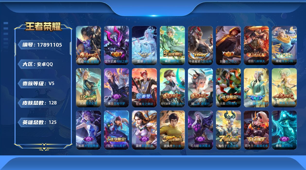 - [17302696]安卓WX-V7-至尊星耀V段位-128英雄-246皮肤-1典藏皮肤-8传说-81史诗-中路54段-1星传说 【荣耀典藏】:虞姬神鉴启示录 【传说皮肤】:女娲愿照千秋盛,桑启鸣野蒿,貂蝉曦玄引,孙尚香乘龙问璇玑,西施游龙清影,李信一念神魔,梦奇胖达荣荣,貂蝉仲夏夜之梦 【限定皮肤】:蒙犽顽岩魄,蔡文姬夏日便利店,大乔绒语心约,虞姬夏日便利店,姜子牙天穹之誓,狄仁杰阴阳师,赵云皇家上将,嬴政优雅恋人,钟无艳超时空战士,扁鹊奇幻香踪,白起夜都怪侠,芈月幻夜卜梦,甄姬落雪兰心,马可波罗山海玄木吟,狄仁杰魔术师,达摩沙漠行僧,项羽海滩派对,貂蝉逐梦之音,兰陵王金庭之子,李元芳云中旅人,杨玉环遇见飞天,杨玉环寅虎心曲,杨戬潮玩骑兵,干将莫邪胡桃夹子,雅典娜黎明之约,鬼谷子五谷丰年,黄忠火炮绅士,百里玄策原初追逐者,百里守约朱雀志,梦奇顽趣,公孙离玉兔公主,沈梦溪大漠名商,沈梦溪匿光破解者,明世隐吟游魔法,裴擒虎擒涛扼浪,瑶山海碧波行,云中君纤云弄巧,上官婉儿天狼绘梦者,嫦娥拒霜思,嫦娥暖冬兔眠,西施玲珑珍味,鲁班大师探海日志,桑启海盐诗旅,暃星界游侠,戈娅驭风魔法,艾琳女武神,阿古朵江河有灵,张良古海寻踪,蒙犽百解令,蒙恬荣光圣徽,高渐离燃音魔法,妲己灵卜魔法,鬼谷子天穹祈灯,孙尚香乘龙问璇玑,貂蝉曦玄引,沈梦溪龙舞盛年,鲁班七号蔬乡物语,李元芳蔬乡物语,刘邦剑破天穹,程咬金群星魔术团,周瑜熔金海岸 【年限皮肤】:百里守约朱雀志,杨玉环寅虎心曲,瑶山海碧波行,马可波罗山海玄木吟,孙尚香乘龙问璇玑 【赛季限定】:达摩沙漠行僧,兰陵王金庭之子,张良古海寻踪,李元芳云中旅人,雅典娜黎明之约,百里玄策原初追逐者,梦奇顽趣,沈梦溪大漠名商,裴擒虎擒涛扼浪,鲁班大师探海日志,桑启海盐诗旅,鬼谷子天穹祈灯,蒙恬荣光圣徽,刘邦剑破天穹,姜子牙天穹之誓 【战令限定】:蔡文姬夏日便利店,虞姬夏日便利店,钟无艳超时空战士,扁鹊奇幻香踪,白起夜都怪侠,芈月幻夜卜梦,甄姬落雪兰心,杨戬潮玩骑兵,黄忠火炮绅士,明世隐吟游魔法,嫦娥暖冬兔眠,西施玲珑珍味,暃星界游侠,戈娅驭风魔法,高渐离燃音魔法,妲己灵卜魔法,鲁班七号蔬乡物语,李元芳蔬乡物语 【史诗皮肤】:露娜紫霞仙子,赵云皇家上将,赵云未来纪元,貂蝉圣诞恋歌,甄姬冰雪圆舞曲,王昭君偶像歌手,狄仁杰魔术师,廉颇地狱岩魂,宫本武藏鬼剑武藏,孙尚香水果甜心,