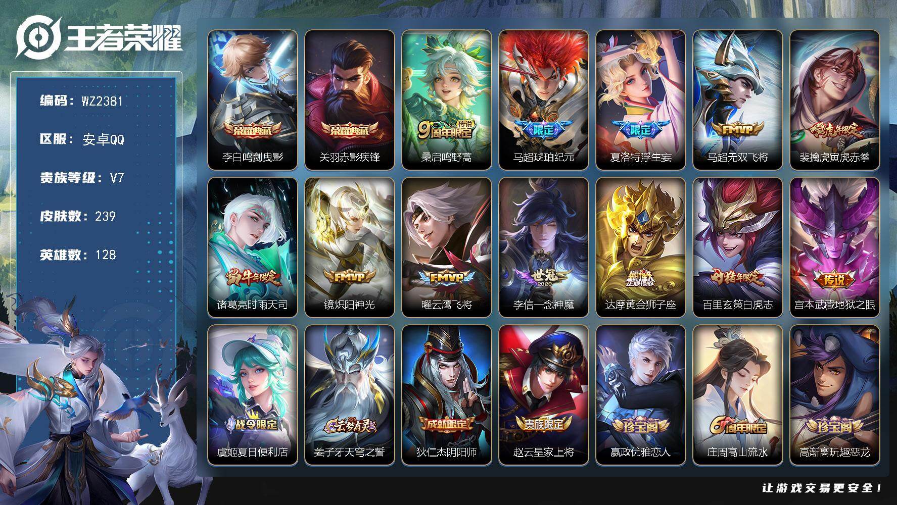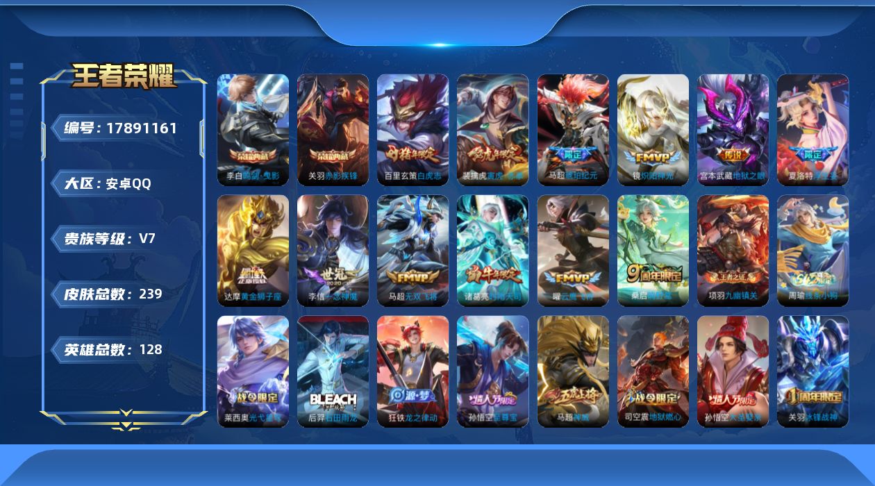- [16326454]【特价出售/店主推荐】安卓Q-V8-至尊星耀V段位-126英雄-330皮肤-1典藏皮肤-10传说-82史诗 【英雄全皮】:达摩全皮,刘邦全皮,孙权全皮,戈娅全皮,空空儿全皮,影全皮 【荣耀典藏】:花木兰九霄神辉 【传说皮肤】:桑启鸣野蒿,曜李逍遥 ,诸葛亮时雨天司,镜炽阳神光,虞姬启明星使,孙悟空零号赤焰,曜云鹰飞将,李信一念神魔,刘备时之恋人,达摩黄金狮子座 【限定皮肤】:狄仁杰阴阳师,赵云皇家上将,赵云引擎之心,赵云百木心枪,墨子神迹守卫,妲己时之奇旅,庄周高山流水,高渐离死亡摇滚,高渐离玩趣恶龙,阿轲迷踪丽影,白起夜都怪侠,芈月幻夜卜梦,吕布御风骁将,周瑜赤莲之焰,元歌云间偶戏,元歌无心,夏侯惇朔风刀,甄姬游园惊梦,典韦蓝屏警告,狄仁杰魔术师,狄仁杰万华元夜,达摩星际陆战队,达摩沙漠行僧,项羽海滩派对,老夫子醍醐杖,老夫子航海奇遇记,程咬金演武夺筹,刘邦夺宝奇兵,韩信傲雪梅枪,兰陵王驯魔猎人,兰陵王金庭之子,亚瑟潮玩骑士王,孙悟空至尊宝,孙悟空零号赤焰,牛魔御旌,后羿如梦令,后羿圣弓游侠,李元芳银河之约,李元芳云中旅人,虞姬启明星使,钟馗驱傩正仪,杨玉环遇见飞天,女娲朔望之晖,干将莫邪胡桃夹子,干将莫邪真爱魔法,雅典娜单词大作战,雅典娜黎明之约,太乙真人华丽摇滚,东皇太一逐梦之光,鬼谷子原初探秘者,鬼谷子五谷丰年,诸葛亮时雨天司,黄忠火炮绅士,苏烈千军破阵,百里玄策原初追逐者,弈星混沌棋,梦奇顽趣,沈梦溪星空之诺,沈梦溪大漠名商,明世隐疑决卦,明世隐吟游魔法,裴擒虎李小龙,裴擒虎擒涛扼浪,狂铁电玩高手,米莱狄御霄,米莱狄胡桃异想国,云中君纤云弄巧,盾山御銮,上官婉儿梁祝,嫦娥如梦令,嫦娥拒霜思,嫦娥暖冬兔眠,曜李逍遥 ,西施玲珑珍味,蒙犽狂想玩偶喵,鲁班大师探海日志,桑启海盐诗旅,暃星界游侠,戈娅驭风魔法,艾琳流音漫舞,司空震地狱燃心,阿古朵江河有灵,张良古海寻踪,蒙恬荣光圣徽,鬼谷子天穹祈灯,刘邦剑破天穹,刘备异域游侠 【年限皮肤】:吕布御风骁将,诸葛亮时雨天司,马超神威 【赛季限定】:夏侯惇朔风刀,狄仁杰万华元夜,达摩沙漠行僧,老夫子醍醐杖,程咬金演武夺筹,兰陵王金庭之子,张良古海寻踪,牛魔御旌,李元芳云中旅人,钟馗驱傩正仪,雅典娜黎明之约,鬼谷子原初探秘者,苏烈千军破阵,百里玄策原初追逐者,弈星混沌棋,梦奇顽趣,沈梦溪大漠名商,明世隐疑决卦,裴擒虎擒涛