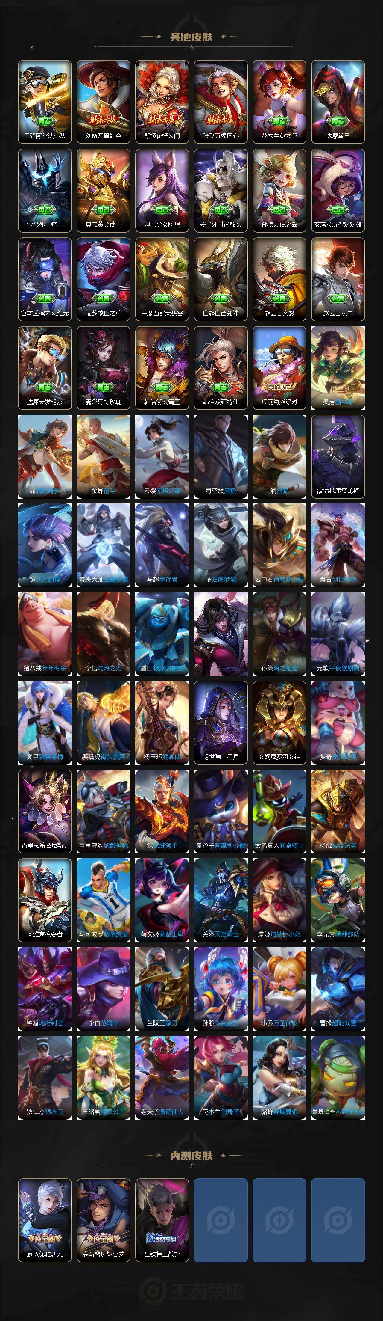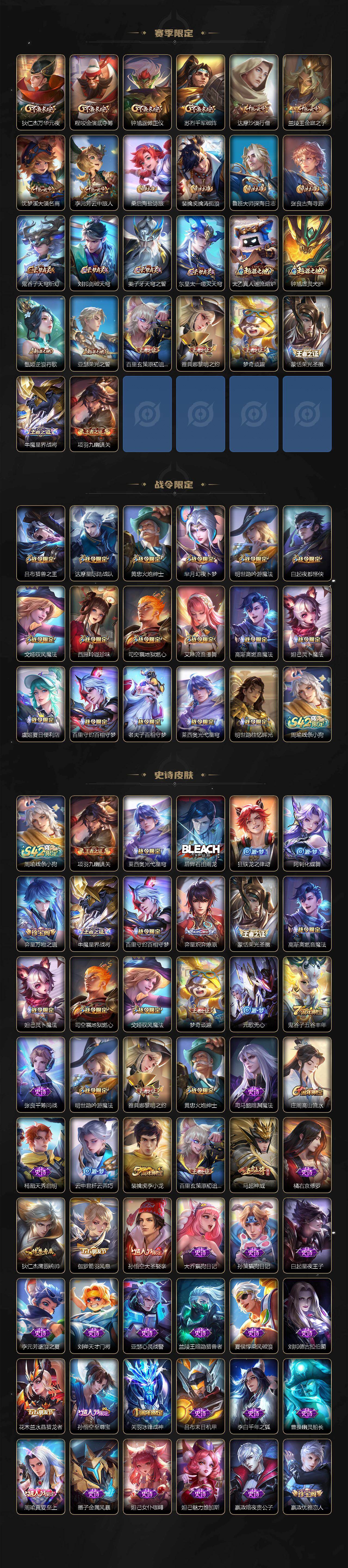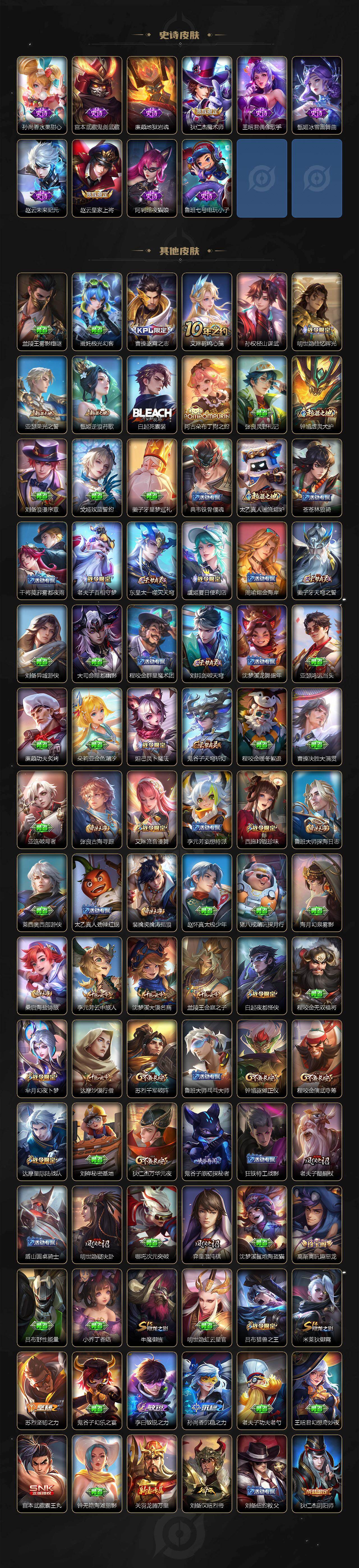 【限定皮肤】:虞姬夏日便利店,姜子牙天穹之誓,狄仁杰阴阳师,赵云皇家上将,嬴政优雅恋人,庄周高山流水,高渐离玩趣恶龙,白起夜都怪侠,芈月幻夜卜梦,吕布猎兽之王,周瑜真爱至上,元歌无心,狄仁杰魔术师,狄仁杰万华元夜,达摩星际陆战队,达摩沙漠行僧,项羽海滩派对,老夫子醍醐杖,关羽冰锋战神,程咬金演武夺筹,兰陵王金庭之子,孙悟空至尊宝,孙悟空大圣娶亲,牛魔御旌,李元芳云中旅人,钟馗驱傩正仪,雅典娜黎明之约,鬼谷子原初探秘者,鬼谷子五谷丰年,诸葛亮时雨天司,黄忠火炮绅士,苏烈千军破阵,百里玄策白虎志,百里玄策原初追逐者,弈星混沌棋,梦奇顽趣,沈梦溪大漠名商,明世隐疑决卦,明世隐吟游魔法,裴擒虎李小龙,裴擒虎寅虎赤拳,裴擒虎擒涛扼浪,米莱狄御霄,云中君纤云弄巧,西施玲珑珍味,鲁班大师探海日志,桑启海盐诗旅,夏洛特浮生妄,戈娅驭风魔法,艾琳流音漫舞,司空震地狱燃心,张良古海寻踪,蒙恬荣光圣徽,高渐离燃音魔法,妲己灵卜魔法,鬼谷子天穹祈灯,马超琥珀纪元,沈梦溪龙舞盛年,刘邦剑破天穹,程咬金群星魔术团,刘备异域游侠,周瑜熔金海岸