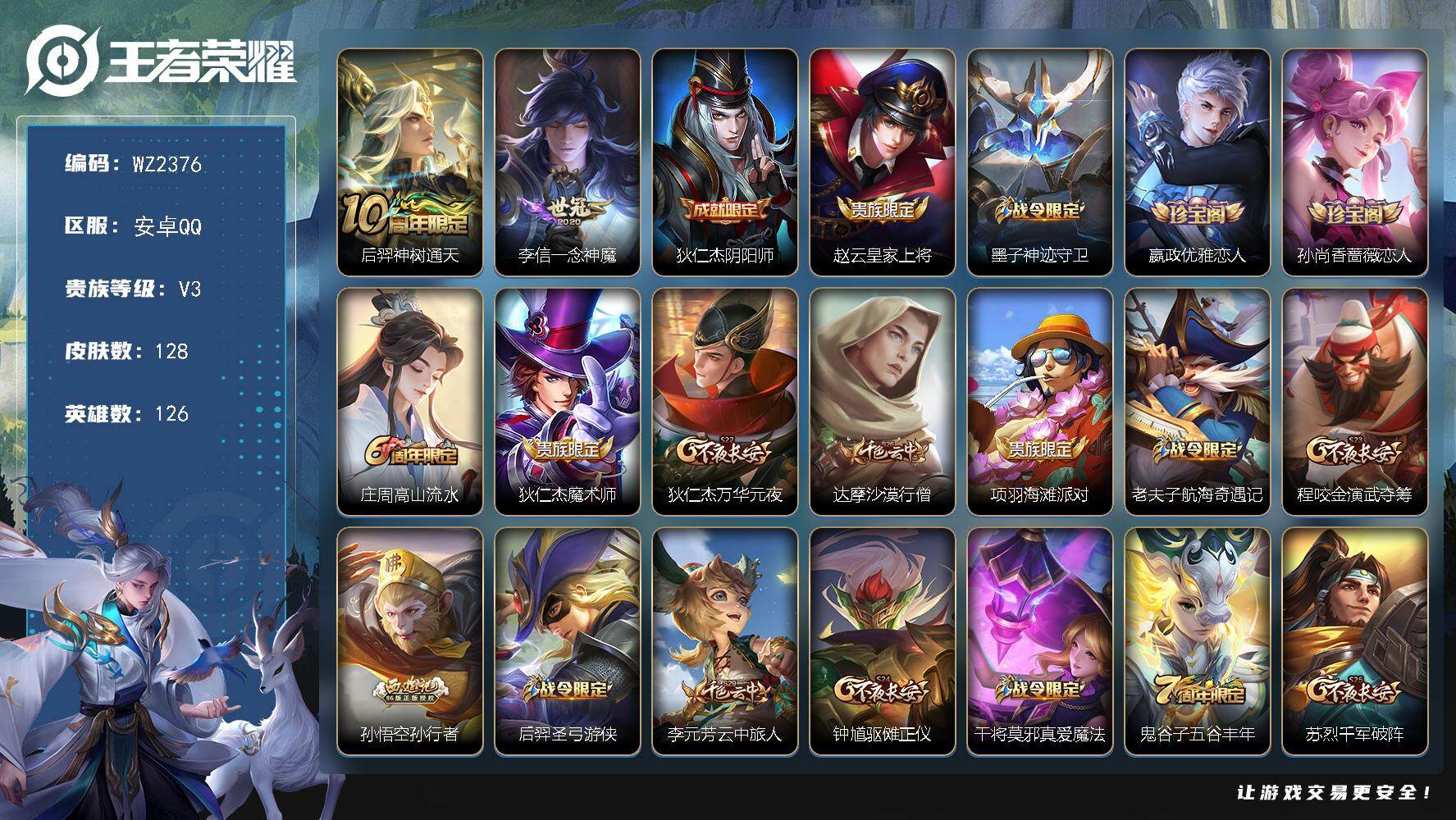 - [17409418]【特价出售/店主推荐】安卓Q-V8-荣耀黄金I段位-128英雄-368皮肤-1典藏皮肤-16传说-89史诗-2星元 【英雄全皮】:孙权全皮,鬼谷子全皮,敖隐全皮,空空儿全皮,影全皮 【荣耀典藏】:孙悟空全息碎影 【传说皮肤】:后羿神树通天,澜愿照九州拓,云缨幻光神枪,桑启鸣野蒿,李信山海炽霜斩,马超无双飞将,西施游龙清影,李元芳飞鸢探春,诸葛亮时雨天司,铠绛天战甲,镜炽阳神光,虞姬启明星使,后羿黄金射手座,貂蝉仲夏夜之梦,孙悟空地狱火,狄仁杰超时空战士 【限定皮肤】:大乔绒语心约,姜子牙天穹之誓,杨戬破阵退雄兵,狄仁杰阴阳师,赵云皇家上将,赵云引擎之心,嬴政白昼王子,孙尚香蔷薇恋人,鲁班七号狮舞东方,鲁班七号乒乒小将,庄周玄嵩,高渐离玩趣恶龙,钟无艳超时空战士,芈月重明,吕布猎兽之王,元歌无心,夏侯惇朔风刀,甄姬落雪兰心,曹操烛龙,典韦穷奇,马可波罗暗影游猎,狄仁杰魔术师,狄仁杰万华元夜,达摩沙漠行僧,项羽海滩派对,老夫子圣诞老人,老夫子醍醐杖,程咬金演武夺筹,露娜一生所爱,兰陵王金庭之子,孙悟空至尊宝,孙悟空大圣娶亲,牛魔御旌,后羿如梦令,李元芳银河之约,李元芳云中旅人,虞姬启明星使,钟馗神迹守卫,钟馗驱傩正仪,雅典娜单词大作战,鬼谷子原初探秘者,鬼谷子五谷丰年,诸葛亮时雨天司,铠青龙志,弈星混沌棋,沈梦溪星空之诺,沈梦溪大漠名商,明世隐疑决卦,裴擒虎李小龙,裴擒虎擒涛扼浪,狂铁御狮,米莱狄御霄,云中君纤云弄巧,李信山海炽霜斩,盾山御銮,猪八戒西部大镖客,嫦娥拒霜思,蒙犽狂想玩偶喵,鲁班大师探海日志,桑启海盐诗旅,艾琳女武神,阿古朵江河有灵,张良古海寻踪,蒙犽百解令,高渐离燃音魔法,妲己灵卜魔法,鬼谷子天穹祈灯,大乔乘龙忆丹青,沈梦溪龙舞盛年,鲁班七号蔬乡物语,李元芳蔬乡物语,刘邦剑破天穹,上官婉儿群星魔术团,程咬金群星魔术团,镜青焰无极,项羽苍威无极,周瑜熔金海岸 【年限皮肤】:铠青龙志,庄周玄嵩,诸葛亮时雨天司,李信山海炽霜斩,大乔乘龙忆丹青,澜愿照九州拓 【赛季限定】:曹操烛龙,芈月重明,典韦穷奇,狂铁御狮,米莱狄御霄,牛魔御旌,盾山御銮,夏侯惇朔风刀,弈星混沌棋,明世隐疑决卦,老夫子醍醐杖,鬼谷子原初探秘者,狄仁杰万华元夜,程咬金演武夺筹,钟馗驱傩正仪,达摩沙漠行僧,兰陵王金庭之子,沈梦溪大漠名商,李元芳云中旅人,桑启海盐诗旅,裴擒虎擒涛扼浪,鲁班大师探