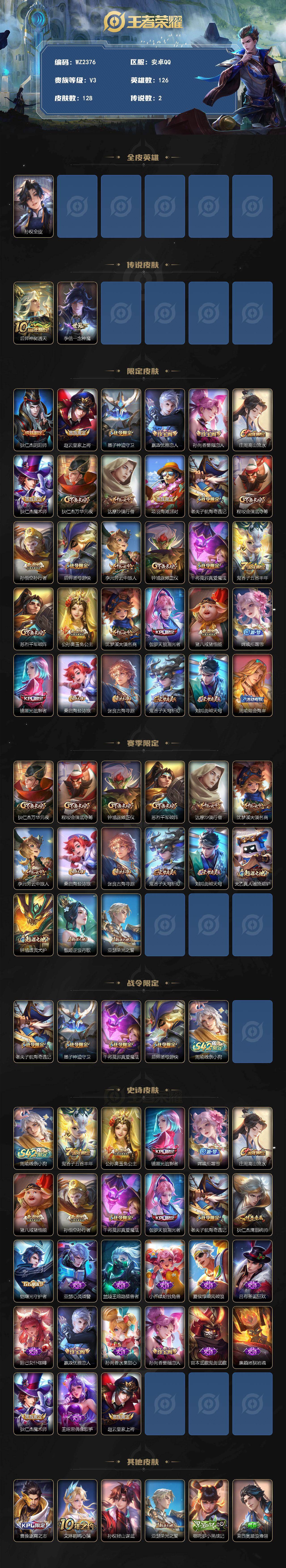 - PX_2108089-实名: 可修改 贵族等级: V6 英雄数: 122 皮肤数: 174 星传说: 金色仲夏夜 传说皮: 仲夏夜之梦 限定皮: 李小龙,游园惊梦,梁祝,凤求凰,美猴王,至尊宝,高山流水,圣诞老人,五谷丰年,鸣野蒿