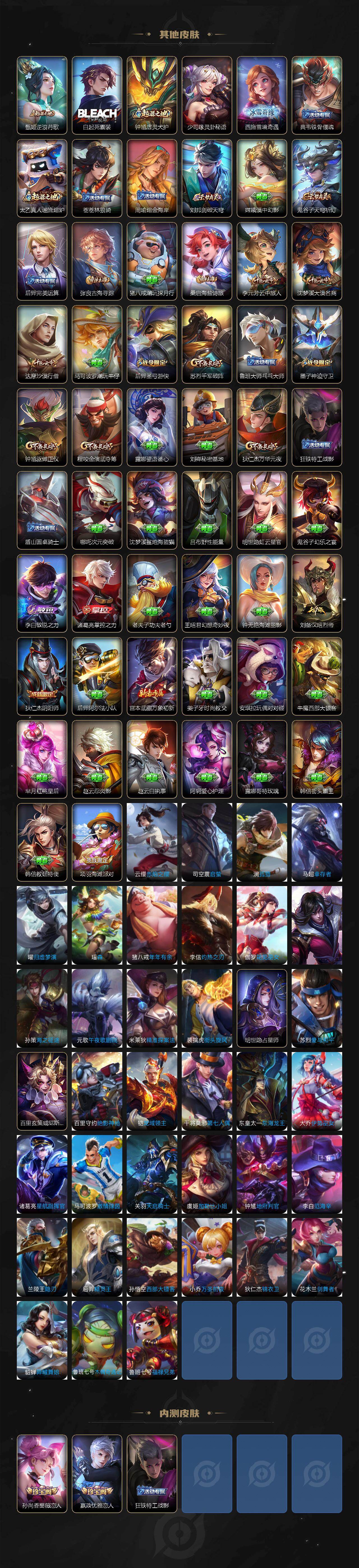 【赛季限定】:狄仁杰万华元夜,程咬金演武夺筹,钟馗驱傩正仪,苏烈千军破阵,达摩沙漠行僧,沈梦溪大漠名商,李元芳云中旅人,桑启海盐诗旅,张良古海寻踪,鬼谷子天穹祈灯,刘邦剑破天穹,太乙真人谧流熔炉,钟馗虚灵犬护,甄姬逆浪荇歌,亚瑟荣光之誓