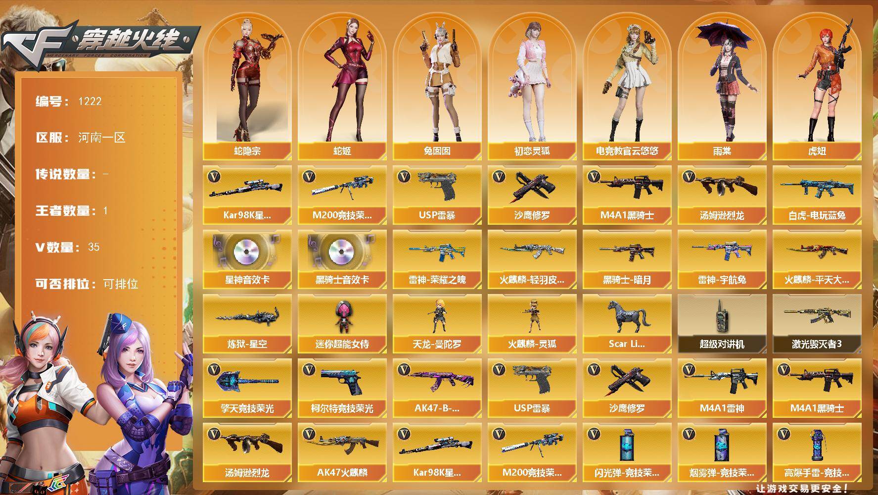 [17893622]河南一区-35V-1王者-0炫金 【热门武器】:M200-竞技荣光,白虎-电玩蓝兔,Kar98K-星神,M4A1-黑骑士,汤姆逊-烈龙*2,USP-雷暴,沙鹰-修罗*4 【音效卡】:M4A1-黑骑士音效卡,Kar98K-星神音效卡 【皮肤】:雷神-荣耀之魄,雷神-宇航兔皮肤,火麒麟-轻羽皮肤,火麒麟-平天大圣,黑骑士-暗月,炼狱-星空 【角色】:雨棠,电竞教官-云悠悠,蛇隐宗,北极狐-X,初恋灵狐,芳心审判者,虎妞,零-水下丽影,麻雀,曼陀罗-X,潘多拉-X,蛇姬,蜀雪,铁骑荣耀,兔囡囡,职业选手 【人偶武器】:天龙-曼陀罗,火麒麟-灵狐,Scar Light-马枪,迷你超能女侍 【暴走生化】:超级对讲机 【挑战大师】:激光毁灭者III 【英雄级武器】:AK47-火麒麟*3,M4A1-雷神*2,M4A1-黑骑士,AK-47-猩红传说*2,AK47-B-常胜将军,王者白虎-觉醒版,白虎-电玩蓝兔,Kar98K-星神,M200-竞技荣光,汤姆逊-烈龙*2,沙鹰-修罗*4,USP-雷暴,柯尔特-竞技荣光*2,擎天-竞技荣光,高爆手雷-竞技荣光*3,高爆手雷-古蛇迷踪,闪光弹-竞技荣光*3,烟雾弹-竞技荣光*3,烟雾弹-古蛇迷踪 【道具】:云山科技背包,炫彩背包,虎牙炫彩背包,绿色巨人,灵魂忍者,迷雾幽灵,夺命之镰,防化服*3,枪王排位29赛季金色流光,蛇隐宗表情,电玩兔兔表情,循环实验表情,EP战队名片,防弹头盔*7,防弹衣*7,C4工具钳*7,手雷包*7 【特殊枪械】:1黑骑士,2烈龙