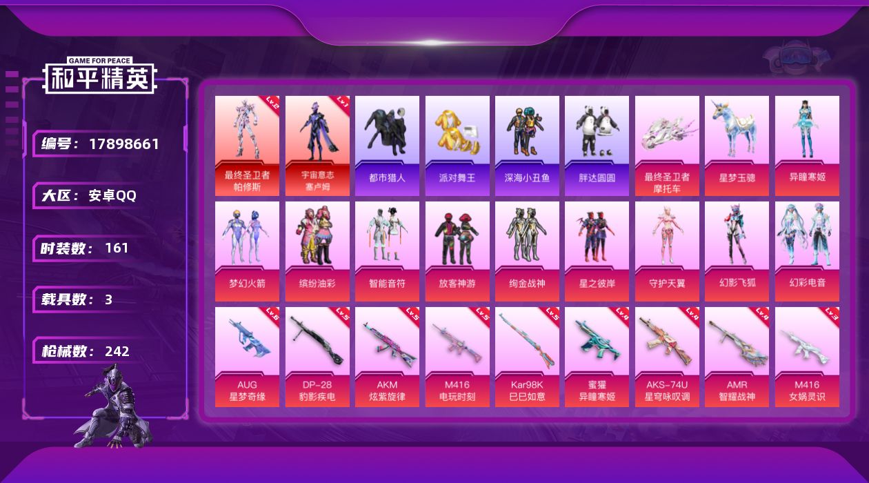 [17898661]安卓 手Q-3神装-11粉装-13特效枪-3载具-9粉色飞行器-87037热力值-8王牌印记-161套装-242枪皮