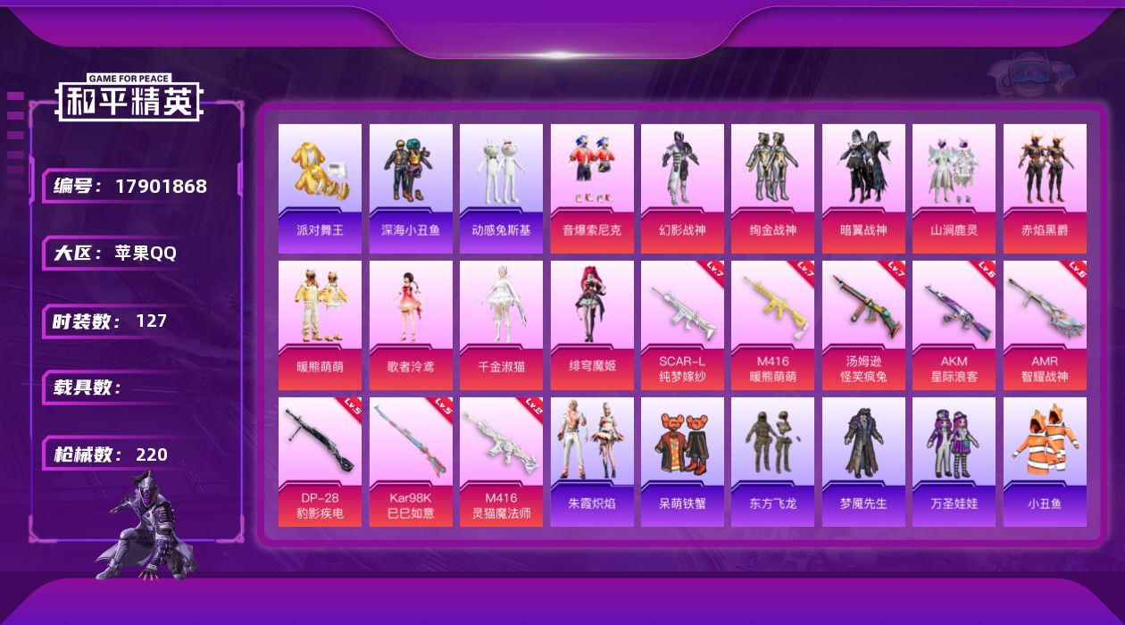 [17901868]【店主推荐捡漏号!可直接换绑】苹果 手Q-10粉装-8特效枪-0载具-3粉色飞行器-67929热力值-9王牌印记-127套装-220枪皮【热门品类】:粉装-音爆索尼克,套装-派对舞王,套装-深海小丑鱼,套装-小丑鱼,套装-动感兔斯基人偶服,套装-粉红小猪,角色-8号机【粉色套装】:粉装-幻影战神,粉装-绚金战神,粉装-暗翼战神,粉装-山涧鹿灵,粉装-赤焰黑爵,粉装-暖熊萌萌,角色-歌者泠鸢,粉装-音爆索尼克,角色-千金淑猫,角色-绯穹魔姬【粉色枪皮等级】:AKM-星际浪客(六级),SCAR-L-纯梦嫁纱(七级),M416-暖熊萌萌(七级),M416-灵猫魔法师(二级),汤姆逊-怪笑疯兔(七级),Kar98K-巳巳如意(五级),AMR-智耀战神(六级),DP-28-豹影疾电(五级)【粉色枪皮】:AKM-星际浪客,SCAR-L-纯梦嫁纱,M416-暖熊萌萌,M416-灵猫魔法师,汤姆逊-怪笑疯兔,Kar98K-巳巳如意,AMR-智耀战神,DP-28-豹影疾电【粉色飞行器】:歌者泠鸢飞行器,幽焰列车飞行器,凤舞九天飞行器