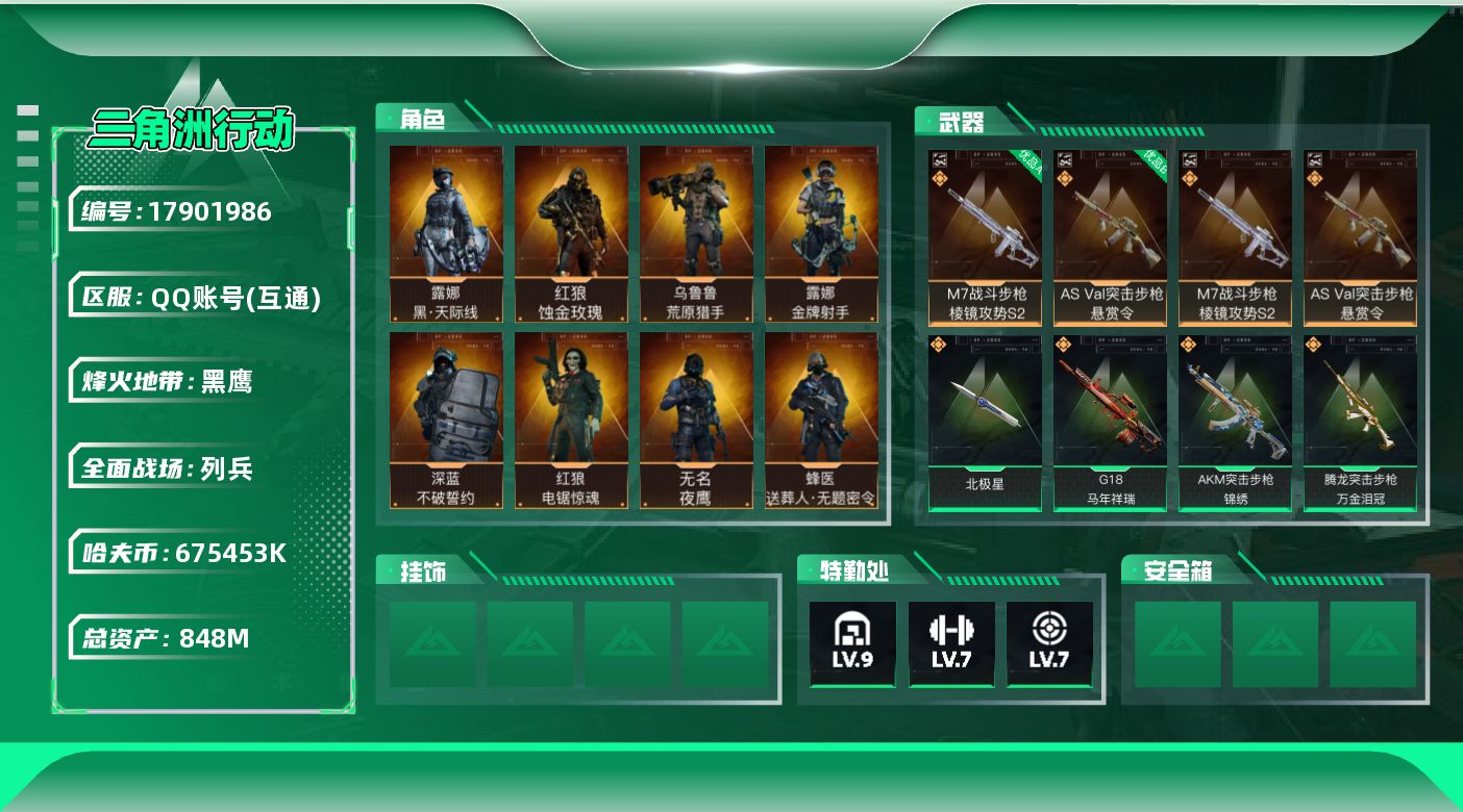 [17901986]【店主推荐捡漏号!可直接换绑】848m总资产-675453k哈夫币-60烽火等级-黑鹰-20战场等级-列兵