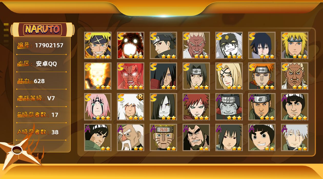 【S级忍者】:宇智波斑「秽土转生」(3星),春野樱「忍界大战」(3星),艾「忍界大战」(3星),宇智波鼬「须佐能乎」(3星),宇智波止水「须佐能乎」(3星),艾「四代目雷影」(3星),自来也「舞之豪杰」(3星),大蛇丸(3星),纲手「百豪」(3星),波风水门(3星),漩涡鸣人「九喇嘛连结」(3星),迈特凯「死门」(3星),佩恩「天道」(3星),宇智波佐助「永恒万花筒」(3星),大筒木桃式(3星),漩涡鸣人「暴怒·第六尾」(3星),漩涡鸣人·宇智波佐助(3星)