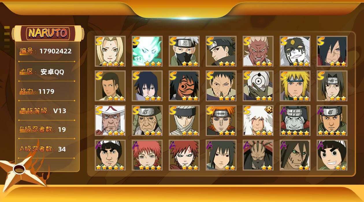 【S级忍者】:猿飞日斩「秽土转生」(3星),宇智波斑「秽土转生·解」(3星),宇智波带土「忍界大战」(3星),艾「忍界大战」(3星),宇智波鼬「须佐能乎」(3星),宇智波止水「须佐能乎」(3星),旗木卡卡西「须佐能乎」(3星),千手柱间「木叶创立」(3星),无「二代目土影」(3星),自来也「舞之豪杰」(3星),纲手(4星),猿飞日斩(3星),波风水门(3星),神秘面具男「红夜之刃」(3星),佩恩「天道」(3星),宇智波佐助「永恒万花筒」(3星),宇智波斑 「白面具」(3星宇智波斑「白面具」),大筒木桃式(3星),大筒木舍人「最终章」(3星)