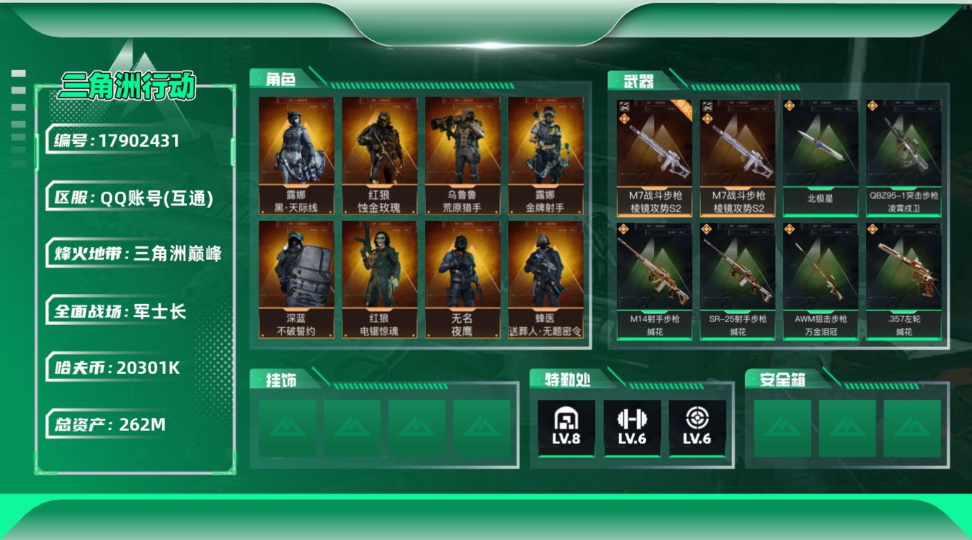 [17902431]262m总资产-20301k哈夫币-60烽火等级-三角洲巅峰-35战场等级-军士长 【干员外观】:红狼-蚀金玫瑰,露娜-黑·天际线,蜂医-送葬人·无题密令,无名-夜鹰,深蓝-不破誓约,红狼-电锯惊魂,露娜-金牌射手,乌鲁鲁-荒原猎手,蛊-不羁人生 【近战皮肤】:近战-北极星,近战-处刑者2级,近战-黑鹰 【典藏外观】:M7战斗步枪-棱镜攻势S2 【典藏外观成色】:M7战斗步枪-棱镜攻势S2(极品C) 【传说外观】:M4A1突击步枪-蚀金玫瑰,M4A1突击步枪-阿米娅,QBZ95-1突击步枪-凌霄戍卫,ASh-12战斗步枪-鹅鸭杀,M16A4突击步枪-狩猎时刻,AUG突击步枪-悠然茶歇,M7战斗步枪-零度协议,SG552突击步枪-运动员,AK-12突击步枪-夜鹰,AK-12突击步枪-特斯拉线圈,SCAR-H战斗步枪-启航,SCAR-H战斗步枪-荼蘼,G3战斗步枪-狩猎时刻,G3战斗步枪-骑士,CAR-15突击步枪-阿米娅,K437突击步枪-北极星,KC17突击步枪-电锯惊魂,MK47突击步枪-悠然茶歇,Vector冲锋枪-狩猎时刻,UZI冲锋枪-特斯拉线圈,UZI冲锋枪-悠然茶歇,SMG-45冲锋枪-骑士,SR-3M紧凑突击步枪-特斯拉线圈,SR-3M紧凑突击步枪-荼蘼,勇士冲锋枪-能天使-午夜邮差,QCQ171冲锋枪-北极星,QCQ171冲锋枪-鹅鸭杀,725双管霰弹枪-送葬人-无题密令,PKM通用机枪-荼蘼,M250通用机枪-几何解构,M250通用机枪-骑士之心,QJB201轻机枪-鹅鸭杀,M14射手步枪-电锯惊魂,M14射手步枪-蛮荒,M14射手步枪-缄花,SR-25射手步枪-缄花,AWM狙击步枪-万金泪冠,.357左轮-缄花,复合弓-黑·天际线 【史诗外观】:PSG-1射手步枪-原型机,勇士冲锋枪-檀劫铳影,AKM突击步枪-林中猎手,QBZ95-1突击步枪-曙光,ASh-12战斗步枪-守夜人,ASh-12战斗步枪-无极限,K416突击步枪-腊梅,K416突击步枪-阿萨拉特攻,M16A4突击步枪-竞赛选手,AUG突击步枪-蝮蛇,M7战斗步枪-百步穿杨,SG552突击步枪-尖端治疗,SG552突击步枪-深海恐惧,SG552突击步枪-哈夫克警备,SCAR-H战斗步枪-囚徒,G3战斗步枪-战场英杰,G3战斗步枪-流沙送葬,G3战斗步枪-哈夫克警备,AS Val突击步