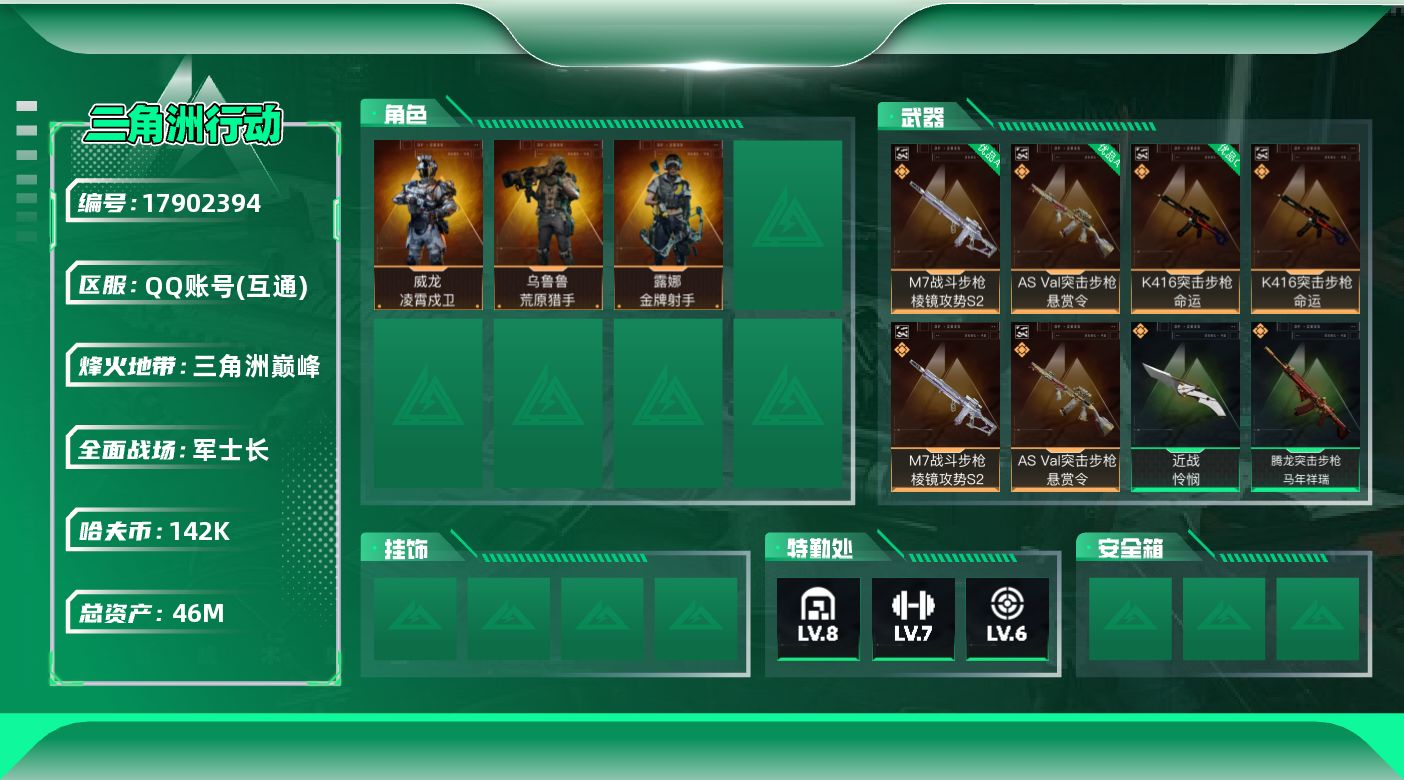 [17902394]46m总资产-142k哈夫币-60烽火等级-三角洲巅峰-33战场等级-军士长 【干员外观】:威龙-凌霄戍卫,露娜-金牌射手,乌鲁鲁-荒原猎手,蛊-不羁人生 【近战皮肤】:近战-怜悯,近战-处刑者4级,近战-黑鹰 【典藏外观】:K416突击步枪-命运,M7战斗步枪-棱镜攻势S2,AS Val突击步枪-悬赏令*2 【典藏外观成色】:K416突击步枪-命运(优品C),M7战斗步枪-棱镜攻势S2(优品A),AS Val突击步枪-悬赏令(优品A)*2 【传说外观】:AKM突击步枪-锦绣,QBZ95-1突击步枪-凌霄戍卫,K416突击步枪-行动记录,AUG突击步枪-悠然茶歇,SG552突击步枪-运动员,SCAR-H战斗步枪-荼蘼,腾龙突击步枪-马年祥瑞,K437突击步枪-锦绣,KC17突击步枪-电锯惊魂,MK47突击步枪-悠然茶歇,UZI冲锋枪-悠然茶歇,SMG-45冲锋枪-锦绣,SR-3M紧凑突击步枪-荼蘼,QCQ171冲锋枪-不羁人生,PKM通用机枪-荼蘼,M14射手步枪-蛮荒,M14射手步枪-缄花,SKS射手步枪-骑士,SR-25射手步枪-缄花,.357左轮-缄花,G18-马年祥瑞 【史诗外观】:M870霰弹枪-飓风行动,K416突击步枪-冬日风情,K416突击步枪-腊梅,K416突击步枪-阿萨拉特攻,M7战斗步枪-百步穿杨,SG552突击步枪-哈夫克警备,G3战斗步枪-流沙送葬,G3战斗步枪-哈夫克警备,AS Val突击步枪-百步穿杨,K437突击步枪-丛影谍踪,MP5冲锋枪-竞技风,Vector冲锋枪-百步穿杨,Vector冲锋枪-异域战争,SMG-45冲锋枪-阿萨拉特攻,SR-3M紧凑突击步枪-开工大吉,勇士冲锋枪-丛影谍踪,MP7冲锋枪-六套之力,S12K霰弹枪-曙光,PKM通用机枪-阿萨拉特攻,M249轻机枪-丛影谍踪,QJB201轻机枪-炽焰,VSS射手步枪-丛影谍踪,M14射手步枪-工业狂潮, M14射手步枪-航天庆典,M700狙击步枪-百步穿杨,M700狙击步枪-哈夫克警备,AWM狙击步枪-流沙送葬 【稀有外观】:UZI冲锋枪-旧梦,AUG突击步枪-旧梦,M4A1突击步枪-繁盛,AKM突击步枪-精英联盟,AKM突击步枪-肃杀,ASh-12战斗步枪-繁盛,K416突击步枪-精英联盟,K416突击步枪-一帆风顺,AUG突击步枪-指挥官,M7战斗步枪-精英联盟