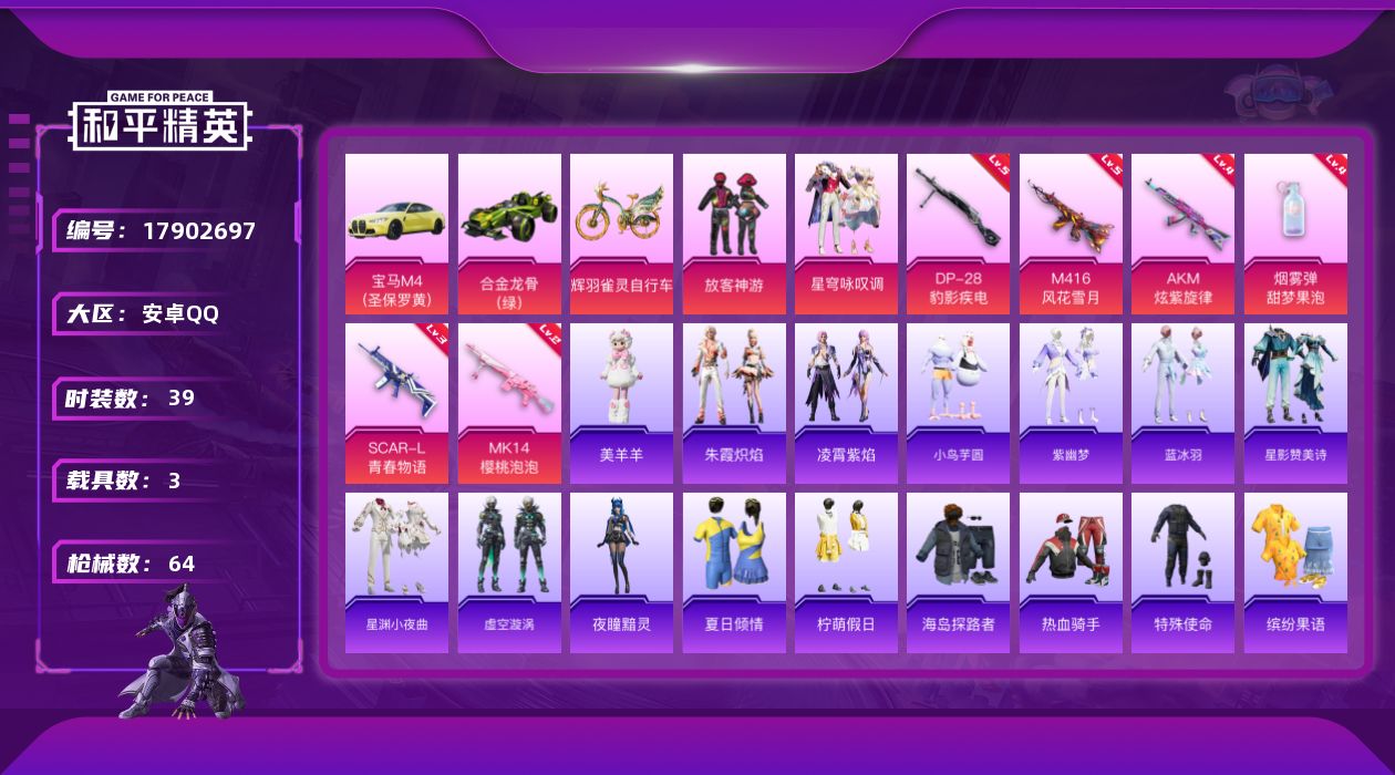 [17902697]安卓 手Q-4粉装-7特效枪-3载具-3粉色飞行器-22282热力值-2王牌印记-39套装-64枪皮 【粉色套装】:粉装-放客神游,粉装-星穹咏叹调,角色-罪夜之冕,角色-鸢尾珑雾 【粉色枪皮等级】:AKM-炫紫旋律(四级),SCAR-L-青春物语(三级),M416-风花雪月(五级),ACE32-萌骑漫游(一级),Mk14-樱桃泡泡(二级),DP-28-豹影疾电(五级),烟雾弹-甜梦果泡(四级) 【粉色载具】:宝马M4(圣保罗黄),合金龙骨(绿),辉羽雀灵自行车 【粉色枪皮】:AKM-炫紫旋律,SCAR-L-青春物语,M416-风花雪月,ACE32-萌骑漫游,Mk14-樱桃泡泡,DP-28-豹影疾电,烟雾弹-甜梦果泡 【粉色飞行器】:炫紫旋律飞行器,镜光幻境飞行翼,雀灵庇佑飞行器 【粉色降落伞】:樱桃泡泡降落伞,星穹咏叹调降落伞,辉羽雀灵降落伞,罪夜之冕降落伞,霜月狼主降落伞 【稀有套装】:套装-小鸟芋圆,套装-迅捷龙虾,套装-紫幽梦,套装-蓝冰羽,套装-星影赞美诗,套装-星渊小夜曲,套装-虚空漩涡,角色-夜瞳黯灵,套装-朱霞炽焰,套装-凌霄紫焰,玩偶服-美羊羊,套装-雨过天青,套装-红釉青花,角色-皓月伶影 【稀有枪皮】:GROZA-酷泡奶龙,M762-风花雪月,Mk47-湮灭星辰,G36C-星穹咏叹调,蜜獾-御兔特攻,ARX-凌霄紫焰,UZI-天降萌叽,Vector-风花雪月,AKS-74U-辉羽雀灵,JS9-凌霄紫焰,Kar98K-星穹咏叹调,SKS-糯团青竹,Mini14-耀粉歌者,AMR-喜羊羊与灰太狼,DP-28-彩虹符号,MG3-青春物语,MG-36-凌霄紫焰,P92-凌霄紫焰,短管霰弹-星穹咏叹调,爆炸猎弓-圣斗士星矢,大砍刀-霜月狼主,平底锅-圣斗士星矢,平底锅-凌霄紫焰,平底锅-辉羽雀灵,燃烧瓶-甜梦桃焰 【其他套装】:套装-NV战队服,套装-夏日倾情,套装-柠萌假日,套装-海岛探路者,套装-热血骑手,套装-特殊使命,套装-缤纷果语,套装-野性山猫,套装-长空猛禽,套装-鹤鸣 【营地ID】:988742177