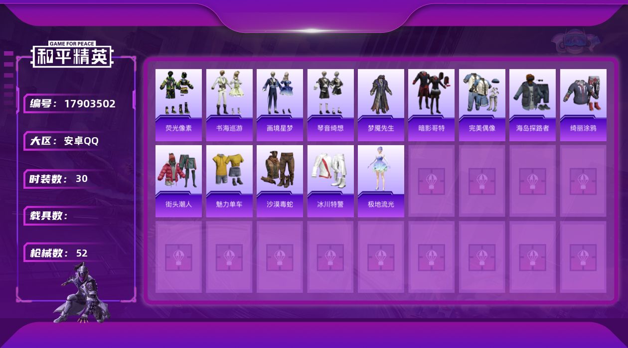 [17903502]【特价出售/店主推荐】安卓 手Q-1粉装-4特效枪-0载具-0粉色飞行器-12315热力值-1王牌印记-30套装-52枪皮