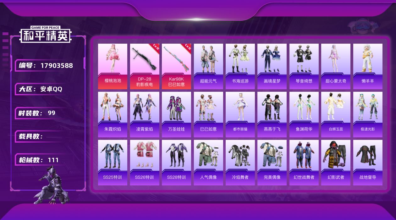 [17903588]可二次【特价出售/店主推荐】安卓 手Q-1粉装-3特效枪-0载具-1粉色飞行器-29191热力值-8王牌印记-99套装-111枪皮 【粉色套装】:角色-樱桃泡泡 【粉色枪皮等级】:Kar98K-巳巳如意(五级),Mk14-福马献瑞(五级),DP-28-豹影疾电(五级) 【粉色枪皮】:Kar98K-巳巳如意,Mk14-福马献瑞,DP-28-豹影疾电 【粉色飞行器】:炫彩糖果飞行器 【粉色降落伞】:绝对恒星降落伞,圣堂之誓降落伞,千金淑猫降落伞,赛博古神降落伞,无垠阁降落伞,喜羊羊与灰太狼降落伞,异瞳寒姬降落伞,炫彩糖果降落伞 【稀有套装】:套装-巳巳如意,套装-超能元气,角色-甜心蒙太奇,套装-雪国风尚,套装-炫彩糖果,套装-马上来财,套装-迅捷龙虾,角色-都市丽猫,套装-燕燕于飞,套装-鱼渊荷华,套装-白辉玉蕊,套装-极速光影,套装-朱霞炽焰,套装-凌霄紫焰,玩偶服-懒羊羊,套装-书海巡游,套装-画境星梦,套装-琴音绮想,套装-雨过天青,套装-红釉青花 【稀有枪皮】:AUG-冰晶雪宝,AKM-破晓战魂,AKM-龙的传人,M16A4-红色方程式,SCAR-L-炫彩节奏,SCAR-L-玉兔迎春,SCAR-L-红色方程式,M416-糯团青竹,M416-红色方程式,M416-蓝色火焰,AUG-耀粉歌者,AUG-绝对恒星,QBZ-洛神天依,M762-天降萌叽,M762-彩虹符号,AC-VAL-天降萌叽,蜜獾-天降萌叽,ACE32-画境星梦,ARX-凌霄紫焰,UZI-啾咪啾咪,UZI-天降萌叽,UZI-红色方程式,UMP45-生命誓言,UMP45-蓝色火焰,Vector-生命誓言,汤姆逊-天降萌叽,汤姆逊-耀粉歌者,汤姆逊-像素花束,MP5K-画境星梦,JS9-凌霄紫焰,P90-巳巳如意,Kar98K-洛神天依,M24-樱桃泡泡,SKS-糯团青竹,Mini14-耀粉歌者,AMR-喜羊羊与灰太狼,MK20-H-樱桃泡泡,M1加兰德-画境星梦,S686-生命誓言,S12K-破晓战魂,AA12-G-画境星梦,M249-破晓战魂,M249-绯穹魔姬,DP-28-彩虹符号,MG3-幻世战舞者,MG-36-凌霄紫焰,P92-凌霄紫焰,蝎式手枪-千金淑猫,TMP-9-未来歌姬,爆炸猎弓-喜羊羊与灰太狼,平底锅-凌霄紫焰,平底锅-画境星梦,破片手榴弹-巳巳如意 【其他套装】:套装-SS25特