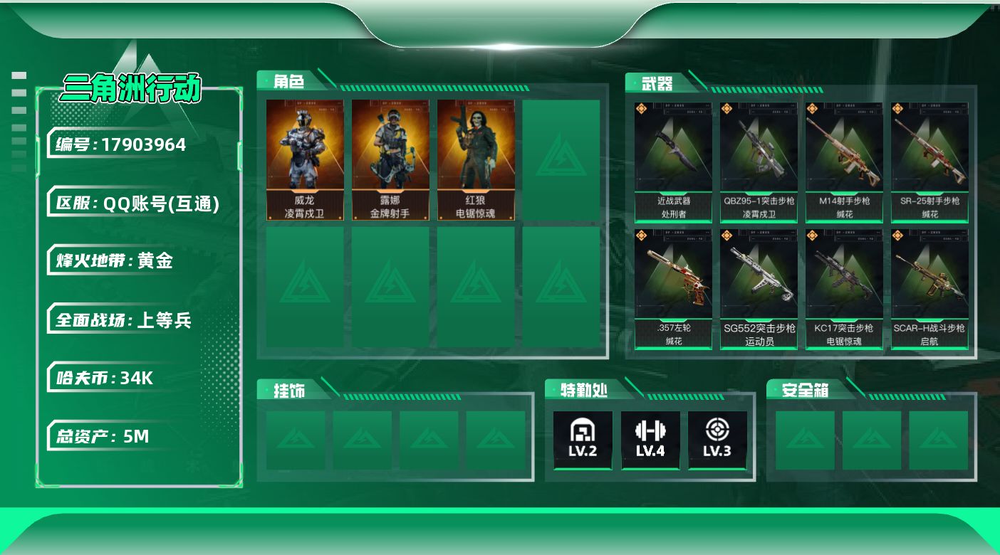 [17903964]5m总资产-34k哈夫币-60烽火等级-黄金-19战场等级-上等兵 【干员外观】:威龙-凌霄戍卫,红狼-电锯惊魂,露娜-金牌射手 【近战皮肤】:近战-处刑者1级,近战-黑鹰 【传说外观】:QBZ95-1突击步枪-凌霄戍卫,AUG突击步枪-悠然茶歇,SG552突击步枪-运动员,SCAR-H战斗步枪-启航,KC17突击步枪-电锯惊魂,MK47突击步枪-悠然茶歇,UZI冲锋枪-悠然茶歇,M250通用机枪-骑士之心,M14射手步枪-蛮荒,M14射手步枪-缄花,SR-25射手步枪-缄花,R93狙击步枪-维什戴尔,.357左轮-缄花 【史诗外观】:QBZ95-1突击步枪-曙光,ASh-12战斗步枪-无极限,K416突击步枪-冬日风情,K416突击步枪-腊梅,AUG突击步枪-蝮蛇,M7战斗步枪-百步穿杨,SG552突击步枪-哈夫克警备,G3战斗步枪-流沙送葬,G3战斗步枪-哈夫克警备,AS Val突击步枪-百步穿杨,腾龙突击步枪-猎鳄行动,K437突击步枪-守护者,K437突击步枪-丛影谍踪,MP5冲锋枪-战术竞备,Vector冲锋枪-猎鳄行动,Vector冲锋枪-百步穿杨,SMG-45冲锋枪-阿萨拉特攻,SR-3M紧凑突击步枪-开工大吉,勇士冲锋枪-丛影谍踪,MP7冲锋枪-守护者,MP7冲锋枪-六套之力,PKM通用机枪-蝮蛇,M249轻机枪-丛影谍踪,Mini-14射手步枪-守护者,VSS射手步枪-丛影谍踪,M14射手步枪-工业狂潮,SV-98狙击步枪-囚徒,SV-98狙击步枪-猎鳄行动,M700狙击步枪-百步穿杨,AWM狙击步枪-无极限,AWM狙击步枪-流沙送葬,复合弓-守护者 【稀有外观】:QJB201轻机枪-千里骏骨,M4A1突击步枪-繁盛,AKM突击步枪-战术演练,AKM突击步枪-肃杀,ASh-12战斗步枪-繁盛,K416突击步枪-一帆风顺,M7战斗步枪-捣蛋鬼,SG552突击步枪-2026,SG552突击步枪-马年新春,SG552突击步枪-贴花艺术, AK-12突击步枪-马年新春,SCAR-H战斗步枪-荣耀列队,SCAR-H战斗步枪-黄昏,G3战斗步枪-战术演练,G3战斗步枪-主宰*2,CAR-15突击步枪-来财,腾龙突击步枪-冰天雪地,KC17突击步枪-来财,MP5冲锋枪-弄臣,MP5冲锋枪-哈夫克卫队,P90冲锋枪-黄昏,P90冲锋枪-捣蛋鬼,UZI冲锋枪-亚特