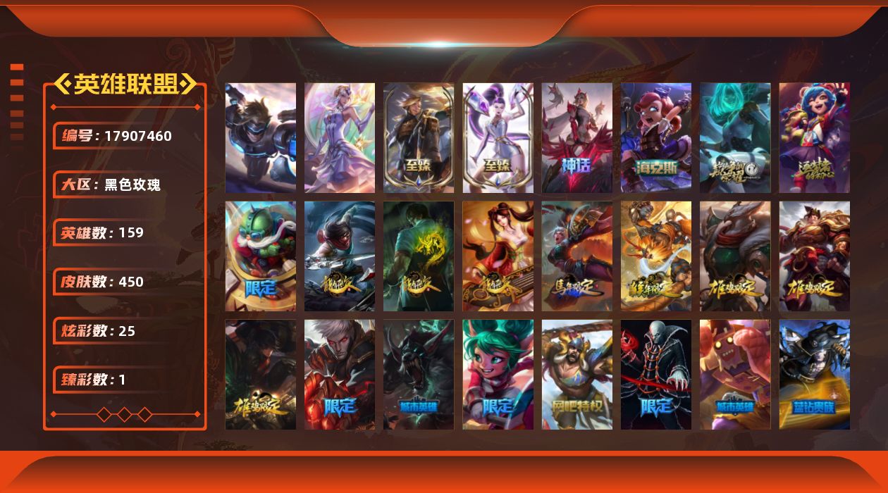 [17907460]未定级段位-159英雄-450皮肤-25炫彩-2终极-7神话-86限定-35传说-132史诗