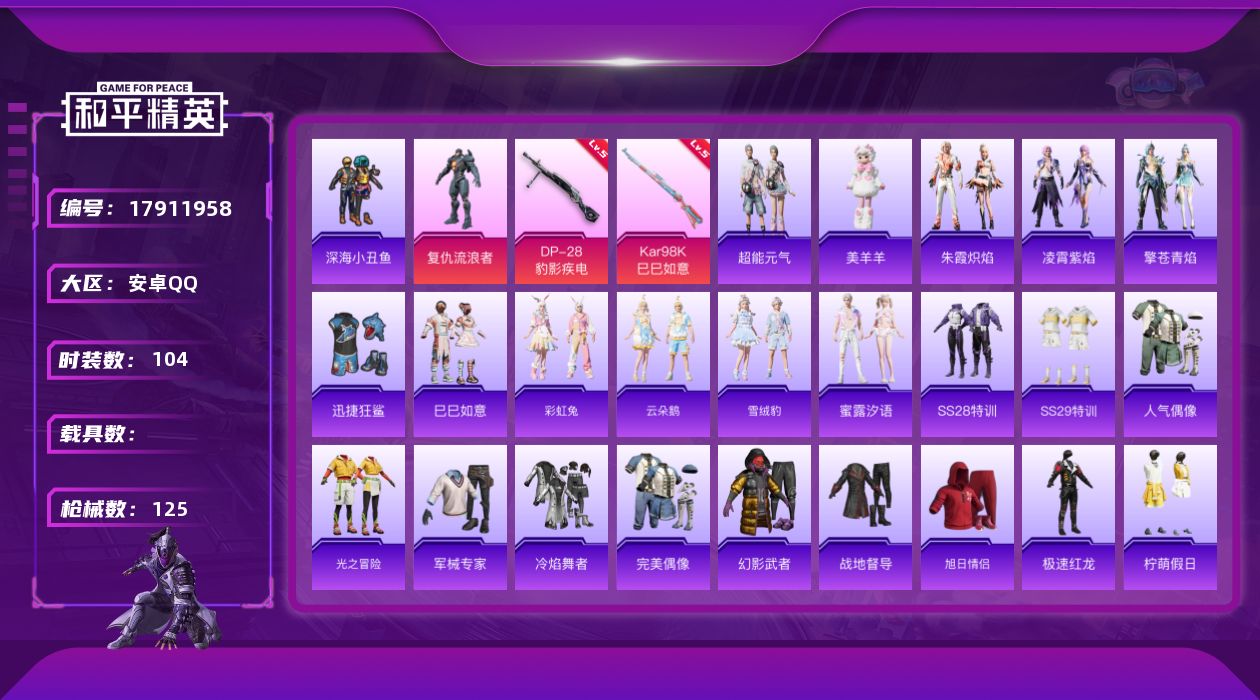 [17911958]安卓 手Q-1粉装-4特效枪-0载具-2粉色飞行器-31904热力值-7王牌印记-104套装-125枪皮 【热门品类】:套装-深海小丑鱼 【粉色套装】:角色-复仇流浪者 【粉色枪皮等级】:ACE32-萌骑漫游(三级),Kar98K-巳巳如意(五级),Mk14-福马献瑞(五级),DP-28-豹影疾电(五级) 【粉色枪皮】:ACE32-萌骑漫游,Kar98K-巳巳如意,Mk14-福马献瑞,DP-28-豹影疾电 【粉色飞行器】:炫彩糖果飞行器,极意拳锋飞行器 【粉色降落伞】:绝对恒星降落伞,幻彩电音降落伞,异瞳寒姬降落伞,炫彩糖果降落伞,虎痴许褚降落伞 【稀有套装】:套装-巳巳如意,套装-超能元气,套装-雪国风尚,套装-炫彩糖果,套装-马上有钱,套装-彩虹兔,套装-云朵鹅,套装-雪绒豹,套装-蜜露汐语,套装-朱霞炽焰,套装-凌霄紫焰,套装-擎苍青焰,玩偶服-美羊羊 【稀有枪皮】:AUG-冰晶雪宝,AKM-破晓战魂,AKM-缤纷海域,SCAR-L-夜灯,M416-红色方程式,M416-蓝色火焰,AUG-耀粉歌者,M762-彩虹符号,M762-云朵鹅,蜜獾-天降萌叽,ARX-凌霄紫焰,UZI-天降萌叽,UZI-红色方程式,UMP45-夜灯,Vector-生命誓言,汤姆逊-天降萌叽,汤姆逊-炫彩节奏,汤姆逊-环太平洋,汤姆逊-耀粉歌者,汤姆逊-像素花束,JS9-凌霄紫焰,P90-巳巳如意,Kar98K-红色方程式,M24-炫彩节奏,SKS-迅猛狂鲨,VSS-虎痴许褚,Mini14-耀粉歌者,Mini14-绯穹魔姬,SVD-云朵鹅,S686-彩虹符号,S686-生命誓言,S686-红色方程式,S686-巳巳如意,S1897-炫彩节奏,S1897-荧海星豚,S12K-破晓战魂,S12K-夜灯,S12K-智耀战神,DBS-彩虹符号,SPAS-12-云朵鹅,M249-彩虹符号,M249-破晓战魂,MG3-幻世战舞者,MG-36-凌霄紫焰,P92-凌霄紫焰,短管霰弹-星穹咏叹调,沙漠之鹰-云朵鹅,突击盾牌-绝对恒星,大砍刀-云朵鹅,平底锅-凌霄紫焰,破片手榴弹-巳巳如意 【其他套装】:套装-SS28特训,套装-SS29特训,套装-人气偶像,套装-光之冒险,套装-军械专家,套装-冷焰舞者,套装-完美偶像,套装-幻影武者,套装-战地督导,套装-旭日情侣,套装-极速红龙,套装-柠萌假日,套装