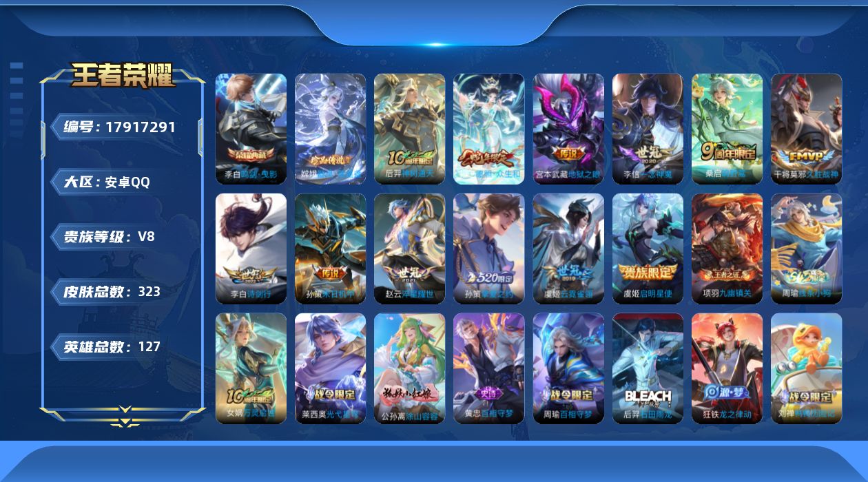 [17917291]可二次,【店主推荐捡漏号!可直接换绑】安卓Q-V8-最强王者段位-127英雄-320皮肤-1典藏-1珍品传说-12传说-105史诗 【英雄全皮】:狂铁全皮,影全皮 【荣耀典藏】:李白鸣剑曳影 【珍品传说】:嫦娥器灵落星盏 【传说皮肤】:后羿神树通天,妲己愿照众生和,桑启鸣野蒿,李白诗剑行,孙策挚爱之约,孙策末日机甲,赵云淬星耀世,虞姬启明星使,李信一念神魔,干将莫邪久胜战神,虞姬云霓雀翎,宫本武藏地狱之眼 【限定皮肤】:白起狰,蔡文姬夏日便利店,虞姬夏日便利店,姜子牙天穹之誓,狄仁杰阴阳师,赵云皇家上将,赵云龙胆,嬴政优雅恋人,孙尚香蔷薇恋人,钟无艳超时空战士,白起夜都怪侠,芈月重明,吕布猎兽之王,周瑜赤莲之焰,元歌无心,夏侯惇朔风刀,甄姬落雪兰心,曹操烛龙,典韦穷奇,马可波罗逐梦之星,马可波罗暗影游猎,马可波罗山海玄木吟,狄仁杰魔术师,狄仁杰万华元夜,达摩沙漠行僧,项羽海滩派对,项羽霸王别姬,老夫子醍醐杖,程咬金演武夺筹,韩信飞衡,王昭君午后时光,兰陵王金庭之子,孙悟空孙行者,牛魔御旌,李元芳匿光侦查者,李元芳云中旅人,虞姬启明星使,钟馗驱傩正仪,杨玉环遇见飞天,雅典娜黎明之约,鬼谷子原初探秘者,鬼谷子五谷丰年,铠青龙志,苏烈千军破阵,百里玄策原初追逐者,弈星混沌棋,梦奇顽趣,沈梦溪大漠名商,明世隐疑决卦,明世隐吟游魔法,裴擒虎李小龙,裴擒虎擒涛扼浪,狂铁御狮,狂铁电玩高手,米莱狄御霄,盾山御銮,孙策挚爱之约,上官婉儿梁祝,嫦娥拒霜思,嫦娥暖冬兔眠,西施玲珑珍味,鲁班大师探海日志,桑启海盐诗旅,暃星界游侠,戈娅驭风魔法,艾琳流音漫舞,司空震地狱燃心,阿古朵江河有灵,张良古海寻踪,蒙犽百解令,蒙恬荣光圣徽,高渐离燃音魔法,妲己灵卜魔法,鬼谷子天穹祈灯,沈梦溪龙舞盛年,鲁班七号蔬乡物语,李元芳蔬乡物语,刘邦剑破天穹,程咬金群星魔术团,镜青焰无极,项羽苍威无极,芈月浮光幕影,周瑜熔金海岸 【年限皮肤】:铠青龙志,韩信飞衡,赵云龙胆,马可波罗山海玄木吟 【赛季限定】:白起狰,芈月重明,夏侯惇朔风刀,曹操烛龙,典韦穷奇,狄仁杰万华元夜,达摩沙漠行僧,老夫子醍醐杖,程咬金演武夺筹,兰陵王金庭之子,张良古海寻踪,牛魔御旌,李元芳云中旅人,钟馗驱傩正仪,雅典娜黎明之约,鬼谷子原初探秘者,苏烈千军破阵,百里玄策原初追逐者,弈星混沌棋,梦奇顽趣,沈梦溪大漠名商,明世隐疑决卦,裴擒虎