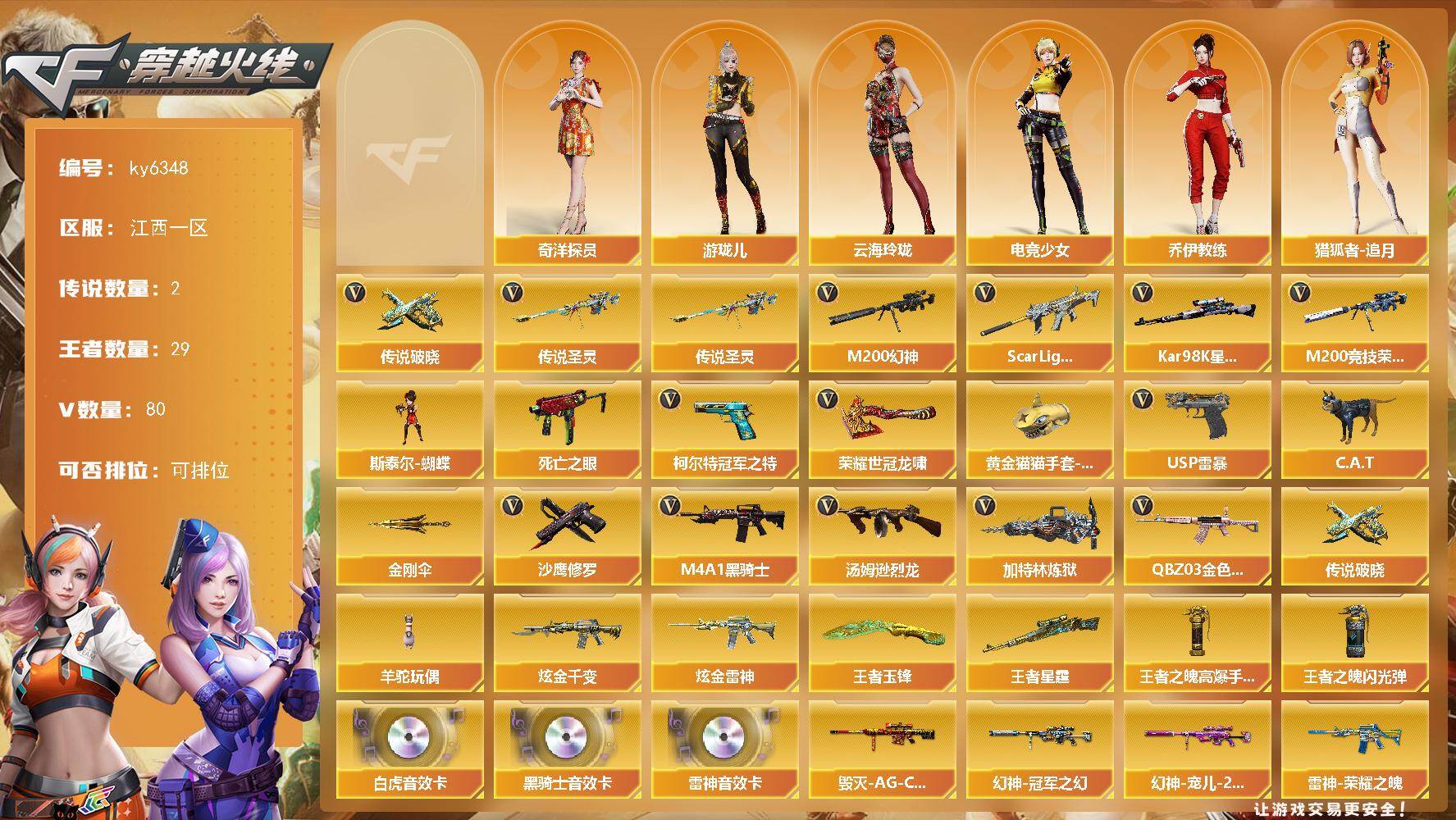 [17920263]【ky6348】江西一区-91V-29王者武器数-2炫金武器数 【传说武器】:传说圣灵,传说破晓 【热门武器】:传说圣灵,传说破晓,QBZ03-金色蔷薇,Scar Light-白虎,M200-幻神,M200-竞技荣光,死亡之眼,柯尔特-冠军之特,Kar98K-星神,C.A.T,M4A1-黑骑士,汤姆逊-烈龙*5,加特林-炼狱,斯泰尔-蝴蝶,羊驼玩偶,USP-雷暴,沙鹰-修罗*4,荣耀世冠-龙啸,黄金猫猫手套-白鲨,金刚伞 【王者炫金武器】:王者星霆,王者玉锋,炫金千变,炫金雷神,王者之魄高爆手雷,王者之魄闪光弹 【音效卡】:M4A1-雷神音效卡,M4A1-黑骑士音效卡,Scar Light-白虎音效卡 【皮肤】:幻神-冠军之幻,幻神-宠儿-2021MVP,幻神-纸灯龙皮肤,QBZ03-荣耀世冠白鲨,金色蔷薇-纸灯龙皮肤,金色蔷薇-电竞之星 皮肤,裁决-胜者为王 皮肤,星神-璀璨皮肤,雷神-荣耀之魄,雷神-虎将,雷神-R.LGD-CFPLS18冠军,雷神-烈虎皮肤,火麒麟-荣耀世冠AG,火麒麟-心动糖果,毁灭-星空,毁灭-冠军之怒,毁灭-AG-CFPLS15冠军,毁灭-黑大圣皮肤,毁灭-风暴,黑骑士耀金皮肤,黑骑士-战神马超,AWM-天龙-传奇70KG,修罗-冠军之魂,屠龙-春桃 皮肤 【角色】:葵,瞳,影豹,电竞教官-云悠悠,鹰,兰-巾帼英雄,王者樱-热浪之夏,王者葵-惊若翩鸿,王者-魅影,王者-迷迭香,奇洋探员,乔伊教练,修道士,云海玲珑,幻面灵狐,空,暗夜-X,北极狐-X,初恋灵狐,电竞少女,飞虎队-X,风暴女*2,虎妞,嘉年华灵狐,兰-新年限定,猎狐者-追月,灵狐-花神,灵狐者-X,龙儿-小淘气,麻雀,曼陀罗-X,曼陀罗-礼服,萌儿,女战神,潘多拉-X,潘多拉-甜心教官,潜龙队-X,斯沃特-X,新娜塔莎,雪莉杨-摸金校尉,樱-战斗天使,游珑儿 【人偶武器】:斯泰尔-蝴蝶,AWM-灵狐-15周年嘉年华*2,M37-葵,C.A.T,迷你深渊冰龙,夺魂,生化手雷-机甲核心*2,Barrett-夜玫瑰,灵狐娃娃手雷 【暴走生化】:死亡之眼,超级对讲机 【挑战大师】:激光毁灭者III,神圣爆裂者-末日III 【英雄级武器】:AK47-火麒麟,M4A1-雷神,M4A1-黑骑士,AK47-黑武士,AK12-天启,Scar Light-白虎,无影-神兵利器,黑武士-锦绣游龙
