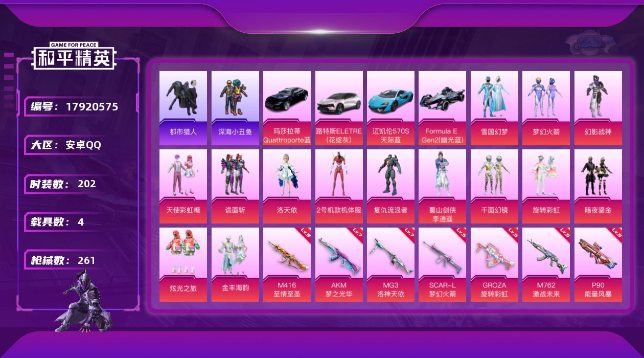 [17920575]安卓 手Q-14粉装-13特效枪-4载具-8粉色飞行器-104139热力值-16王牌印记-202套装-261枪皮