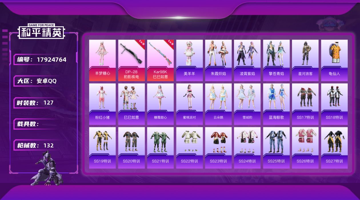 [17924764]安卓 手Q-1粉装-3特效枪-0载具-1粉色飞行器-36848热力值-13王牌印记-127套装-132枪皮 【热门品类】:套装-星河浪客,套装-龟仙人,套装-粉红小猪 【粉色套装】:角色-羊梦糖心 【粉色枪皮等级】:Kar98K-巳巳如意(五级),Mk14-福马献瑞(五级),DP-28-豹影疾电(五级) 【粉色枪皮】:Kar98K-巳巳如意,Mk14-福马献瑞,DP-28-豹影疾电 【粉色飞行器】:炫彩糖果飞行器 【粉色降落伞】:冷漠罗丽降落伞,荧海星豚降落伞,喜羊羊与灰太狼降落伞,异瞳寒姬降落伞,炫彩糖果降落伞 【稀有套装】:套装-龟仙人,套装-巳巳如意,套装-马上来财,角色-糖霜甜心,角色-蜜桃派对,套装-云朵鹅,套装-雪绒豹,套装-蓝海鲸歌,套装-朱霞炽焰,套装-凌霄紫焰,套装-擎苍青焰,玩偶服-美羊羊 【稀有枪皮】:AKM-夜灯,AKM-破晓战魂,AKM-龙的传人,M16A4-幻世战舞者,M16A4-红色方程式,M16A4-蓝色火焰,SCAR-L-夜灯,SCAR-L-炫彩节奏,SCAR-L-玉兔迎春,SCAR-L-红色方程式,M416-糯团青竹,M416-红色方程式,M416-蓝色火焰,GROZA-彩虹符号,GROZA-荧海星豚,AUG-天降萌叽,AUG-耀粉歌者,QBZ-彩虹符号,M762-天降萌叽,M762-彩虹符号,M762-云朵鹅,G36C-星穹咏叹调,AC-VAL-天降萌叽,蜜獾-天降萌叽,蜜獾-娇憨猪猪,ARX-凌霄紫焰,UZI-啾咪啾咪,UZI-天降萌叽,UZI-娇憨猪猪,UZI-炫彩节奏,UZI-红色方程式,UMP45-夜灯,UMP45-涂山之恋,UMP45-生命誓言,UMP45-蓝色火焰,UMP45-极意拳锋,Vector-生命誓言,汤姆逊-天降萌叽,汤姆逊-炫彩节奏,汤姆逊-耀粉歌者,JS9-凌霄紫焰,P90-巳巳如意,Kar98K-红色方程式,M24-炫彩节奏,SKS-炫彩节奏,Mini14-耀粉歌者,SLR-娇憨猪猪,AMR-喜羊羊与灰太狼,M417-虹云熊熊,MK20-H-樱桃泡泡,SVD-云朵鹅,S686-彩虹符号,S686-红色方程式,S686-巳巳如意,S1897-炫彩节奏,S1897-荧海星豚,S12K-玩趣呆呆,S12K-破晓战魂,S12K-娇憨猪猪,S12K-幻世战舞者,DBS-彩虹符号,DBS-第五大道,DBS-月影