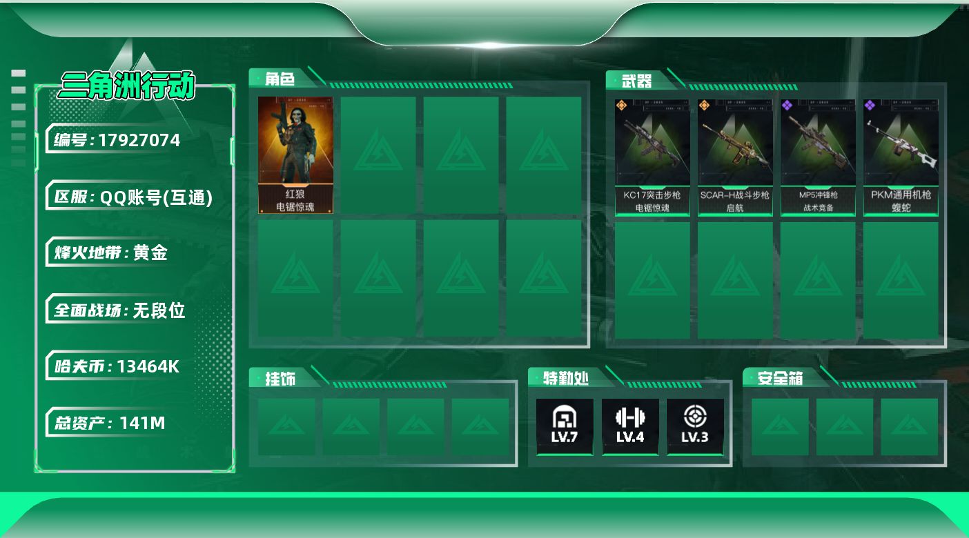 [17927074]13464k哈伏币-123m流动资产-60烽火等级-黄金-1战场等级-无军衔 【干员外观】:红狼-电锯惊魂 【近战皮肤】:近战-黑鹰 【传说外观】:SCAR-H战斗步枪-启航,KC17突击步枪-电锯惊魂 【史诗外观】:MP5冲锋枪-战术竞备,PKM通用机枪-蝮蛇 【稀有外观】:M700狙击步枪-旧梦,AKM突击步枪-肃杀,M7战斗步枪-捣蛋鬼,腾龙突击步枪-冰天雪地,MP5冲锋枪-哈夫克卫队,P90冲锋枪-黄昏,P90冲锋枪-捣蛋鬼,UZI冲锋枪-亚特兰蒂斯,SMG-45-行动开启,SMG-45冲锋枪-幻影结构,勇士冲锋枪-前沿科技,Mini-14射手步枪-荣耀列队,G18-星链科技,G18-哈夫克航天 【普通外观】:M4A1突击步枪-粉色涂装,M4A1突击步枪-海色,QBZ95-1突击步枪-高雅黑,QBZ191突击步枪-三角洲力量,K416突击步枪-高雅黑,M16A4突击步枪-高雅黑,SG552突击步枪-浅蓝涂装,SG552突击步枪-海浪,MP5冲锋枪-黄蜂,M1014霰弹枪-高雅黑,M249轻机枪-黄蜂,M250通用机枪-条纹,SR-25射手步枪-黄蜂,SV-98狙击步枪-红色涂装,QSZ92G-条纹,沙漠之鹰-海浪,沙漠之鹰-高雅黑 【载具外观】:轮式突击炮-荣耀 【军牌】:军牌-修整,军牌-神秘艺术,军牌-信誉优秀 【挂饰】:挂饰-维什戴尔,挂饰-诡影狙击兵,挂饰-崩岩重炮*3,挂饰-暗行哨兵,挂饰-启程 【热门藏品】:非洲之心