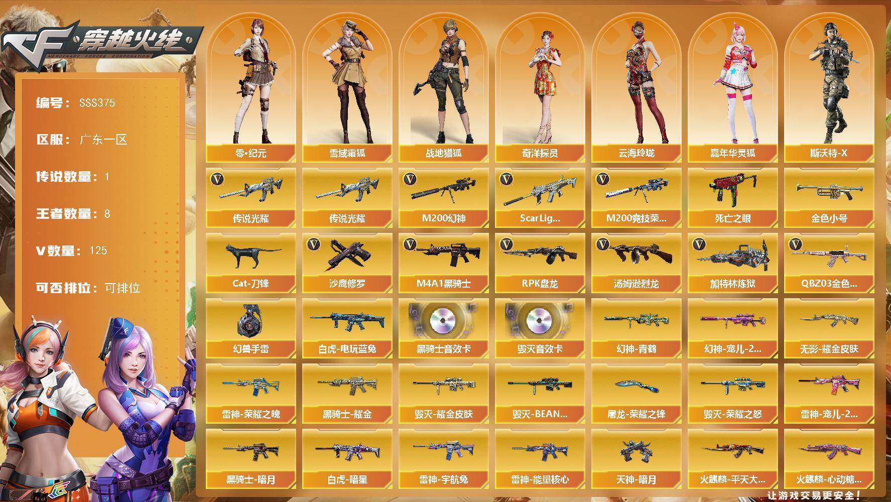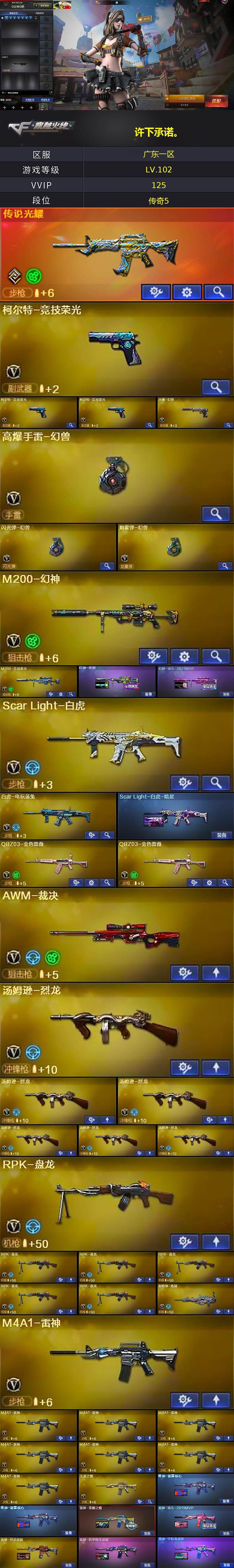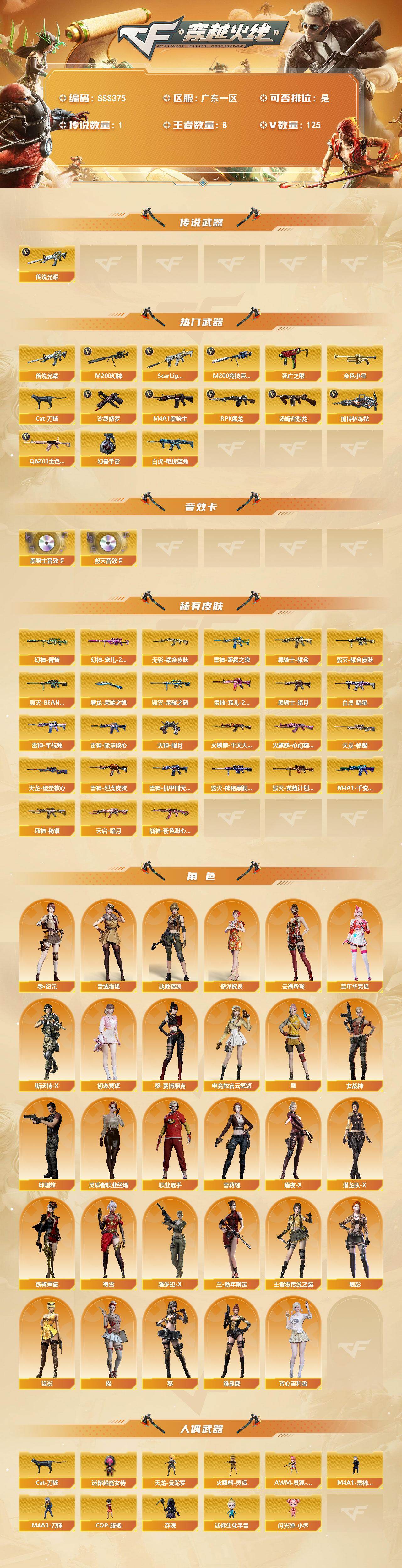 [17928541]广东一区-132V-8王者武器数-0炫金武器数 【传说武器】:传说光耀 【热门武器】:传说光耀,QBZ03-金色蔷薇*2,Scar Light-白虎,M200-幻神,M200-竞技荣光,死亡之眼,白虎-电玩蓝兔,金色小号,Cat-刀锋,M4A1-黑骑士*4,汤姆逊-烈龙*6,RPK-盘龙*6,加特林-炼狱,沙鹰-修罗*6,高爆手雷-幻兽 【音效卡】:M4A1-黑骑士音效卡,Barrett-毁灭音效卡 【皮肤】:幻神-青鹤,幻神-宠儿-2021MVP,Scar Light-白虎-暗星,雷神-能量核心*2,雷神-荣耀之魄,雷神-宠儿-2019MVP,雷神-烈虎皮肤,雷神-机甲刑天皮肤,雷神-宇航兔皮肤,火麒麟-平天大圣,火麒麟-心动糖果,毁灭-荣耀之怒,毁灭耀金皮肤,毁灭-BEAN-2020MVP,毁灭-神秘黑洞皮肤,毁灭-英雄计划 皮肤,M4A1-千变-孔明皮肤,黑骑士-暗月,黑骑士耀金皮肤,无影耀金皮肤,死神-秘银*2,天启-暗月,战神-粉色甜心皮肤,天龙-秘银*3,天龙-能量核心,天神-暗月*3,屠龙-荣耀之锋 【角色】:葵,樱,魅影,电竞教官-云悠悠,鹰,零·纪元,战地猎狐,狐影,雪域霜狐,奇洋探员,云海玲珑,暗夜-X,初恋灵狐,芳心审判者,嘉年华灵狐,葵-赛博朋克,兰-新年限定,灵狐者-职业经理,女战神,潘多拉-X,潜龙队-X,邱刚敖,斯沃特-X,蜀雪,铁骑荣耀,王者-零-传说之路,雪莉杨,职业选手,雅典娜 【人偶武器】:天龙-曼陀罗,火麒麟-灵狐,M4A1-雷神-精英刀锋,AWM-灵狐-15周年嘉年华,COP-旗袍*2,Cat-刀锋,M4A1-刀锋,夺魂,迷你生化手雷,闪光弹-小乔*2,迷你超能女侍 【暴走生化】:黑龙吞噬者,死亡之眼,超级对讲机 【挑战大师】:AK47-冰龙粉碎者,激光毁灭者III*3 【英雄级武器】:M4A1-千变,AK47-火麒麟*3,M4A1-黑龙,M4A1-雷神*8,M4A1-黑骑士*4,AK47-无影,M4A1-死神*2,AK47-黑武士,AN94-超新星,M4A1-武圣*2,AK47-机械迷城*2,Scar Light-白虎,QBZ03-金色蔷薇*2,王者之魄-觉醒版,AK-47-猩红传说*3,AK47-B-战神,黑骑士-海王,白虎-电玩蓝兔,机械迷城-穹宇,AK47-B-战士,AWM-天龙*3,Barrett-毁灭*4,Ba
