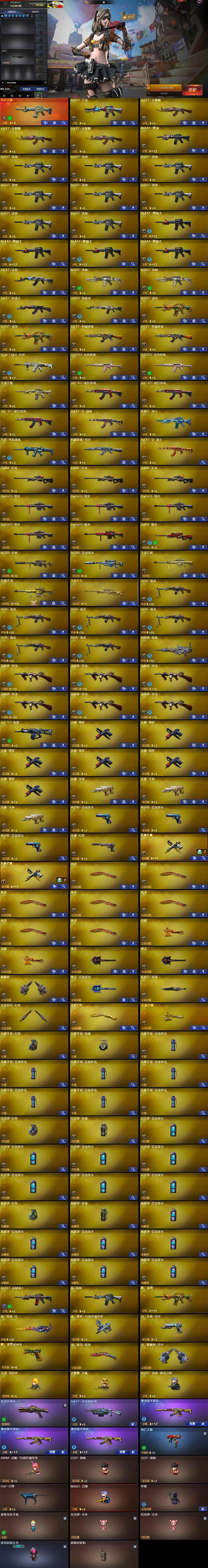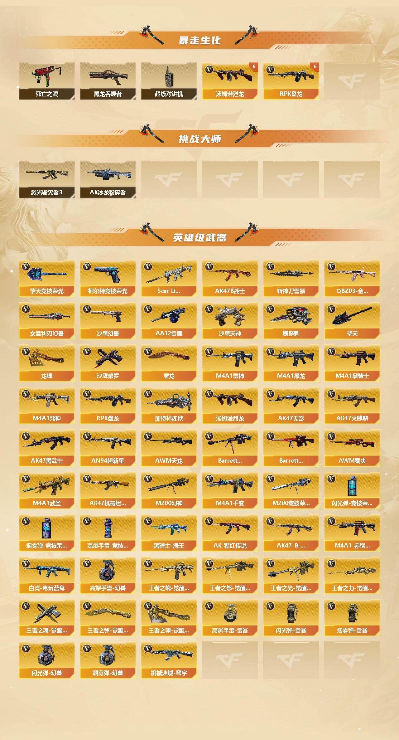 【英雄级武器】:M4A1-千变,AK47-火麒麟*3,M4A1-黑龙,M4A1-雷神*8,M4A1-黑骑士*4,AK47-无影,M4A1-死神*2,AK47-黑武士,AN94-超新星,M4A1-武圣*2,AK47-机械迷城*2,Scar Light-白虎,QBZ03-金色蔷薇*2,王者之魄-觉醒版,AK-47-猩红传说*3,AK47-B-战神,黑骑士-海王,白虎-电玩蓝兔,机械迷城-穹宇,AK47-B-战士,AWM-天龙*3,Barrett-毁灭*4,Ba