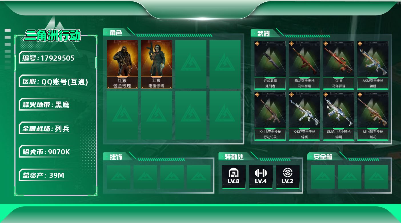 [17929505]39m总资产-9070k哈夫币-60烽火等级-黑鹰-11战场等级-列兵 【干员外观】:红狼-蚀金玫瑰,红狼-电锯惊魂 【近战皮肤】:近战-处刑者1级,近战-黑鹰 【传说外观】:M4A1突击步枪-蚀金玫瑰,AKM突击步枪-锦绣,ASh-12战斗步枪-鹅鸭杀,K416突击步枪-行动记录,M16A4突击步枪-狩猎时刻,AUG突击步枪-悠然茶歇,AK-12突击步枪-特斯拉线圈,SCAR-H战斗步枪-启航,SCAR-H战斗步枪-荼蘼,G3战斗步枪-狩猎时刻,腾龙突击步枪-马年祥瑞,K437突击步枪-锦绣,KC17突击步枪-电锯惊魂,MK47突击步枪-悠然茶歇,Vector冲锋枪-狩猎时刻,UZI冲锋枪-特斯拉线圈,UZI冲锋枪-悠然茶歇,SMG-45冲锋枪-锦绣,SR-3M紧凑突击步枪-特斯拉线圈,SR-3M紧凑突击步枪-荼蘼,勇士冲锋枪-能天使-午夜邮差,QCQ171冲锋枪-鹅鸭杀,PKM通用机枪-荼蘼,QJB201轻机枪-鹅鸭杀,M14射手步枪-缄花,SR-25射手步枪-缄花,.357左轮-缄花,G18-马年祥瑞,复合弓-黑·天际线 【史诗外观】:ASh-12战斗步枪-碎冰行动,K416突击步枪-冬日风情,M16A4突击步枪-竞赛选手,AUG突击步枪-蝮蛇,SG552突击步枪-深海恐惧,G3战斗步枪-哈夫克警备,腾龙突击步枪-猎鳄行动,MP5冲锋枪-深海恐惧,MP5冲锋枪-战术竞备,MP5冲锋枪-竞技风,P90冲锋枪-紧急戒备,SR-3M紧凑突击步枪-战术竞备,勇士冲锋枪-深海恐惧,勇士冲锋枪-工业狂潮,MP7冲锋枪-六套之力,PKM通用机枪-阿萨拉特攻,M250通用机枪-囚徒,QJB201轻机枪-炽焰,QJB201轻机枪-Old Habits,SVD狙击步枪-阿萨拉工艺,M14射手步枪-工业狂潮,SV-98狙击步枪-林中猎手,SV-98狙击步枪-囚徒,SV-98狙击步枪-猎鳄行动,M700狙击步枪-竞技风,M700狙击步枪-哈夫克警备 【稀有外观】:As Val突击步枪-星之彩,QJB201轻机枪-千里骏骨,AKS-74U突击步枪-休闲时光,AKM突击步枪-肃杀,QBZ95-1突击步枪-公平竞技,K416突击步枪-一帆风顺,M7战斗步枪-捣蛋鬼,SG552突击步枪-2026,SG552突击步枪-贴花艺术, AK-12突击步枪-马年新春,SCAR-H战斗步枪-荣耀列队,