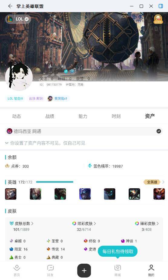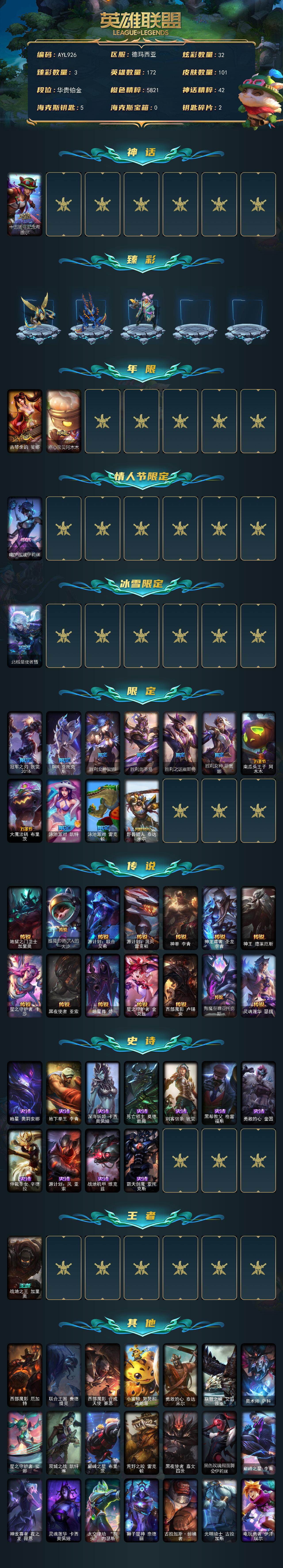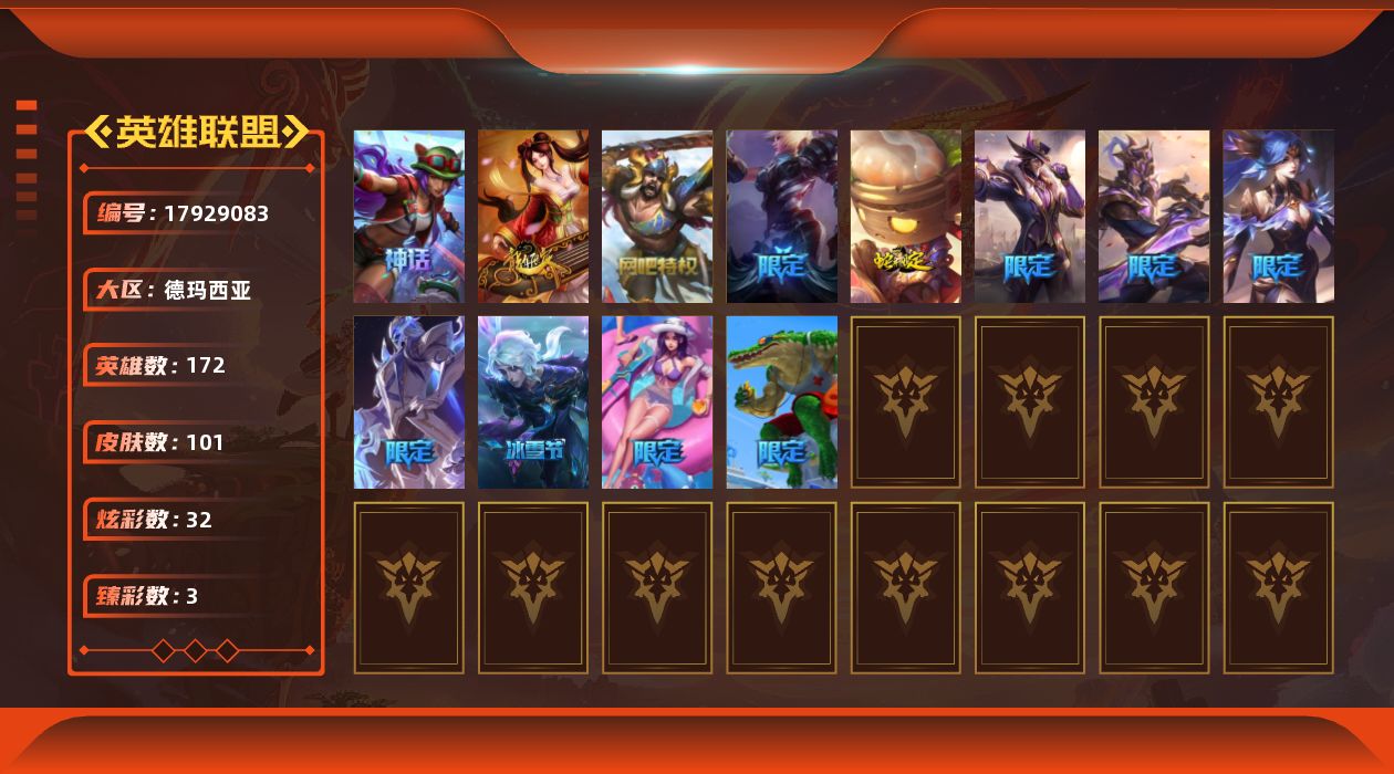 [17929083]铂金段位-172英雄-101皮肤-32炫彩-0终极-1神话-16限定-14传说-11史诗