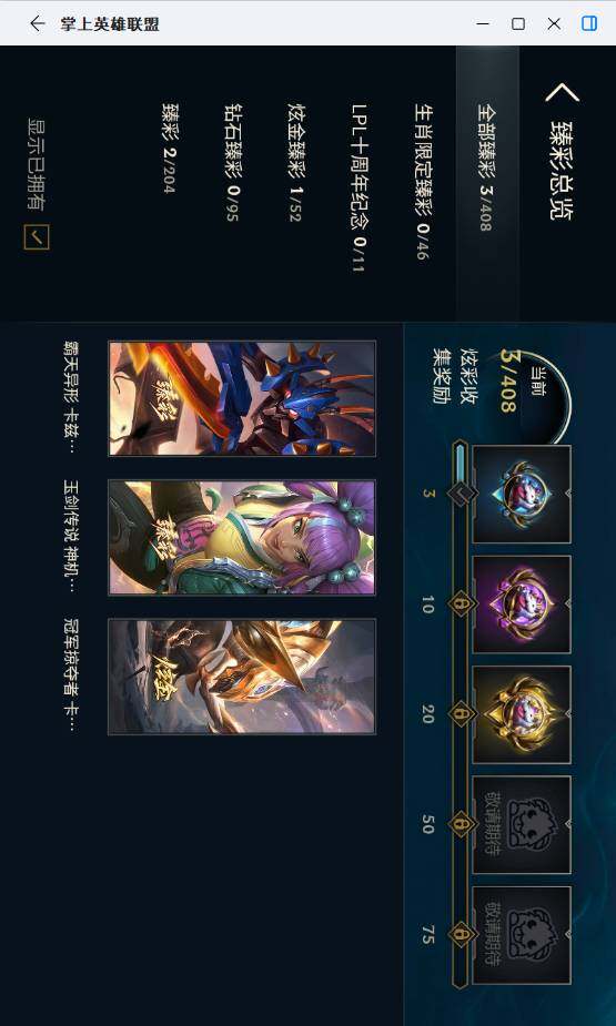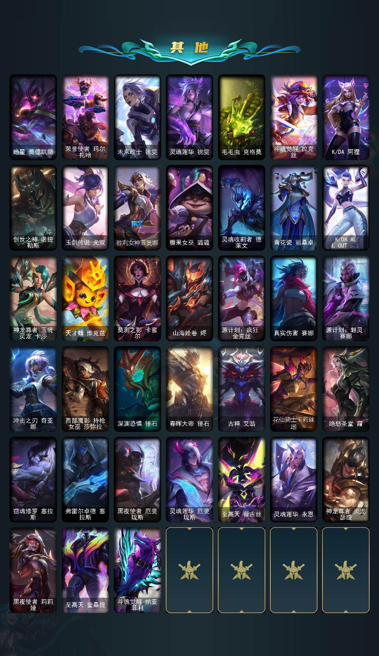 【其他皮肤】:西部魔影厄加特,联合王国费德提克,西部魔影合成天使赛恩,小蜜蜂努努和威朗普,勇敢的心泰达米尔,联盟之喙艾尼维亚,奥术师萨科,星之守护者娑娜,双城之战凯特琳,巅峰之星布里茨,荒野之咬雷克顿,黑夜使者嘉文四世,黑色玫瑰假面舞会伊莉丝,巅峰之星李青,神龙尊者夜之龙薇恩,灵魂莲华卡西奥佩娅,太空律动狗头内瑟斯,狮子星神奈德丽,古拉加斯碎桶者,光明骑士古拉加斯,电玩勇者伊泽瑞尔,暗星莫德凯撒,荣誉使者玛尔扎哈,未来战士锐雯,灵魂莲华锐雯,毛毛虫克格莫,斗魂觉醒拉克丝,KDA阿狸,创世之神诺提勒斯,玉剑传说无双,胜利女神菲奥娜,糖果女巫璐璐,灵魂收割者德莱文,青花瓷丽桑卓,KDAALLOUT卡莎,神龙尊者玉境灵龙卡莎,天才蜂维克兹,莫测之影卡蜜尔,山海绘卷烬,源计划疯狂金克丝,真实伤害赛娜,源计划魅灵赛娜,冲击之刃奇亚娜,西部魔影持枪女巫莎弥拉,深渊恐惧锤石,春晖大帝锤石,古神艾翁,花仙骑士卡莉丝塔,绝息圣堂霞,窃魂修罗塞拉斯,弗雷尔卓德塞拉斯,黑夜使者厄斐琉斯,灵魂莲华厄斐琉斯,至高天薇古丝,灵魂莲华永恩,神龙尊者炎龙瑟提,黑夜使者莉莉娅,至高天奎桑提,斗魂觉醒纳亚菲利