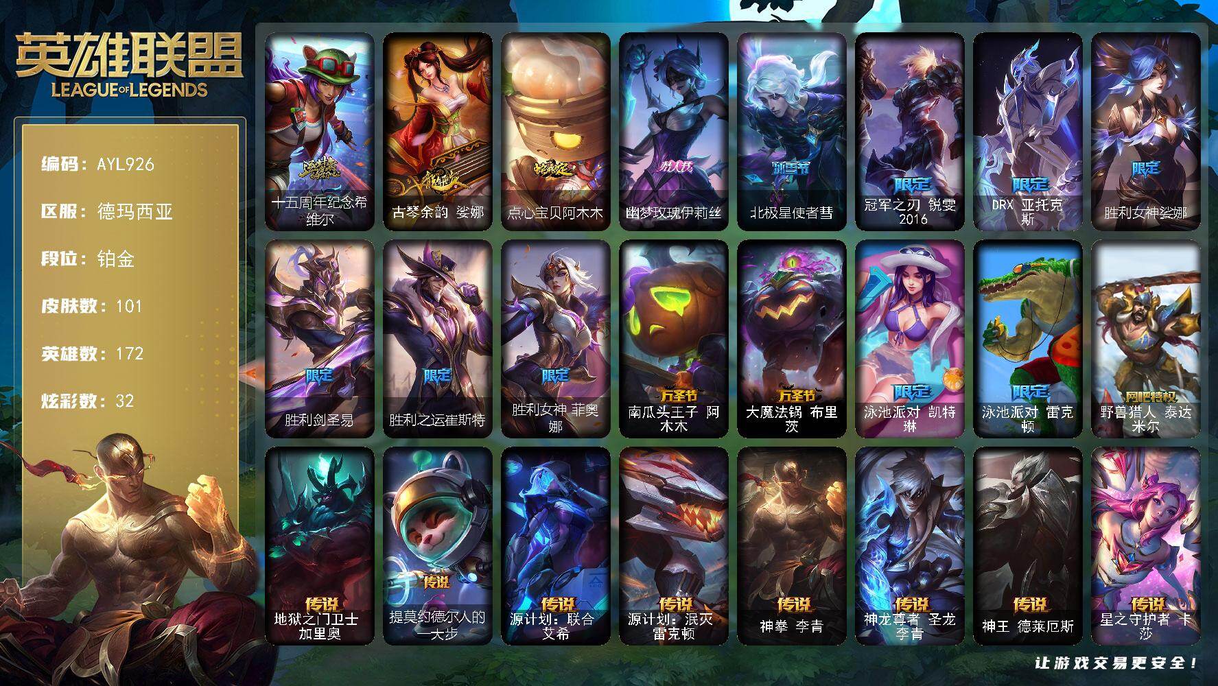 [17929083]铂金段位-172英雄-101皮肤-32炫彩-0终极-1神话-16限定-14传说-11史诗 【神话皮肤】:十五周年纪念希维尔 【臻彩皮肤】:冠军掠夺者卡兹克凯旋圣装,霸天异形卡兹克掠空魅影,玉剑传说神机花火青竹 【年限皮肤】:古琴余韵娑娜,点心宝贝阿木木 【情人节限定】:幽梦玫瑰伊莉丝 【冰雪限定】:北极星使者彗 【限定皮肤】:冠军之刃锐雯2016,DRX亚托克斯,胜利女神娑娜,胜利剑圣易,胜利之运崔斯特,胜利女神菲奥娜,南瓜头王子阿木木,大魔法锅布里茨,泳池派对凯特琳,泳池派对雷克顿,野兽猎人泰达米尔 【传说皮肤】:地狱之门卫士加里奥,提莫约德尔人的一大步,源计划联合艾希,源计划泯灭雷克顿,神拳李青,神龙尊者圣龙李青,神王德莱厄斯,星之守护者卡莎,黑夜使者亚索,暗星尊烬,星之守护者金克丝,西部魔影卢锡安,海魔至尊亚托克斯,灵魂莲华瑟提 【史诗皮肤】:暗星奥莉安娜,地下拳王李青,深海妖姬卡西奥佩娅,死亡领主莫德凯撒,刺客信条锐雯,黑帮教父格雷福斯,勇敢的心奎因,仲裁圣女辛德拉,源计划风亚索,战地机甲维克兹,霸天剑魔亚托克斯 【王者皮肤】:战地之王加里奥 【其他皮肤】:西部魔影厄加特,联合王国费德提克,西部魔影合成天使赛恩,小蜜蜂努努和威朗普,勇敢的心泰达米尔,联盟之喙艾尼维亚,奥术师萨科,星之守护者娑娜,双城之战凯特琳,巅峰之星布里茨,荒野之咬雷克顿,黑夜使者嘉文四世,黑色玫瑰假面舞会伊莉丝,巅峰之星李青,神龙尊者夜之龙薇恩,灵魂莲华卡西奥佩娅,太空律动狗头内瑟斯,狮子星神奈德丽,古拉加斯碎桶者,光明骑士古拉加斯,电玩勇者伊泽瑞尔,暗星莫德凯撒,荣誉使者玛尔扎哈,未来战士锐雯,灵魂莲华锐雯,毛毛虫克格莫,斗魂觉醒拉克丝,KDA阿狸,创世之神诺提勒斯,玉剑传说无双,胜利女神菲奥娜,糖果女巫璐璐,灵魂收割者德莱文,青花瓷丽桑卓,KDAALLOUT卡莎,神龙尊者玉境灵龙卡莎,天才蜂维克兹,莫测之影卡蜜尔,山海绘卷烬,源计划疯狂金克丝,真实伤害赛娜,源计划魅灵赛娜,冲击之刃奇亚娜,西部魔影持枪女巫莎弥拉,深渊恐惧锤石,春晖大帝锤石,古神艾翁,花仙骑士卡莉丝塔,绝息圣堂霞,窃魂修罗塞拉斯,弗雷尔卓德塞拉斯,黑夜使者厄斐琉斯,灵魂莲华厄斐琉斯,至高天薇古丝,灵魂莲华永恩,神龙尊者炎龙瑟提,黑夜使者莉莉娅,至高天奎桑提,斗魂觉醒纳亚菲利