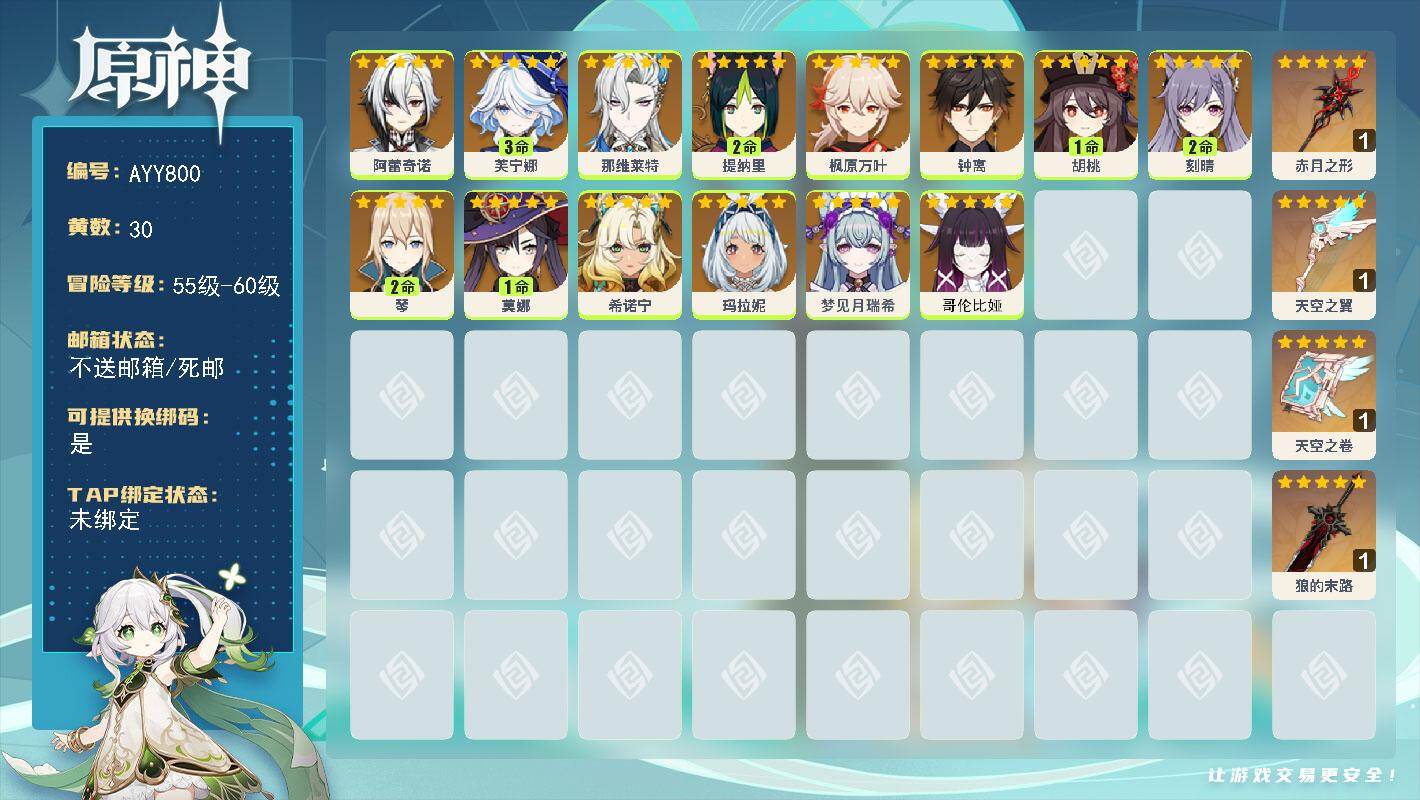 [17930558]59级/30黄/女主/14个五星角色/5个五星武器 0命阿蕾奇诺,3命芙宁娜,0命那维莱特,2命提纳里,0命枫原万叶,0命钟离,1命胡桃,2命刻晴,2命琴,1命莫娜,0命希诺宁,0命玛拉妮,0命梦见月瑞希,0命哥伦比娅,精1赤月之形,精1天空之翼,精1天空之卷,精1狼的末路