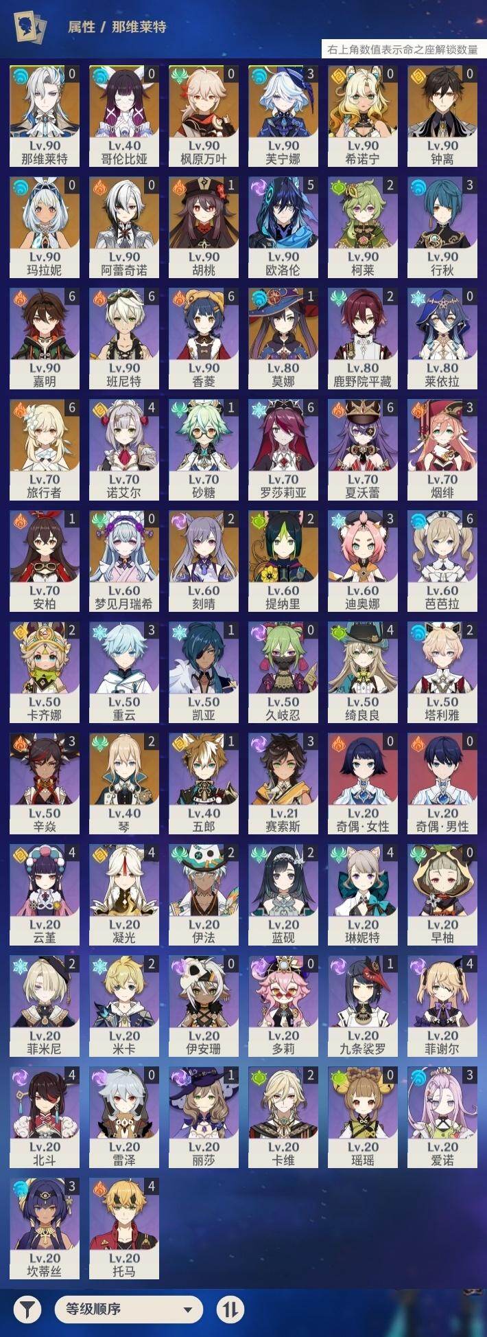 - [17535081]58级/35黄/女主/22个五星角色/6个五星武器 0命克洛琳德,0命娜维娅,0命纳西妲,0命赛诺,0命提纳里,0命夜兰,0命八重神子,0命雷电将军,0命枫原万叶,0命钟离,0命甘雨,0命温迪,0命可莉,0命达达利亚,0命珊瑚宫心海,3命刻晴,0命七七,0命琴,1命莫娜,2命迪卢克,0命希诺宁,0命梦见月瑞希,精1神乐之真意,精1终末嗟叹之诗,精1四风原典,精1和璞鸢,精2天空之脊,精1阿莫斯之弓