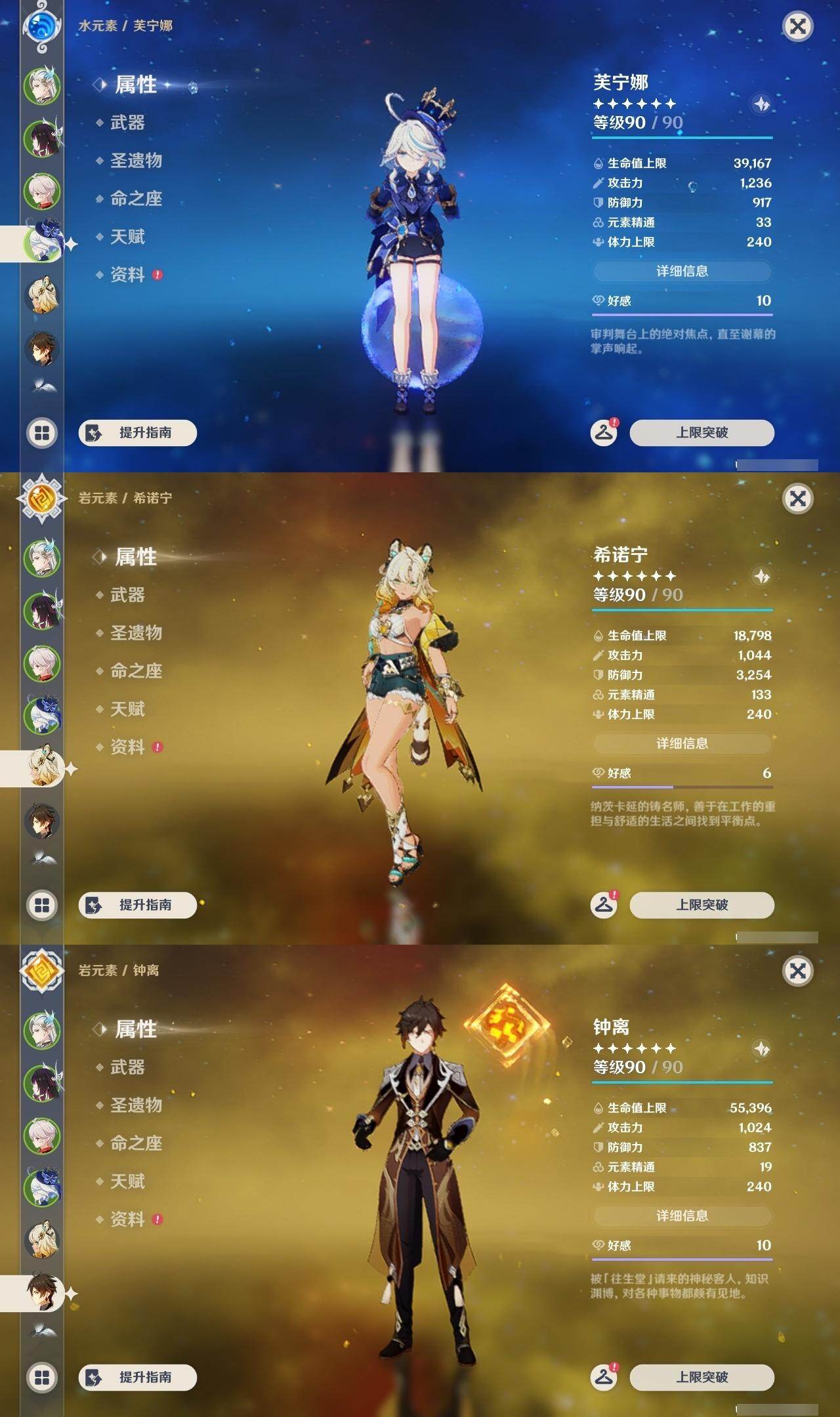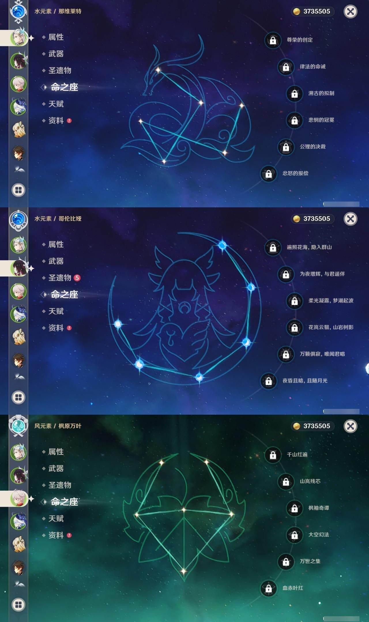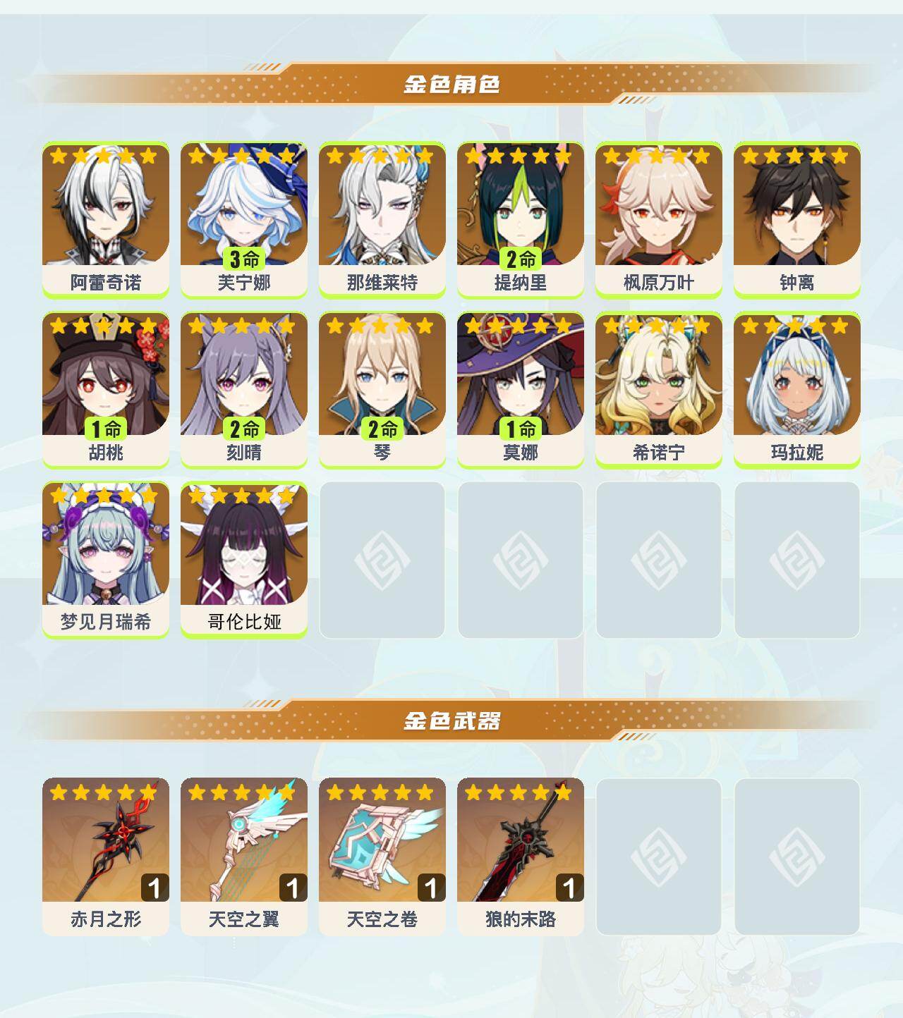 0命阿蕾奇诺,3命芙宁娜,0命那维莱特,2命提纳里,0命枫原万叶,0命钟离,1命胡桃,2命刻晴,2命琴,1命莫娜,0命希诺宁,0命玛拉妮,0命梦见月瑞希,0命哥伦比娅,精1赤月之形,精1天空之翼,精1天空之卷,精1狼的末路