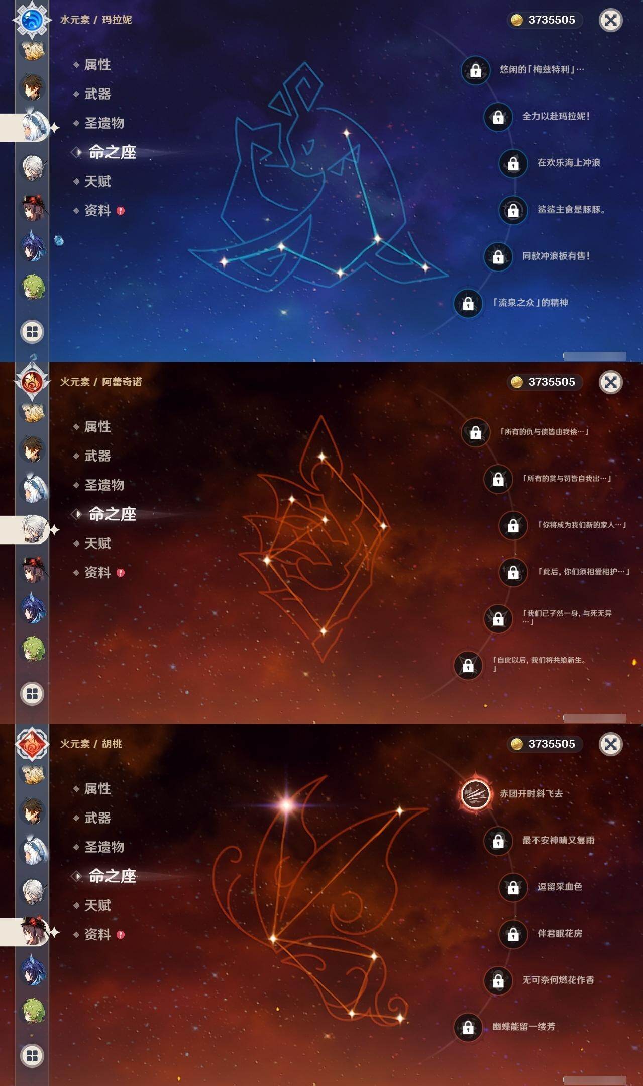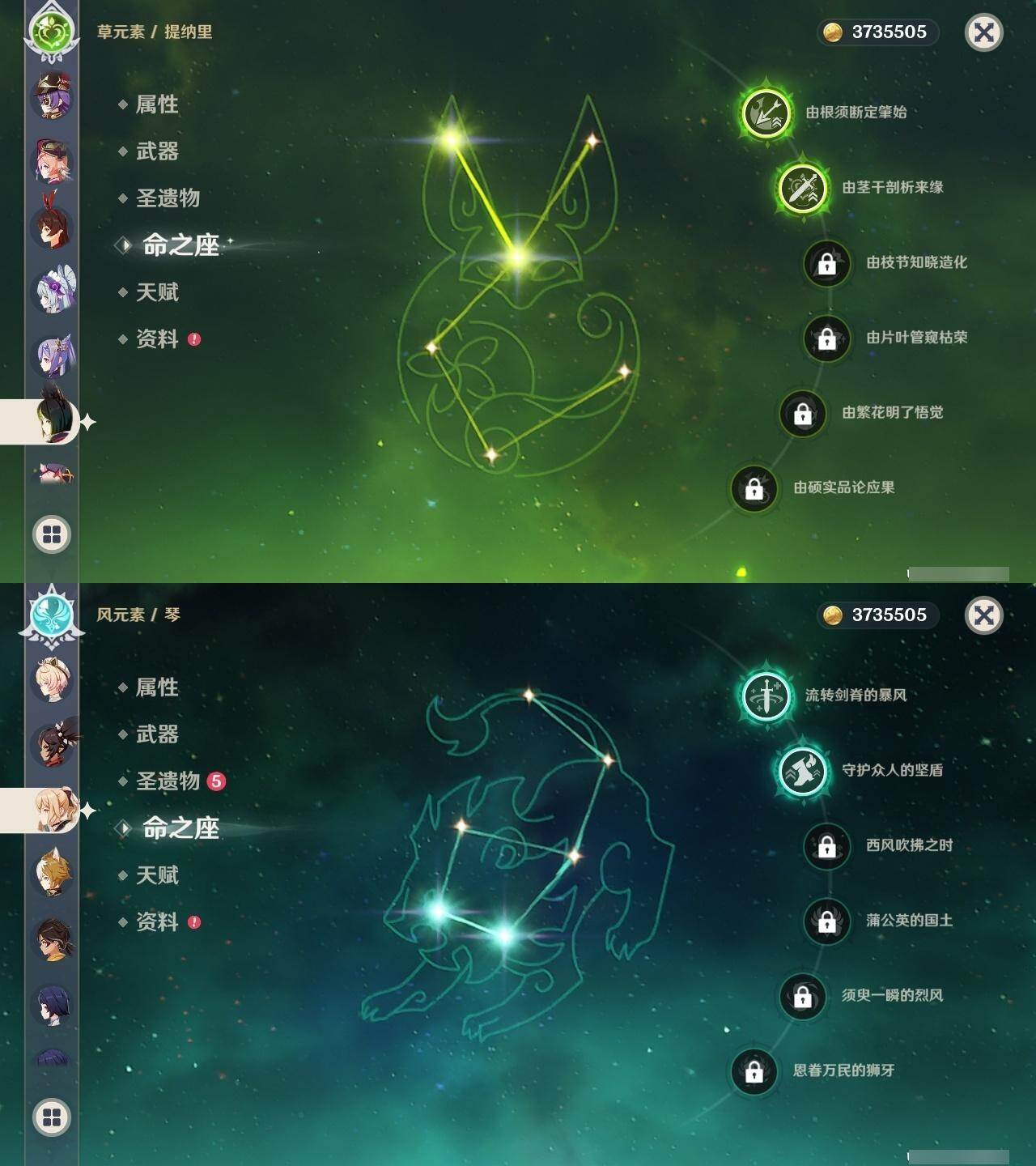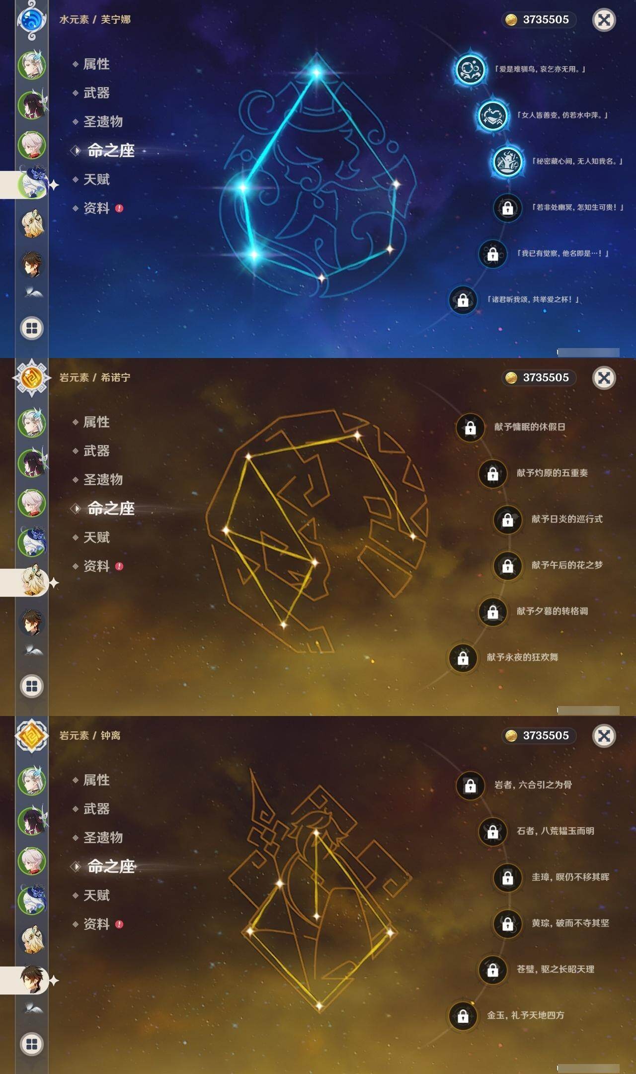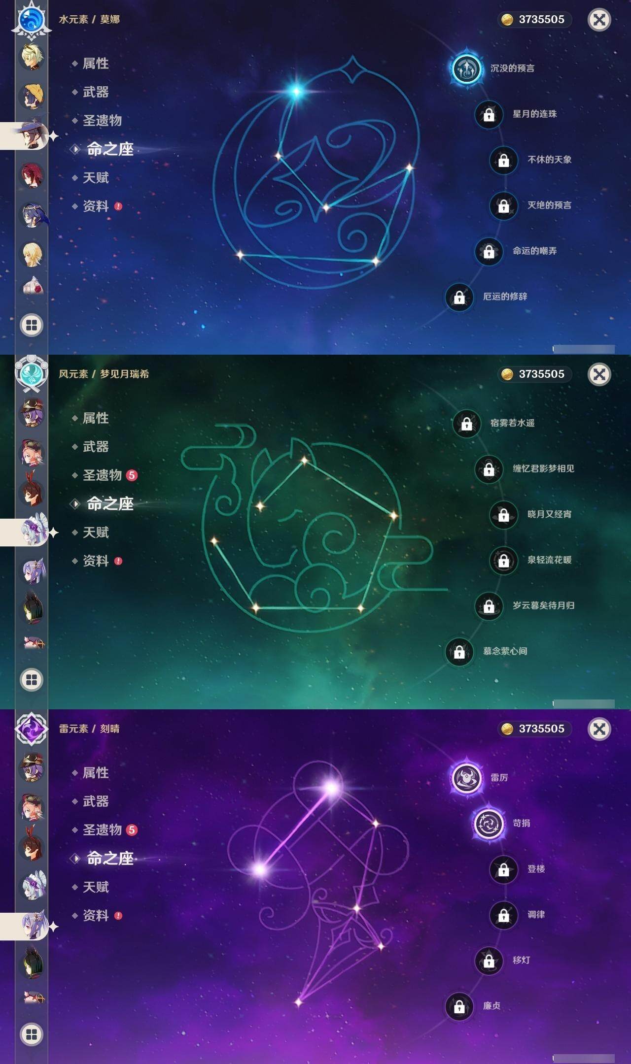 0命阿蕾奇诺,3命芙宁娜,0命那维莱特,2命提纳里,0命枫原万叶,0命钟离,1命胡桃,2命刻晴,2命琴,1命莫娜,0命希诺宁,0命玛拉妮,0命梦见月瑞希,0命哥伦比娅,精1赤月之形,精1天空之翼,精1天空之卷,精1狼的末路