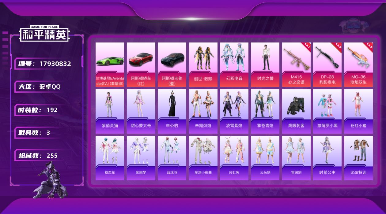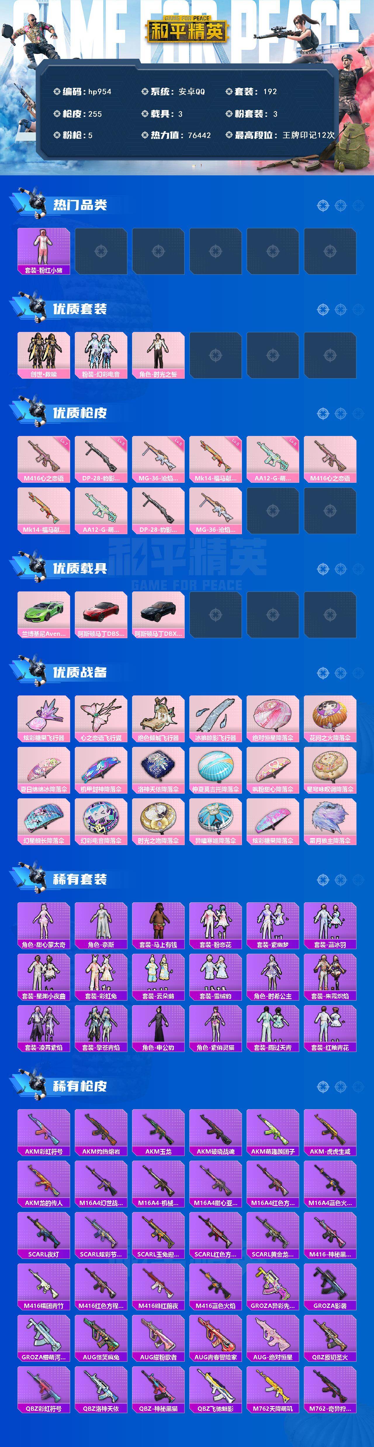 [17930832]安卓 手Q-3粉装-5特效枪-3载具-4粉色飞行器-76442热力值-12王牌印记-192套装-255枪皮 【热门品类】:套装-粉红小猪 【粉色套装】:套装-创世·救赎,粉装-幻彩电音,角色-时光之誓 【粉色枪皮等级】:M416-心之恋语(七级),Mk14-福马献瑞(五级),AA12-G-萌骑幻想(五级),DP-28-豹影疾电(五级),MG-36-沧焰双生(五级) 【粉色载具】:兰博基尼Aventador SVJ(翡翠绿),阿斯顿马丁DBS(红),阿斯顿马丁DBX(蓝) 【粉色枪皮】:M416-心之恋语,Mk14-福马献瑞,AA12-G-萌骑幻想,DP-28-豹影疾电,MG-36-沧焰双生 【粉色飞行器】:炫彩糖果飞行器,心之恋语飞行翼,绝色倾城飞行器,冰狼掠影飞行器 【粉色降落伞】:绝对恒星降落伞,花间之火降落伞,夏日绵绵冰降落伞,机甲封神降落伞,洛神天依降落伞,仲夏莫吉托降落伞,飒粉甜心降落伞,星穹咏叹调降落伞,幻星舰长降落伞,幻彩电音降落伞,时光之吻降落伞,异瞳寒姬降落伞,炫彩糖果降落伞,霜月狼主降落伞 【稀有套装】:角色-甜心蒙太奇,套装-雪国风尚,套装-炫彩糖果,角色-奈斯,套装-马上有钱,套装-粉恋花,套装-紫幽梦,套装-蓝冰羽,套装-星渊小夜曲,套装-彩虹兔,套装-云朵鹅,套装-雪绒豹,角色-时希公主,套装-朱霞炽焰,套装-凌霄紫焰,套装-擎苍青焰,角色-申公豹,角色-紫俏灵猫,套装-雨过天青,套装-红釉青花 【稀有枪皮】:AUG-冰晶雪宝,AKM-彩虹符号,AKM-灼热熔岩,AKM-玉龙,AKM-破晓战魂,AKM-萌趣颜团子,AKM-虎虎生威,AKM-龙的传人,M16A4-幻世战舞者,M16A4-机械英豪,M16A4-甜心亚梦,M16A4-红色方程式,M16A4-蓝色火焰,SCAR-L-夜灯,SCAR-L-炫彩节奏,SCAR-L-玉兔迎春,SCAR-L-红色方程式,SCAR-L-黄金龙骨,M416-神秘黑猫,M416-糯团青竹,M416-红色方程式,M416-绯红前夜,M416-蓝色火焰,GROZA-异彩先驱,GROZA-影袭,GROZA-懵萌河马,AUG-怪笑疯兔,AUG-耀粉歌者,AUG-青春冒险家,AUG-绝对恒星,QBZ-原初圣火,QBZ-彩虹符号,QBZ-洛神天依,QBZ-神秘黑猫,QBZ-飞驰魅影,M762-天降萌叽,M762-奇异狩猎