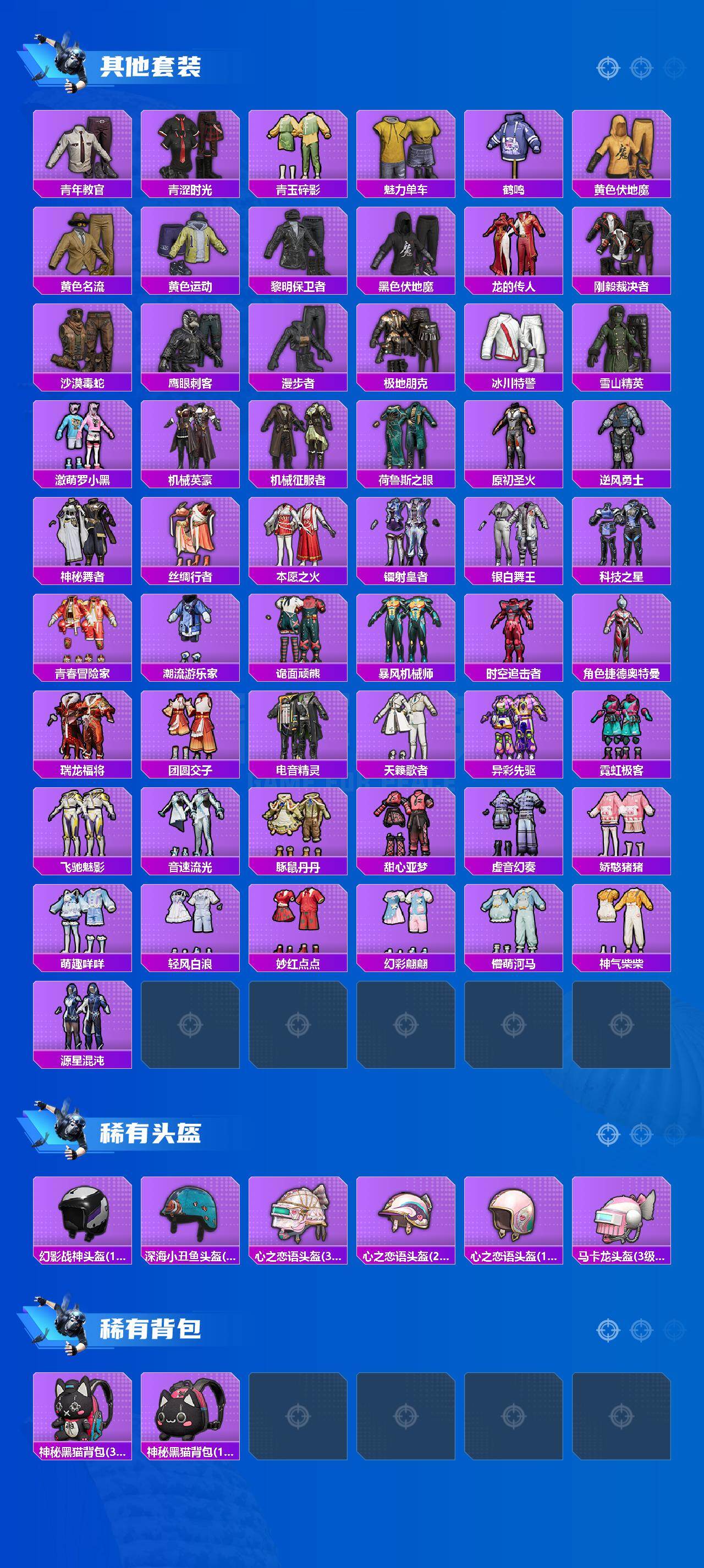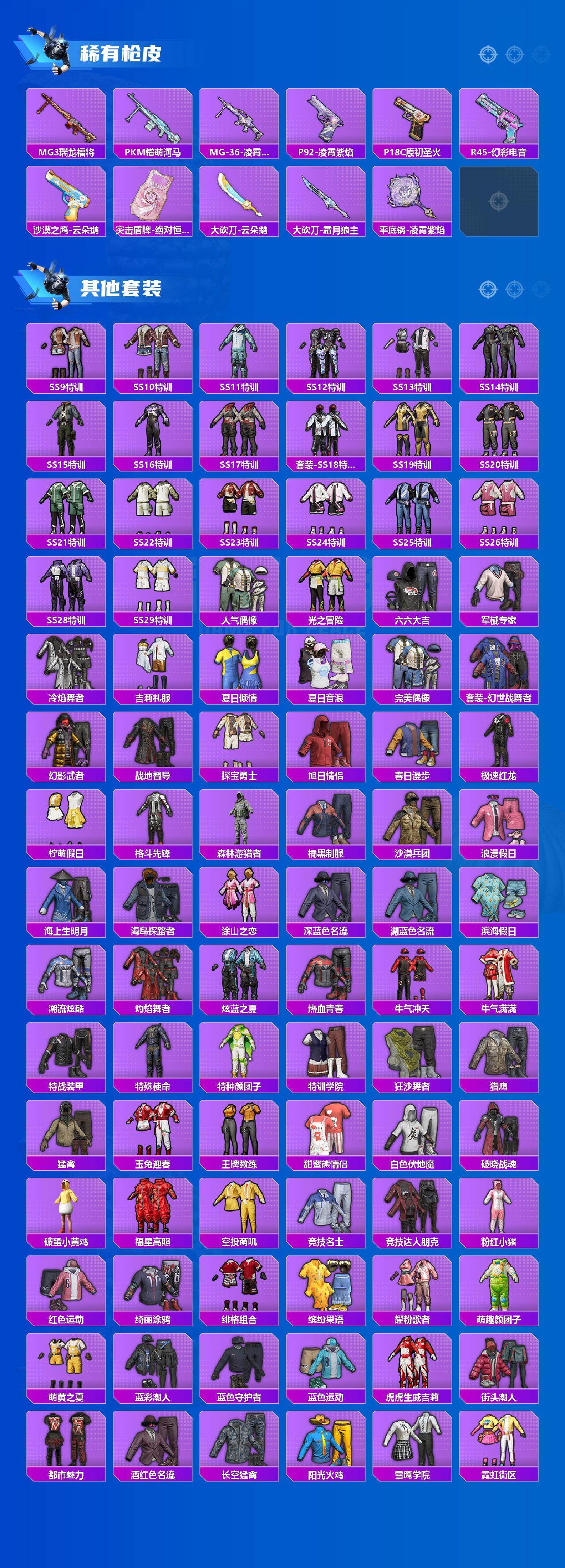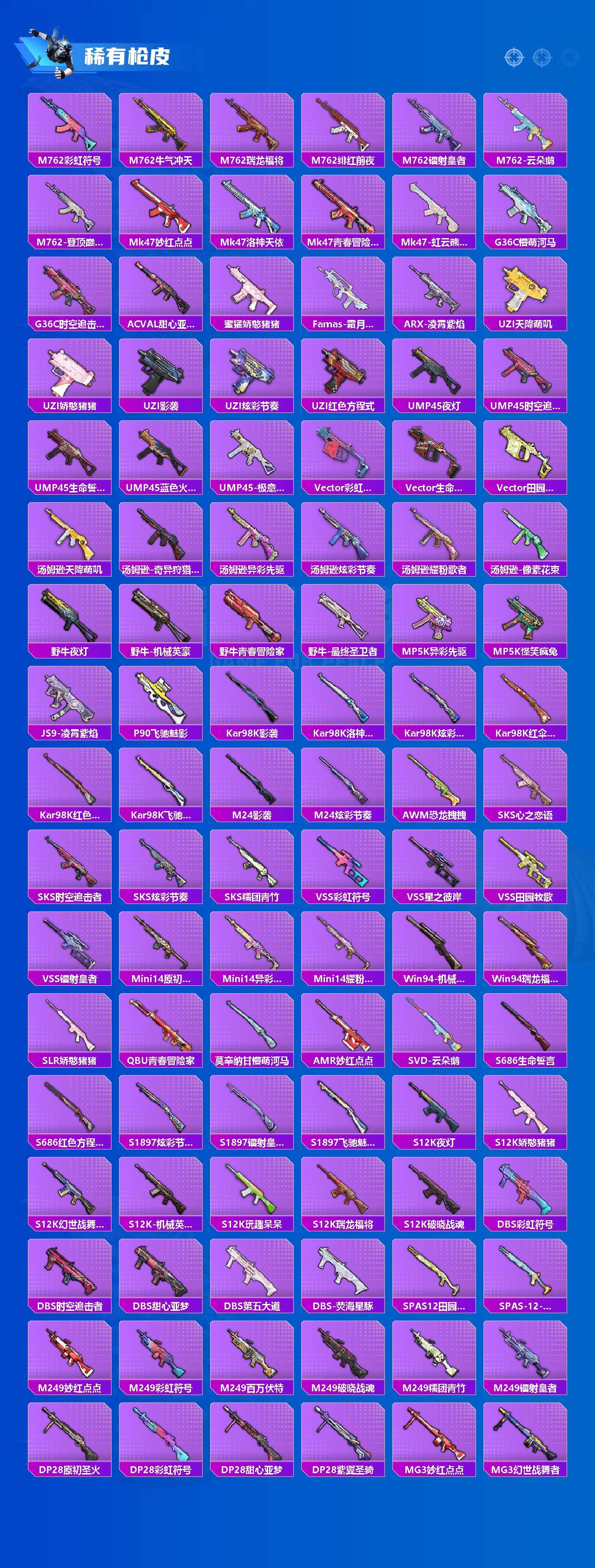 【稀有枪皮】:AUG-冰晶雪宝,AKM-彩虹符号,AKM-灼热熔岩,AKM-玉龙,AKM-破晓战魂,AKM-萌趣颜团子,AKM-虎虎生威,AKM-龙的传人,M16A4-幻世战舞者,M16A4-机械英豪,M16A4-甜心亚梦,M16A4-红色方程式,M16A4-蓝色火焰,SCAR-L-夜灯,SCAR-L-炫彩节奏,SCAR-L-玉兔迎春,SCAR-L-红色方程式,SCAR-L-黄金龙骨,M416-神秘黑猫,M416-糯团青竹,M416-红色方程式,M416-绯红前夜,M416-蓝色火焰,GROZA-异彩先驱,GROZA-影袭,GROZA-懵萌河马,AUG-怪笑疯兔,AUG-耀粉歌者,AUG-青春冒险家,AUG-绝对恒星,QBZ-原初圣火,QBZ-彩虹符号,QBZ-洛神天依,QBZ-神秘黑猫,QBZ-飞驰魅影,M762-天降萌叽,M762-奇异狩猎
