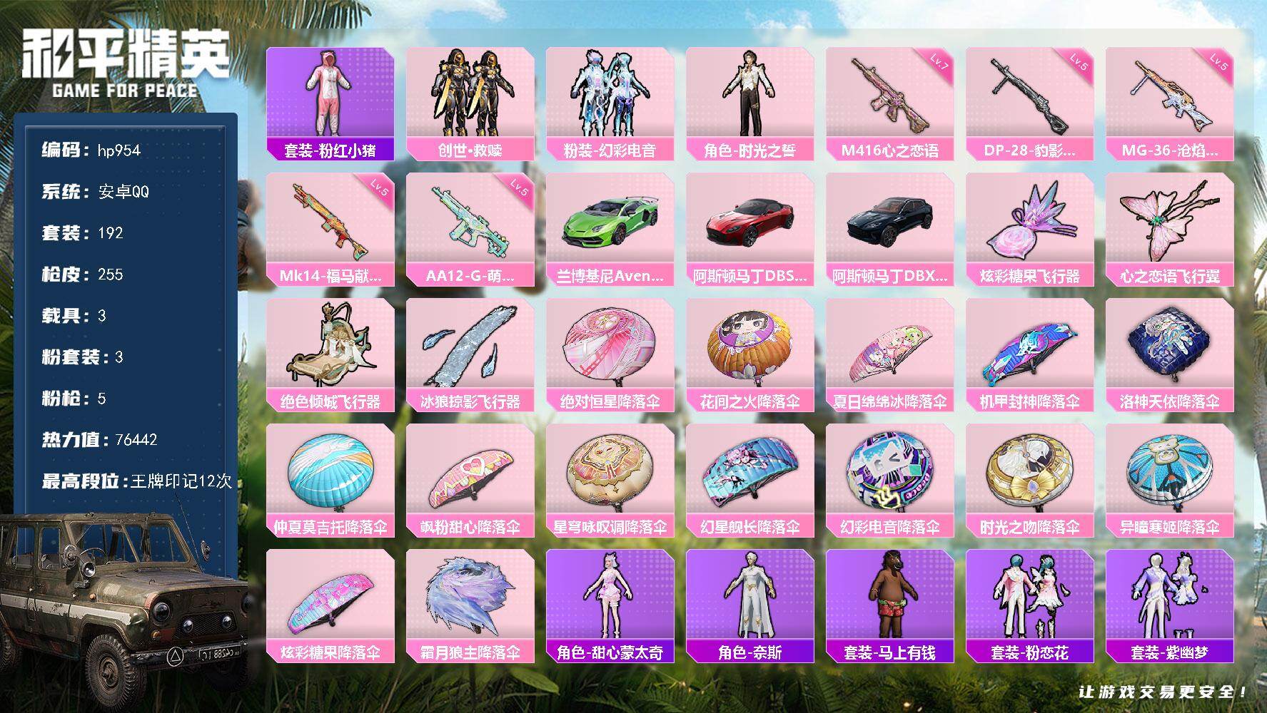 [17930832]安卓 手Q-3粉装-5特效枪-3载具-4粉色飞行器-76442热力值-12王牌印记-192套装-255枪皮