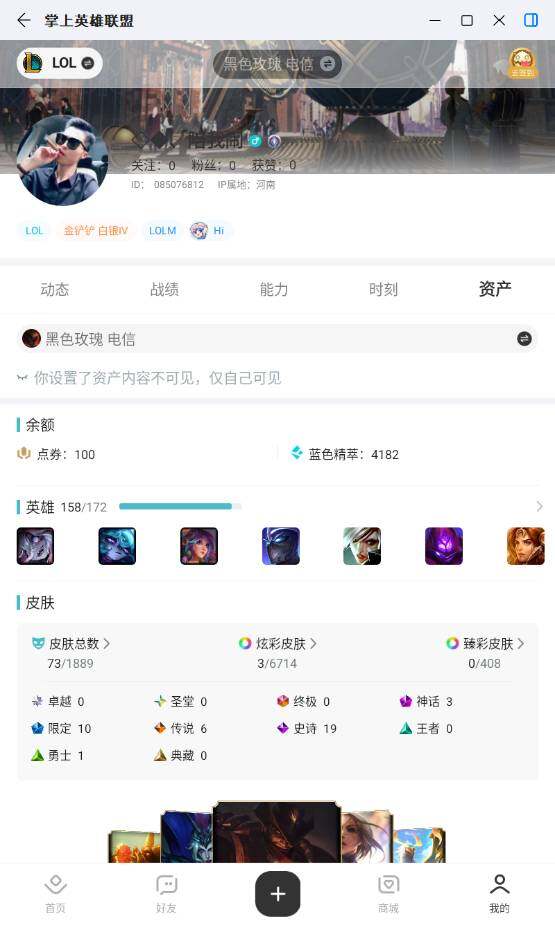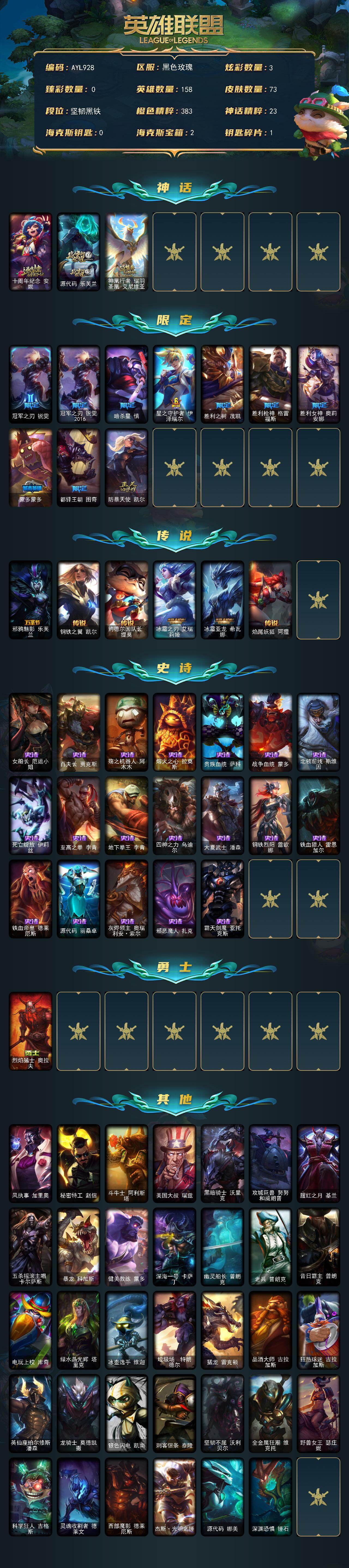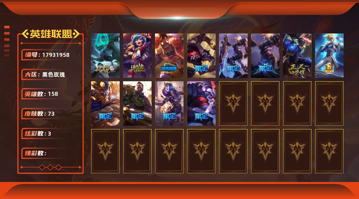 [17931958]未定级段位-158英雄-73皮肤-3炫彩-0终极-3神话-10限定-6传说-19史诗