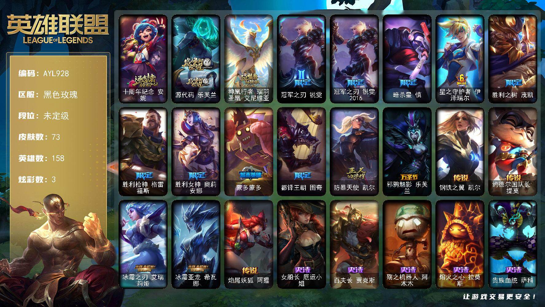 [17931958]未定级段位-158英雄-73皮肤-3炫彩-0终极-3神话-10限定-6传说-19史诗 【神话皮肤】:十周年纪念安妮,源代码乐芙兰,神凰行者瑞羽圣凰艾尼维亚 【限定皮肤】:冠军之刃锐雯,冠军之刃锐雯2016,暗杀星慎,星之守护者伊泽瑞尔,胜利之树茂凯,胜利枪神格雷福斯,胜利女神奥莉安娜,蒙多蒙多,都铎王朝图奇,防暴天使凯尔 【传说皮肤】:邪鸦魅影乐芙兰,钢铁之翼凯尔,约德尔国队长提莫,冰霜之刃艾瑞莉娅,冰霜亚龙希瓦娜,焰尾妖狐阿狸 【史诗皮肤】:女船长厄运小姐,百夫长贾克斯,殇之机器人阿木木,熔火之心拉莫斯,贵族血统萨科,战争血统蒙多,北领前线斯维因,死亡绽放伊莉丝,至高之拳李青,地下拳王李青,四神之力乌迪尔,大夏武士潘森,钢铁烈阳蕾欧娜,铁血猎人雷恩加尔,铁血帝皇德莱厄斯,源代码丽桑卓,灰烬领主奥瑞利安索尔,邪恶魔人扎克,霸天剑魔亚托克斯 【勇士皮肤】:烈焰猛士奥拉夫 【其他皮肤】:风执事加里奥,秘密特工赵信,斗牛士阿利斯塔,美国大叔瑞兹,黑暗骑士沃里克,攻城巨兽努努和威朗普,腥红之月基兰,五杀摇滚主唱卡尔萨斯,暴龙科加斯,健美教练蒙多,深海一号卡萨丁,幽灵船长普朗克,老兵普朗克,昔日霸主普朗克,电玩上校库奇,绿水晶光辉塔里克,冰壶选手维迦,垃圾场特朗德尔,猛龙雷克顿,品酒大师古拉加斯,狂热球迷古拉加斯,英仙座珀尔修斯潘森,龙骑士莫德凯撒,银色闪电凯南,刺客信条泰隆,坚韧不屈沃利贝尔,全金属狂潮维克托,野兽女王瑟庄妮,科学狂人吉格斯,灵魂收割者德莱文,西部魔影德莱厄斯,杰斯光明之锤,源代码娜美,深渊恐惧锤石