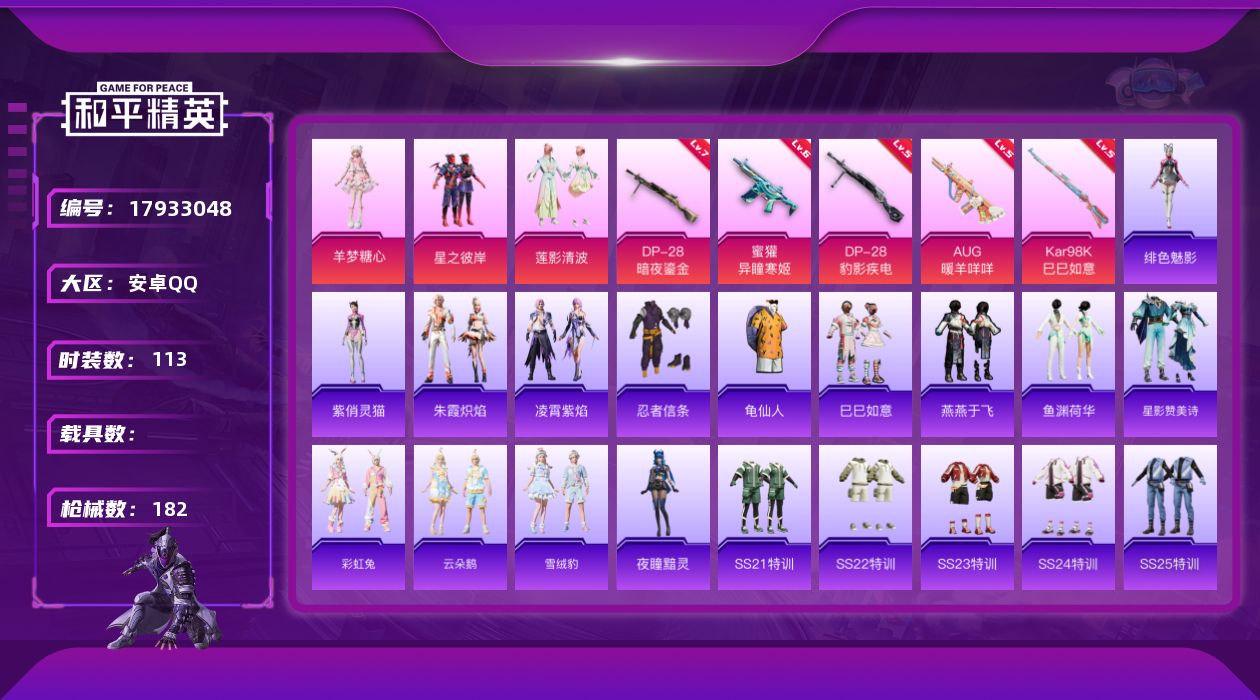 [17933048]安卓 手Q-3粉装-7特效枪-0载具-1粉色飞行器-47341热力值-2王牌印记-113套装-182枪皮 【热门品类】:套装-忍者信条,套装-龟仙人 【粉色套装】:粉装-星之彼岸,粉装-莲影清波,角色-羊梦糖心 【粉色枪皮等级】:AUG-暖羊咩咩(五级),蜜獾-异瞳寒姬(六级),ACE32-萌骑漫游(四级),Kar98K-巳巳如意(五级),Mk14-福马献瑞(三级),DP-28-暗夜鎏金(七级),DP-28-豹影疾电(五级) 【粉色枪皮】:AUG-暖羊咩咩,蜜獾-异瞳寒姬,ACE32-萌骑漫游,Kar98K-巳巳如意,Mk14-福马献瑞,DP-28-暗夜鎏金,DP-28-豹影疾电 【粉色飞行器】:极意拳锋飞行器