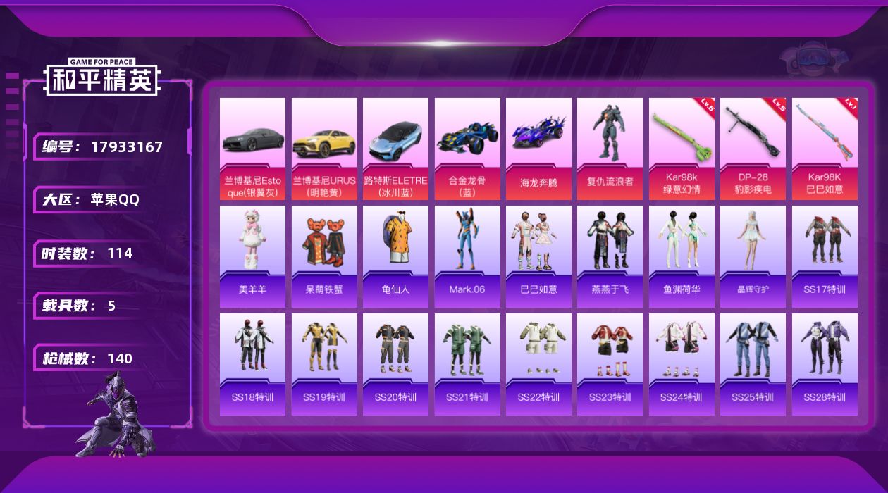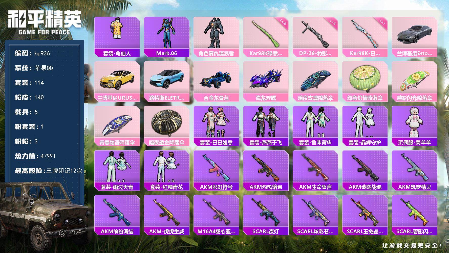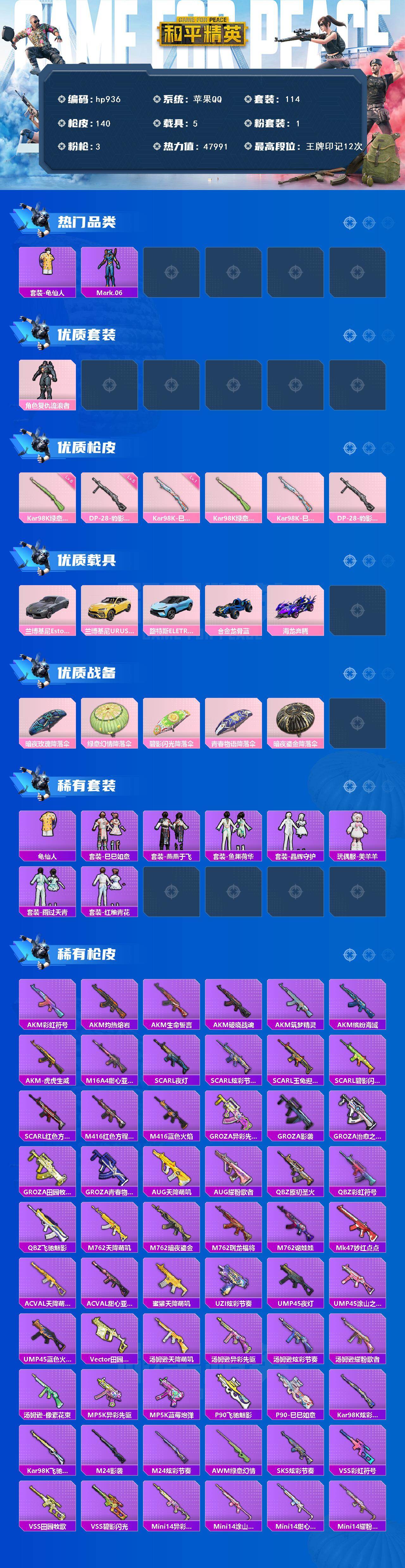 [17933167]苹果 手Q-1粉装-3特效枪-5载具-0粉色飞行器-47991热力值-12王牌印记-114套装-140枪皮 【热门品类】:套装-龟仙人,角色-Mark.06 【粉色套装】:角色-复仇流浪者 【粉色枪皮等级】:Kar98K-绿意幻情(六级),Kar98K-巳巳如意(一级),DP-28-豹影疾电(五级) 【粉色载具】:兰博基尼Estoque(银翼灰),兰博基尼URUS(明艳黄),路特斯ELETRE(冰川蓝),合金龙骨(蓝),海龙奔腾 【粉色枪皮】:Kar98K-绿意幻情,Kar98K-巳巳如意,DP-28-豹影疾电 【粉色降落伞】:暗夜玫瑰降落伞,绿意幻情降落伞,碧影闪光降落伞,青春物语降落伞,暗夜鎏金降落伞 【稀有套装】:套装-龟仙人,套装-巳巳如意,套装-燕燕于飞,套装-鱼渊荷华,套装-晶辉守护,玩偶服-美羊羊,套装-雨过天青,套装-红釉青花 【稀有枪皮】:AKM-彩虹符号,AKM-灼热熔岩,AKM-生命誓言,AKM-破晓战魂,AKM-筑梦精灵,AKM-缤纷海域,AKM-虎虎生威,M16A4-甜心亚梦,SCAR-L-夜灯,SCAR-L-炫彩节奏,SCAR-L-玉兔迎春,SCAR-L-碧影闪光,SCAR-L-红色方程式,M416-红色方程式,M416-蓝色火焰,GROZA-异彩先驱,GROZA-影袭,GROZA-治愈之星,GROZA-田园牧歌,GROZA-青春物语,AUG-天降萌叽,AUG-耀粉歌者,QBZ-原初圣火,QBZ-彩虹符号,QBZ-飞驰魅影,M762-天降萌叽,M762-暗夜鎏金,M762-瑞龙福将,M762-诡娃娃,Mk47-妙红点点,AC-VAL-天降萌叽,AC-VAL-甜心亚梦,蜜獾-天降萌叽,UZI-炫彩节奏,UMP45-夜灯,UMP45-涂山之恋,UMP45-蓝色火焰,Vector-田园牧歌,汤姆逊-天降萌叽,汤姆逊-异彩先驱,汤姆逊-炫彩节奏,汤姆逊-耀粉歌者,汤姆逊-像素花束,MP5K-异彩先驱,MP5K-蓝莓炮弹,P90-飞驰魅影,P90-巳巳如意,Kar98K-炫彩节奏,Kar98K-飞驰魅影,M24-影袭,M24-炫彩节奏,AWM-绿意幻情,SKS-炫彩节奏,VSS-彩虹符号,VSS-田园牧歌,VSS-碧影闪光,Mini14-异彩先驱,Mini14-涂山之恋,Mini14-甜心娃娃,Mini14-耀粉歌者,Mk14-暗星紫秘,Win9