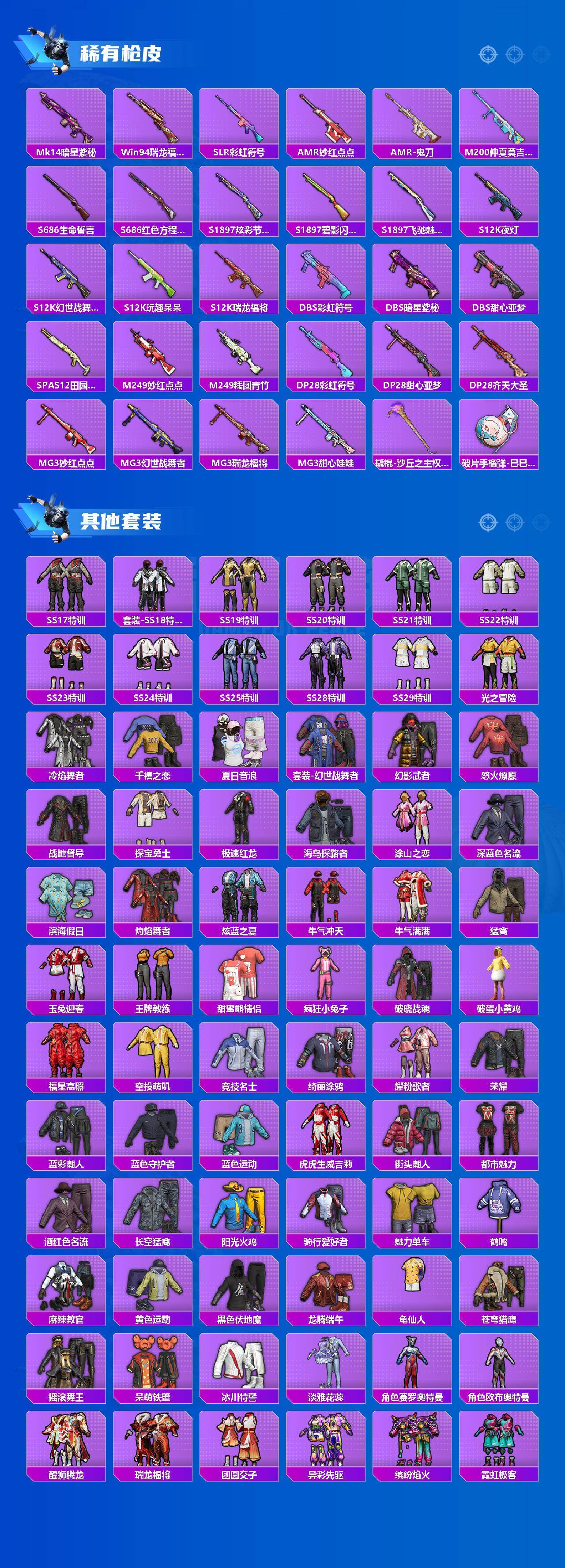【稀有枪皮】:AKM-彩虹符号,AKM-灼热熔岩,AKM-生命誓言,AKM-破晓战魂,AKM-筑梦精灵,AKM-缤纷海域,AKM-虎虎生威,M16A4-甜心亚梦,SCAR-L-夜灯,SCAR-L-炫彩节奏,SCAR-L-玉兔迎春,SCAR-L-碧影闪光,SCAR-L-红色方程式,M416-红色方程式,M416-蓝色火焰,GROZA-异彩先驱,GROZA-影袭,GROZA-治愈之星,GROZA-田园牧歌,GROZA-青春物语,AUG-天降萌叽,AUG-耀粉歌者,QBZ-原初圣火,QBZ-彩虹符号,QBZ-飞驰魅影,M762-天降萌叽,M762-暗夜鎏金,M762-瑞龙福将,M762-诡娃娃,Mk47-妙红点点,AC-VAL-天降萌叽,AC-VAL-甜心亚梦,蜜獾-天降萌叽,UZI-炫彩节奏,UMP45-夜灯,UMP45-涂山之恋,UMP45-蓝色火焰,Vector-田园牧歌,汤姆逊-天降萌叽,汤姆逊-异彩先驱,汤姆逊-炫彩节奏,汤姆逊-耀粉歌者,汤姆逊-像素花束,MP5K-异彩先驱,MP5K-蓝莓炮弹,P90-飞驰魅影,P90-巳巳如意,Kar98K-炫彩节奏,Kar98K-飞驰魅影,M24-影袭,M24-炫彩节奏,AWM-绿意幻情,SKS-炫彩节奏,VSS-彩虹符号,VSS-田园牧歌,VSS-碧影闪光,Mini14-异彩先驱,Mini14-涂山之恋,Mini14-甜心娃娃,Mini14-耀粉歌者,Mk14-暗星紫秘,Win9