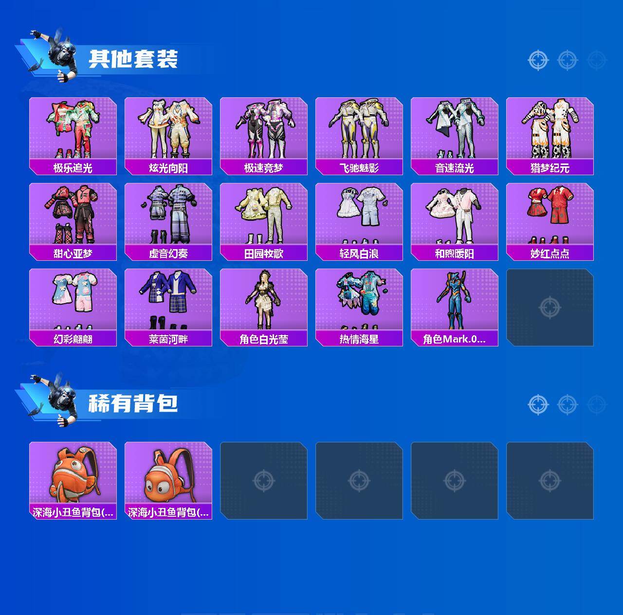- [12885467]安卓 手Q-10粉装-4特效枪-2载具-0粉色飞行器-87792热力值-9王牌印记-220套装-241枪皮 【热门品类】:套装-浪漫天命,套装-深海小丑鱼,套装-小丑鱼,套装-奇异狩猎者,角色-军刀雅典娜,套装-龟仙人,套装-粉红小猪,套装-红红火火,小恶魔头饰 【粉色载具】:阿斯顿马丁DBS(红),玛莎拉蒂Ghibli(粉) 【粉色套装】:粉装-深海曼妙,粉装-幻影战神,粉装-银刃赛罗,粉装-冰霜白皇,角色-洛天依,粉装-花影阑珊,粉装-炙焰牛王,粉装-星夜魔法师,角色-复仇流浪者,角色-绯穹魔姬 【粉色枪皮等级】:M416-五爪金龙(七级),AUG-暖羊咩咩(五级),Kar98K-巳巳如意(五级),SKS-碧影闪光(七级) 【粉色枪皮】:M416-五爪金龙,AUG-暖羊咩咩,Kar98K-巳巳如意,SKS-碧影闪光 【粉色降落伞】:深海曼妙降落伞,百万伏特降落伞,银河战甲降落伞,至尊龙雀降落伞,梦幻火箭降落伞,荧光虫舞降落伞,阿狸红降落伞,夏日绵绵冰降落伞,银刃赛罗降落伞,香水柠檬降落伞,星之彼岸降落伞,烈焰拳霸降落伞,枪炮玫瑰降落伞,暗夜玫瑰降落伞,洛神天依降落伞,蓝莓炮弹降落伞,青春物语降落伞,恐龙拽拽降落伞,庄周梦蝶降落伞,橘柚倾心降落伞,筑梦精灵降落伞,圣光天使降落伞,环太平洋降落伞,千面幻镜降落伞,江南烟雨降落伞,霓虹漫游降落伞,幻彩电音降落伞 【稀有套装】:套装-龟仙人,套装-巳巳如意,套装-燕燕于飞,套装-鱼渊荷华,套装-彩虹兔,套装-云朵鹅,套装-雪绒豹,套装-蜜露汐语 【稀有枪皮】:AKM-夜灯,AKM-彩虹符号,AKM-星之彼岸,AKM-灼热熔岩,AKM-环太平洋,AKM-百万伏特,AKM-破晓战魂,AKM-筑梦精灵,AKM-萌趣颜团子,AKM-虎虎生威,AKM-阿狸红,AKM-霓虹街区,AKM-龙的传人,M16A4-幻世战舞者,M16A4-甜心亚梦,M16A4-蓝色火焰,M16A4-龙虾霸霸,SCAR-L-夜灯,SCAR-L-炫彩节奏,SCAR-L-玉兔迎春,SCAR-L-红色方程式,SCAR-L-黄金龙骨,M416-夜灯,M416-梨园星光,M416-滑板小狐,M416-糯团青竹,M416-紫翼圣骑,M416-红色方程式,M416-蓝色火焰,GROZA-异彩先驱,GROZA-彩虹符号,GROZA-恐龙拽拽,GROZA-治愈之星,GROZ