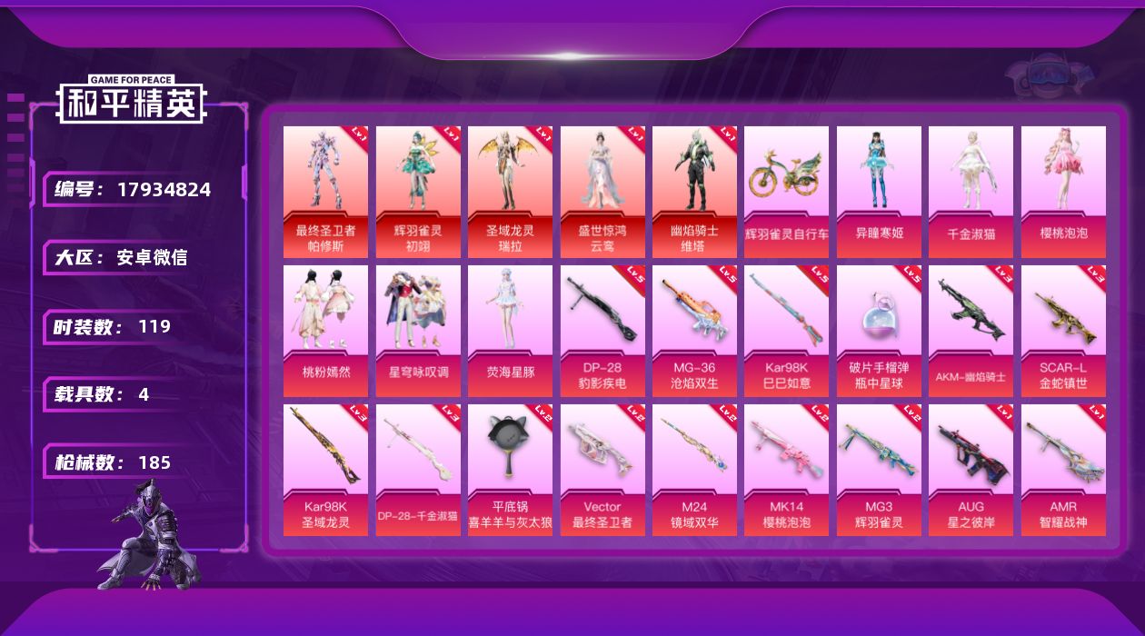 [17934824]9套5级红装随意切换 有二次可直接换帮!!【特价出售/店主推荐】安卓 微信-9神装-8粉装-21特效枪-4载具-17粉色飞行器-83619热力值-7王牌印记-119套装-185枪皮