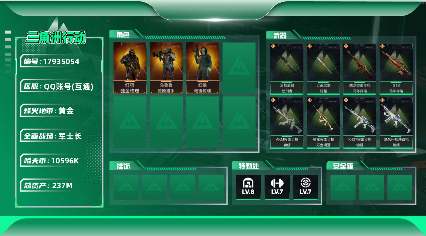 [17935054]237m总资产-10596k哈夫币-60烽火等级-黄金-50战场等级-军士长 【干员外观】:红狼-蚀金玫瑰,红狼-电锯惊魂,乌鲁鲁-荒原猎手,蛊-不羁人生 【近战皮肤】:近战-暗星,近战-处刑者1级,近战-黑鹰 【传说外观】:M4A1突击步枪-蚀金玫瑰,M4A1突击步枪-阿米娅,AKM突击步枪-锦绣,ASh-12战斗步枪-鹅鸭杀,AUG突击步枪-悠然茶歇,AK-12突击步枪-特斯拉线圈,SCAR-H战斗步枪-启航,G3战斗步枪-骑士,CAR-15突击步枪-阿米娅,腾龙突击步枪-捞点薯条,腾龙突击步枪-马年祥瑞,腾龙突击步枪-万金泪冠,K437突击步枪-锦绣,KC17突击步枪-电锯惊魂,MK47突击步枪-悠然茶歇,MK47突击步枪-暗星,UZI冲锋枪-特斯拉线圈,UZI冲锋枪-悠然茶歇,SMG-45冲锋枪-骑士,SMG-45冲锋枪-锦绣,SR-3M紧凑突击步枪-特斯拉线圈,SR-3M紧凑突击步枪-暗星,勇士冲锋枪-能天使-午夜邮差,勇士冲锋枪-万金泪冠,QCQ171冲锋枪-鹅鸭杀,QJB201轻机枪-鹅鸭杀,M14射手步枪-蛮荒,M14射手步枪-缄花,SKS射手步枪-骑士,SR-25射手步枪-缄花,AWM狙击步枪-捞点薯条,AWM狙击步枪-万金泪冠,.357左轮-缄花,G18-马年祥瑞,93R-捞点薯条,复合弓-黑·天际线 【史诗外观】:AKM突击步枪-林中猎手,AKM突击步枪-逆战未来,QBZ95-1突击步枪-曙光,K416突击步枪-冬日风情,K416突击步枪-腊梅,K416突击步枪-阿萨拉特攻,AUG突击步枪-蝮蛇,SG552突击步枪-深海恐惧,SG552突击步枪-哈夫克警备,SCAR-H战斗步枪-囚徒,G3战斗步枪-哈夫克警备,腾龙突击步枪-猎鳄行动,K437突击步枪-丛影谍踪,MP5冲锋枪-深海恐惧,MP5冲锋枪-战术竞备,P90冲锋枪-紧急戒备,Vector冲锋枪-阿萨拉文明,Vector冲锋枪-猎鳄行动,SMG-45冲锋枪-阿萨拉特攻,SR-3M紧凑突击步枪-战术竞备,SR-3M紧凑突击步枪-开工大吉,勇士冲锋枪-深海恐惧,勇士冲锋枪-工业狂潮,勇士冲锋枪-丛影谍踪,MP7冲锋枪-六套之力,M1014霰弹枪-林中猎手,S12K霰弹枪-曙光,PKM通用机枪-蝮蛇,PKM通用机枪-阿萨拉特攻,M249轻机枪-丛影谍踪,M250通用机枪-囚徒,QJB201轻机