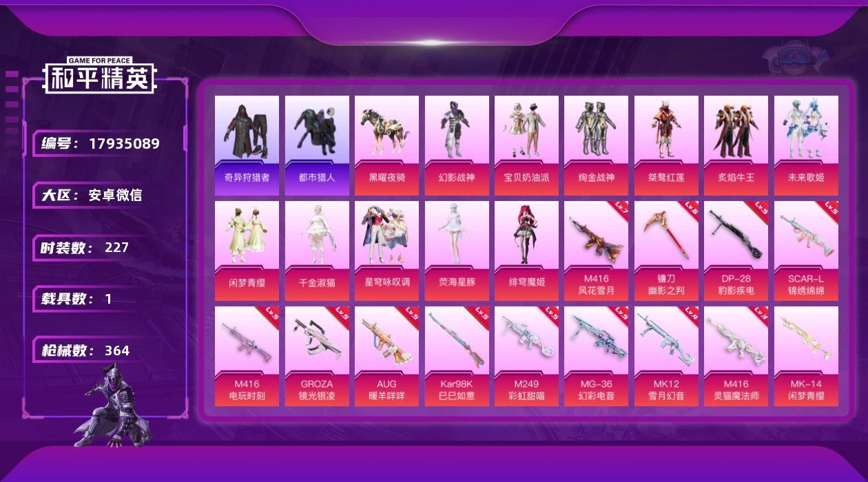 - [13153074]安卓 手Q-1粉装-8特效枪-0载具-0粉色飞行器-30091热力值-4王牌印记-91套装-103枪皮 【热门品类】:套装-浪漫天命,套装-龟仙人,熔岩游骑兵面罩,熔岩游骑兵连帽夹克 【粉色套装】:角色-荧海星豚 【粉色枪皮等级】:SCAR-L-锦绣绵绵(五级),M416-电玩时刻(五级),GROZA-镜光银凌(五级),AUG-暖羊咩咩(五级),UMP45-量子极限(五级),汤姆逊-热量炸弹(五级),Kar98K-巳巳如意(五级),MG-36-幻彩电音(五级) 【粉色枪皮】:SCAR-L-锦绣绵绵,M416-电玩时刻,GROZA-镜光银凌,AUG-暖羊咩咩,UMP45-量子极限,汤姆逊-热量炸弹,Kar98K-巳巳如意,MG-36-幻彩电音 【粉色降落伞】:创世·救赎降落伞,未来领航者降落伞,荧海星豚降落伞 【稀有套装】:套装-龟仙人,套装-巳巳如意,角色-光矢逐梦,套装-燕燕于飞,套装-鱼渊荷华,套装-星影赞美诗,套装-朱霞炽焰,套装-凌霄紫焰 【稀有枪皮】:AKM-彩虹符号,AKM-灼热熔岩,AKM-破晓战魂,AKM-龙的传人,SCAR-L-红色方程式,M416-糯团青竹,M416-红色方程式,M416-蓝色火焰,AUG-耀粉歌者,AUG-月影灵韵,M762-天降萌叽,M762-萌物绒绒,蜜獾-千面幻镜,蜜獾-天降萌叽,ARX-凌霄紫焰,UZI-啾咪啾咪,UZI-天降萌叽,UZI-红色方程式,UMP45-蓝色火焰,Vector-焰鹰斗篷,Vector-生命誓言,JS9-凌霄紫焰,P90-巳巳如意,Kar98K-红色方程式,M24-炫彩节奏,AWM-焰鹰斗篷,SKS-炫彩节奏,SKS-糯团青竹,Mini14-耀粉歌者,S686-彩虹符号,S686-生命誓言,S686-巳巳如意,S12K-破晓战魂,DBS-焰鹰斗篷,DBS-圣堂之誓,DBS-彩虹符号,DBS-暗星紫秘,DBS-月影灵韵,M249-彩虹符号,M249-破晓战魂,DP-28-焰鹰斗篷,MG-36-凌霄紫焰,P92-凌霄紫焰,短管霰弹-星穹咏叹调,TMP-9-江南烟雨,战术弩-江南烟雨,平底锅-凌霄紫焰,破片手榴弹-巳巳如意 【其他套装】:套装-SS18特训,套装-SS19特训,套装-SS20特训,套装-SS22特训,套装-SS23特训,套装-SS24特训,套装-SS25特训,套装-SS26特训,套装-