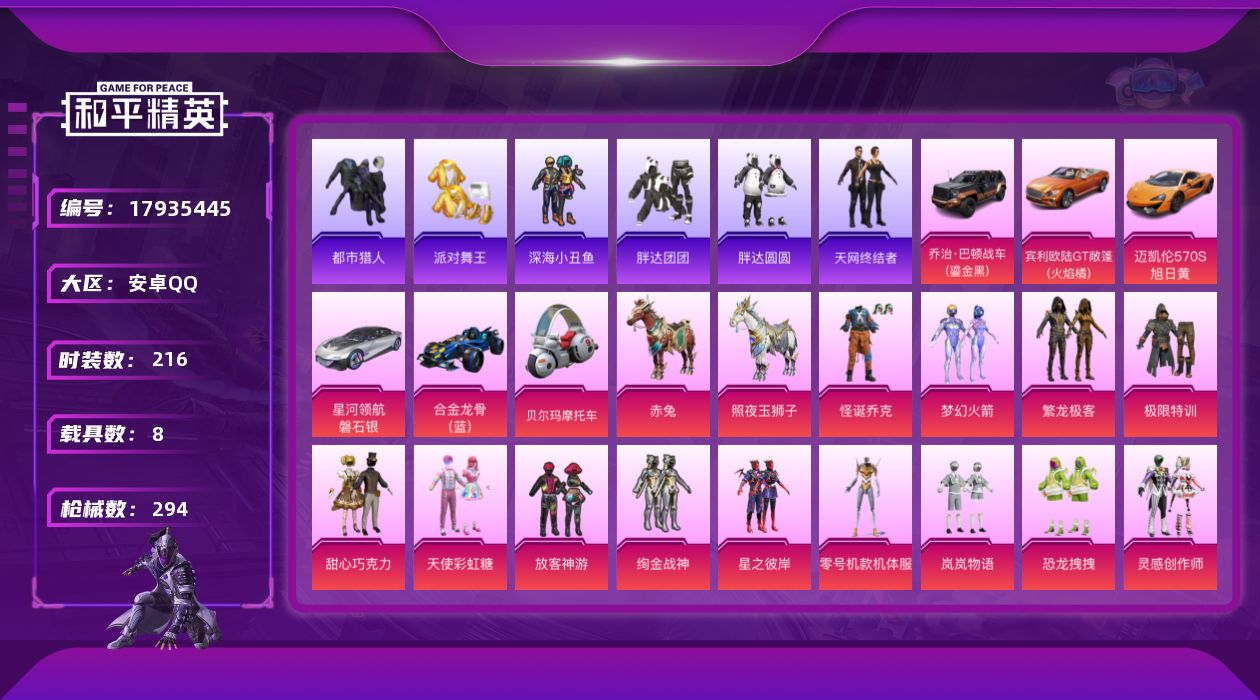 - PX_2093481- 苹果手Q-21王牌印记-有战神框-7粉装-8特效枪-1载具-101654热力值-245套装-306枪皮-4卓越印记-1传奇印记 【7粉装】,梦幻火箭,傲傲奶龙,未来领航者,筑梦精灵,向日葵,粉色回忆,绝色倾城 【8特效枪】AKM-炫紫旋律-7级 SCAR-L-锦绣绵绵-5级 M416-至情至圣-9级 M416-风花雪月-1级 AUG-暖羊咩咩-5级 Kar98K-巳巳如意-